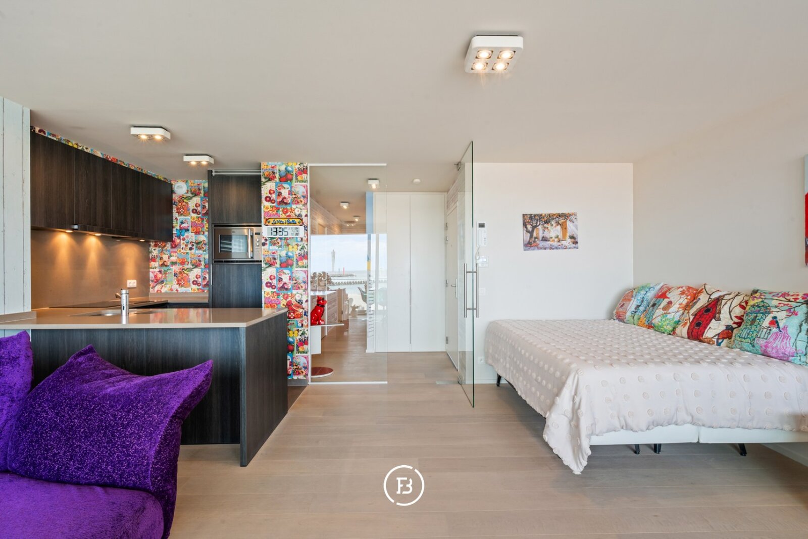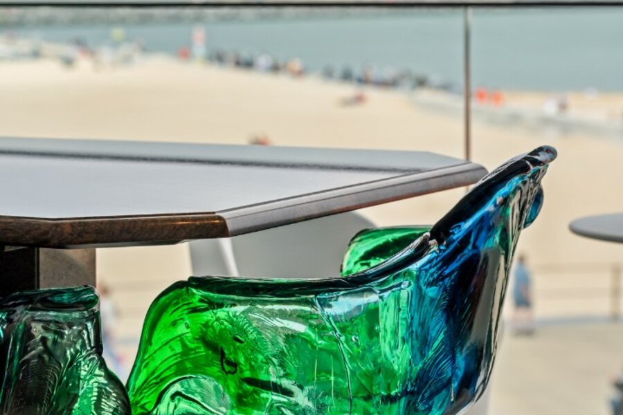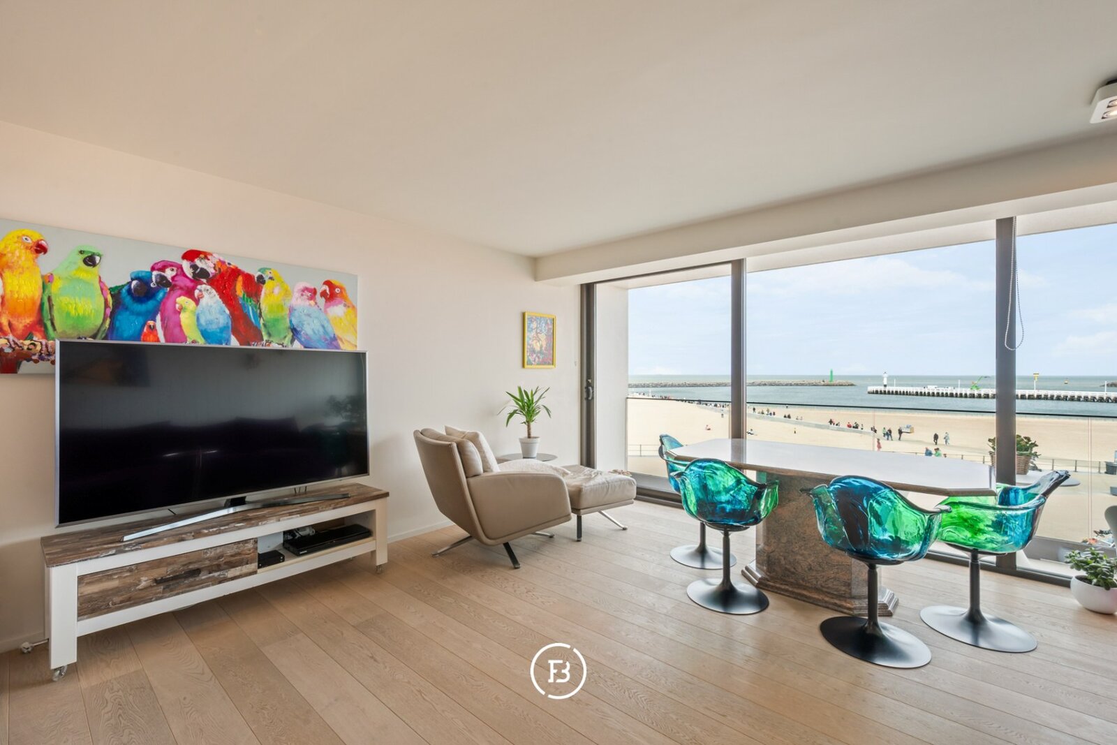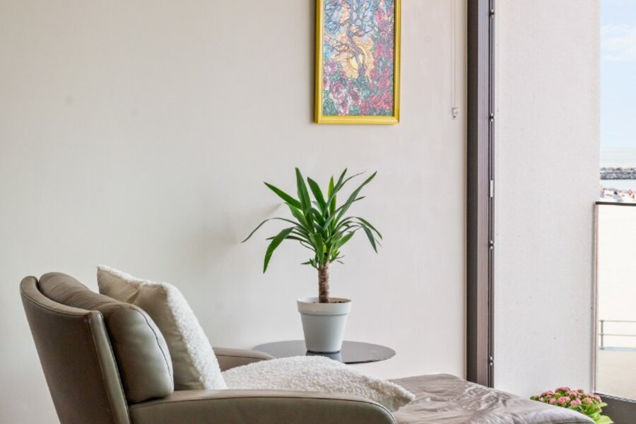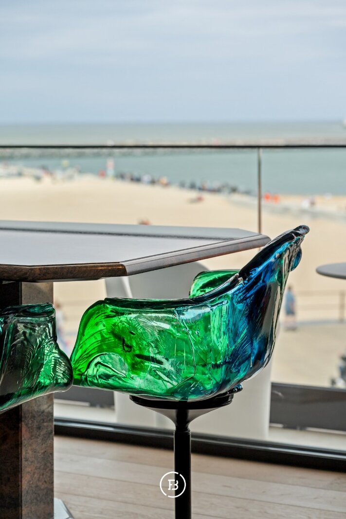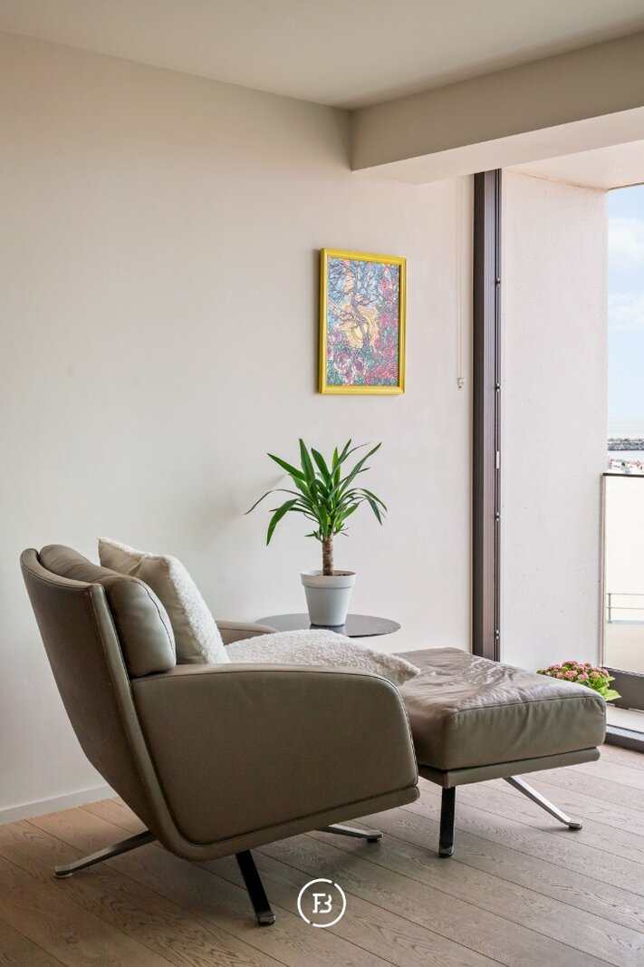 De leefruimte opent zich volledig naar het frontale zeezicht waar licht en horizon de architectuur bepalen. Grote raampartijen versterken het gevoel van openheid en laten de kustlijn naadloos deel uitmaken van het interieur. Het terras vormt een natuurlijk verlengstuk van de leefruimte en biedt een ononderbroken zicht op de zee en de levendige Promenade.
