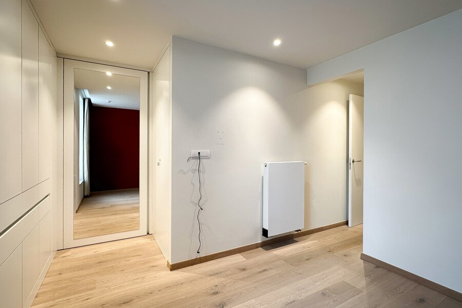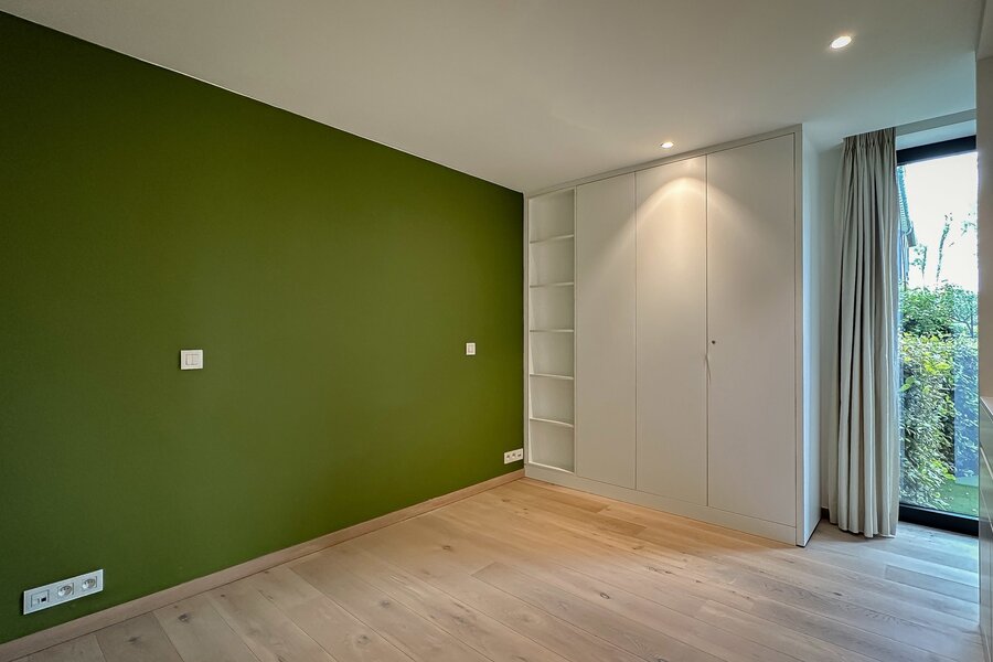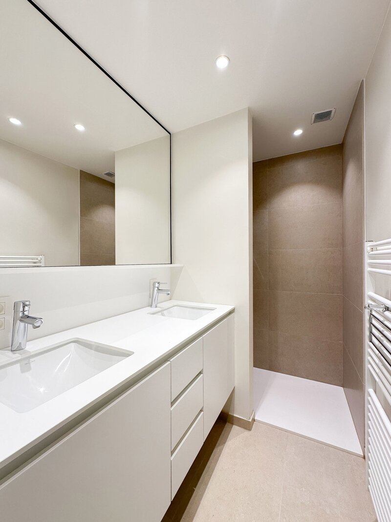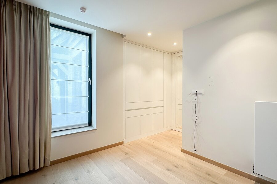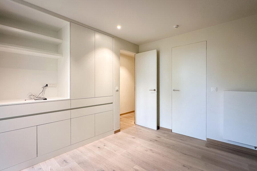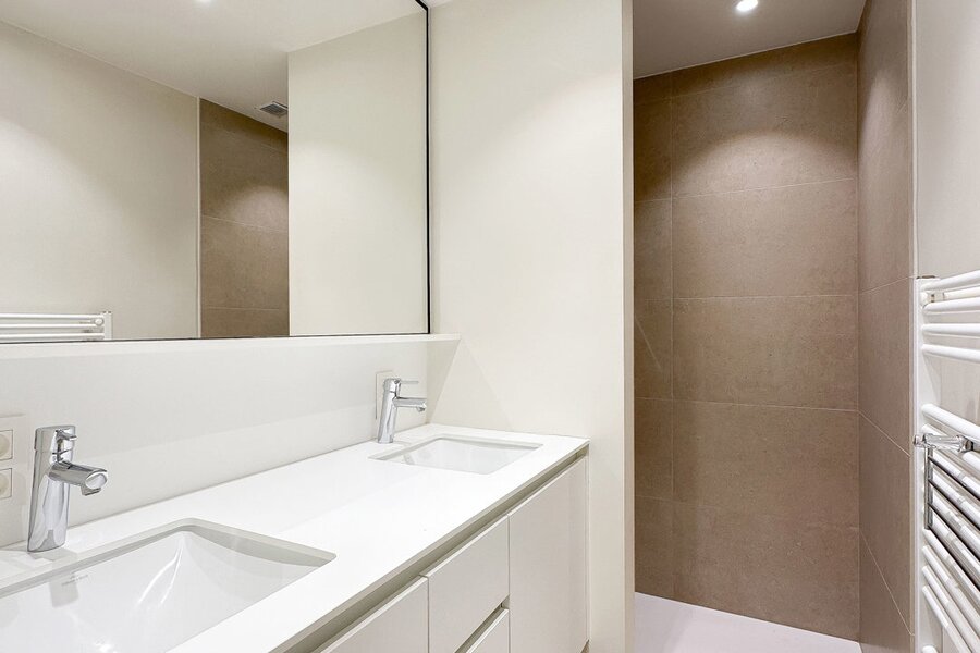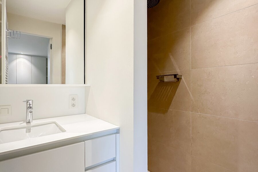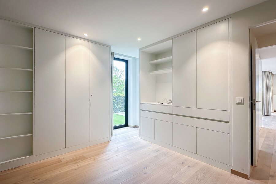Achteraan bevinden zich 2 volwaardige slaapkamers. De master bedroom beschikt over een eigen dressingruimte en een luxueus ingerichte badkamer met ruime douche en dubbele lavabo. De tweede slaapkamer beschikt eveneens over tal van ingemaakte kasten en een douchekamer met ruime douche en lavabo.