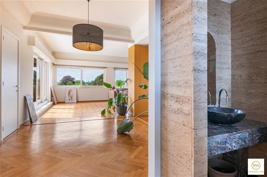 Dit zeldzaam en authentiek Art- Déco penthouse (ca 172 m² + ca 80 m² terrassen) vinden we terug in de befaamde residentie "Elsdonk" nov Léon Stijnen in de jaren 30 op korte afstand van de stad en nabij het groen van Fort IV en V en Middelheim. Dit instapklaar app. heeft een giga ZW-georiënteerd terras met vergezicht rondom. Ruime & lichte leefruimte op origineel visgraatparket, ingerichte open luxekeuken. Ruimte in overvloed voor nog een bureau, 2 ruime slaapkamers beide met toegang naar de badkamer met ligbad, wc en inloopdouche. Volledig op authentiek parket, gastentoilet en inkomhal op travertijn. Gemeenschappelijke tuin. Ca 350€ maandelijkse kosten (water, syndicus, onderhoud tuin + gebruik gemene delen inbegrepen). Prachtig en zeldzaam object. Voor kenners!