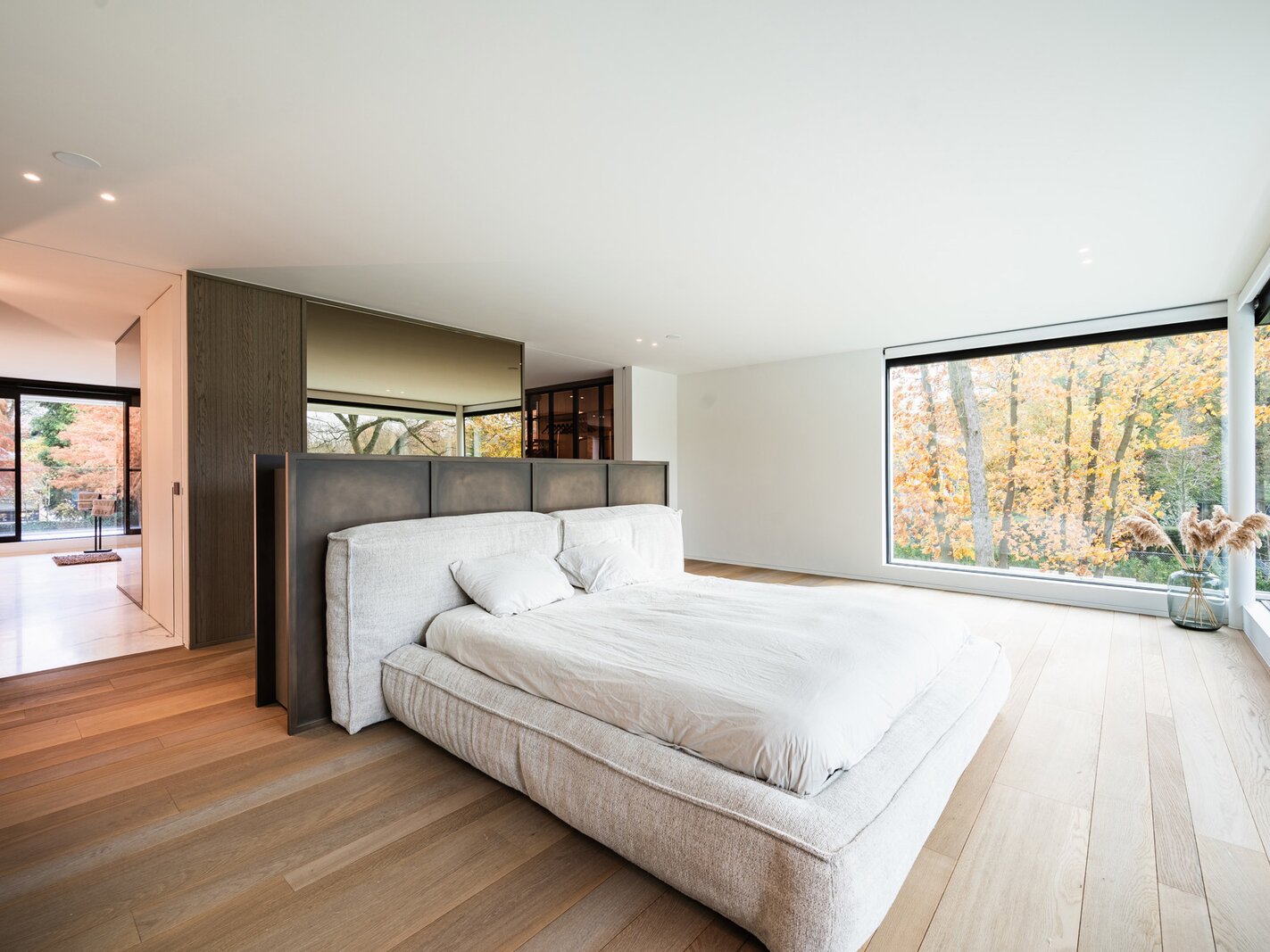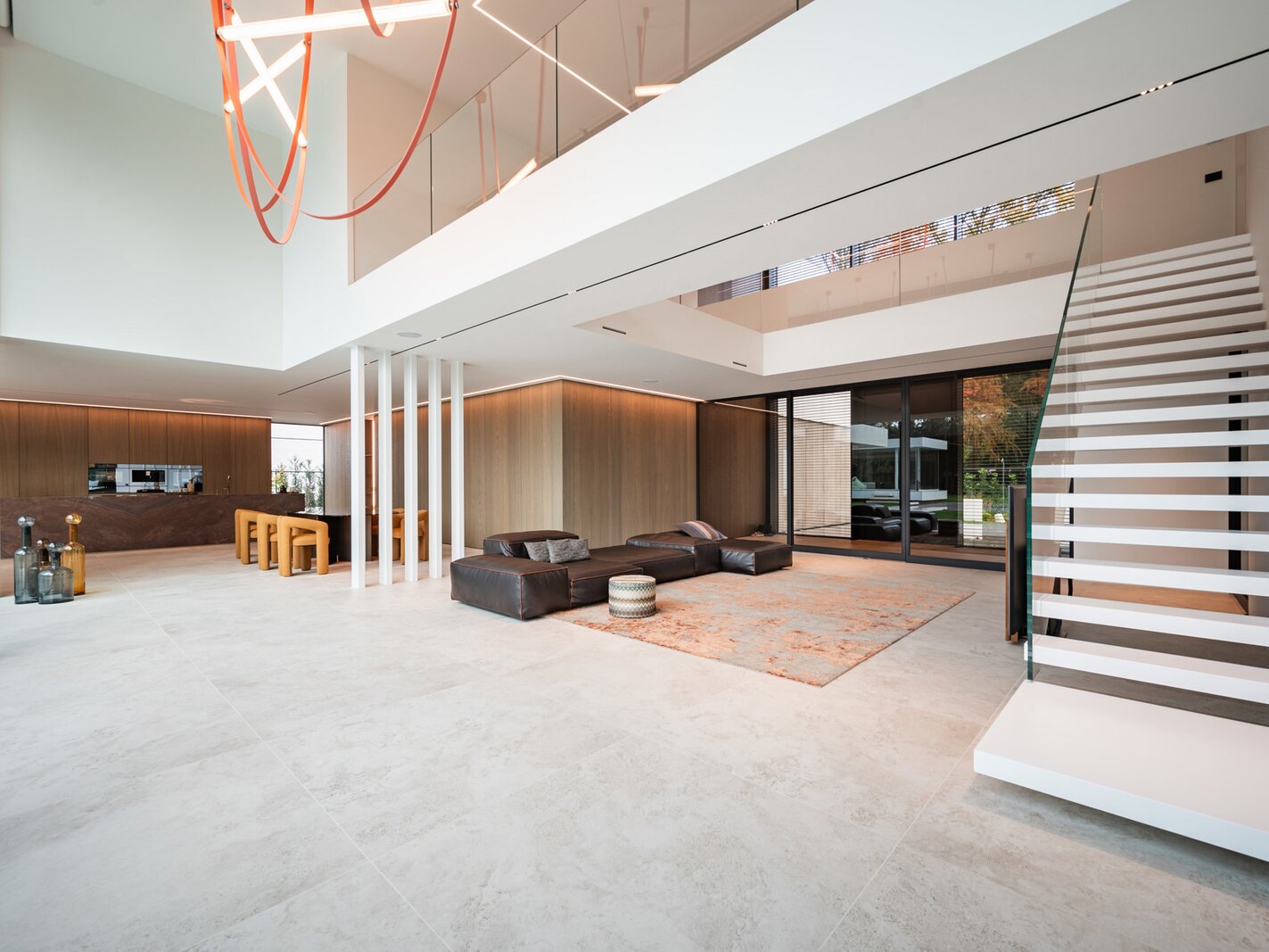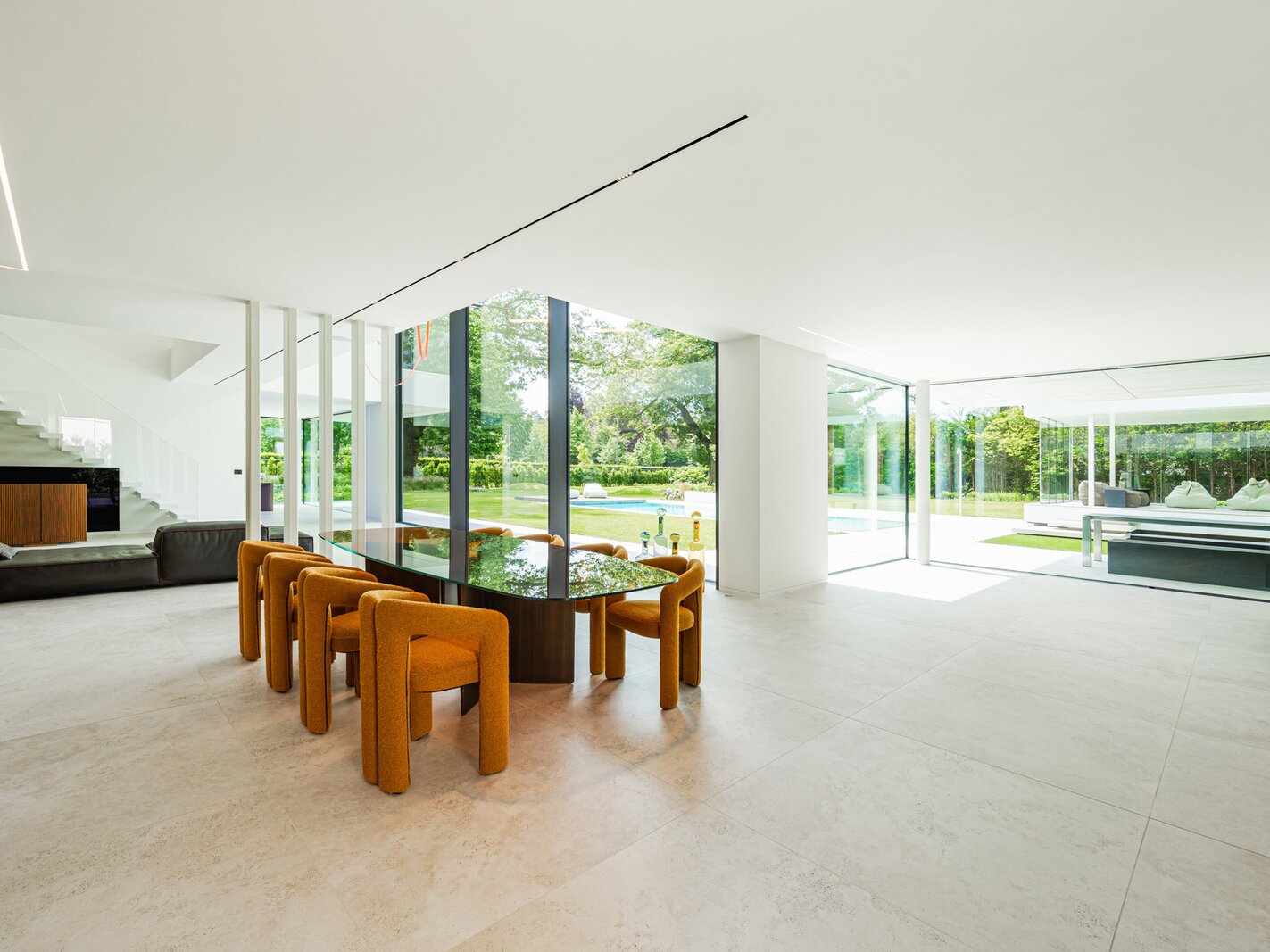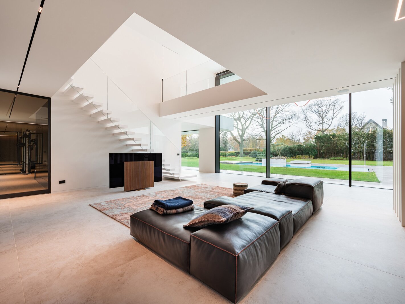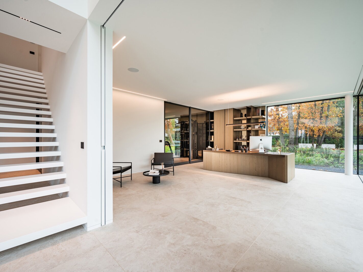 Ontworpen met aandacht voor detail, straalt de villa moderne elegantie uit en is voorzien van hoogwaardige materialen en geavanceerde technologieën. Lichtrijke ruime inkom en vestiaire met grote ramen, waardoor een naadloze verbinding ontstaat tussen binnen en buiten. De leefruimte met open keuken en het kantoor bieden een panoramisch uitzicht en toegang op de tuin. De moderne open keuken met een centraal eiland, vormt het hart van de woning en is uitgerust met state-of-the-art apparatuur. Grenzend aan het kantoor bevindt zich een fitnessruimte. De zwevende open trap met vide naar de eerste verdieping is een architectonisch hoogstandje. Op de bovenverdieping bevindt zich de master suite met een eigen dressing en badkamer. Drie extra kamers, elk met een eigen badkamer. Het overdekt terras en glazen ontspanningsruimte voorzien is voorzien van schuiframen.