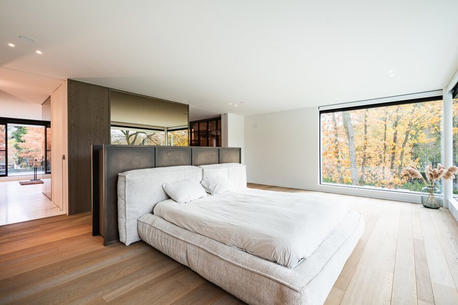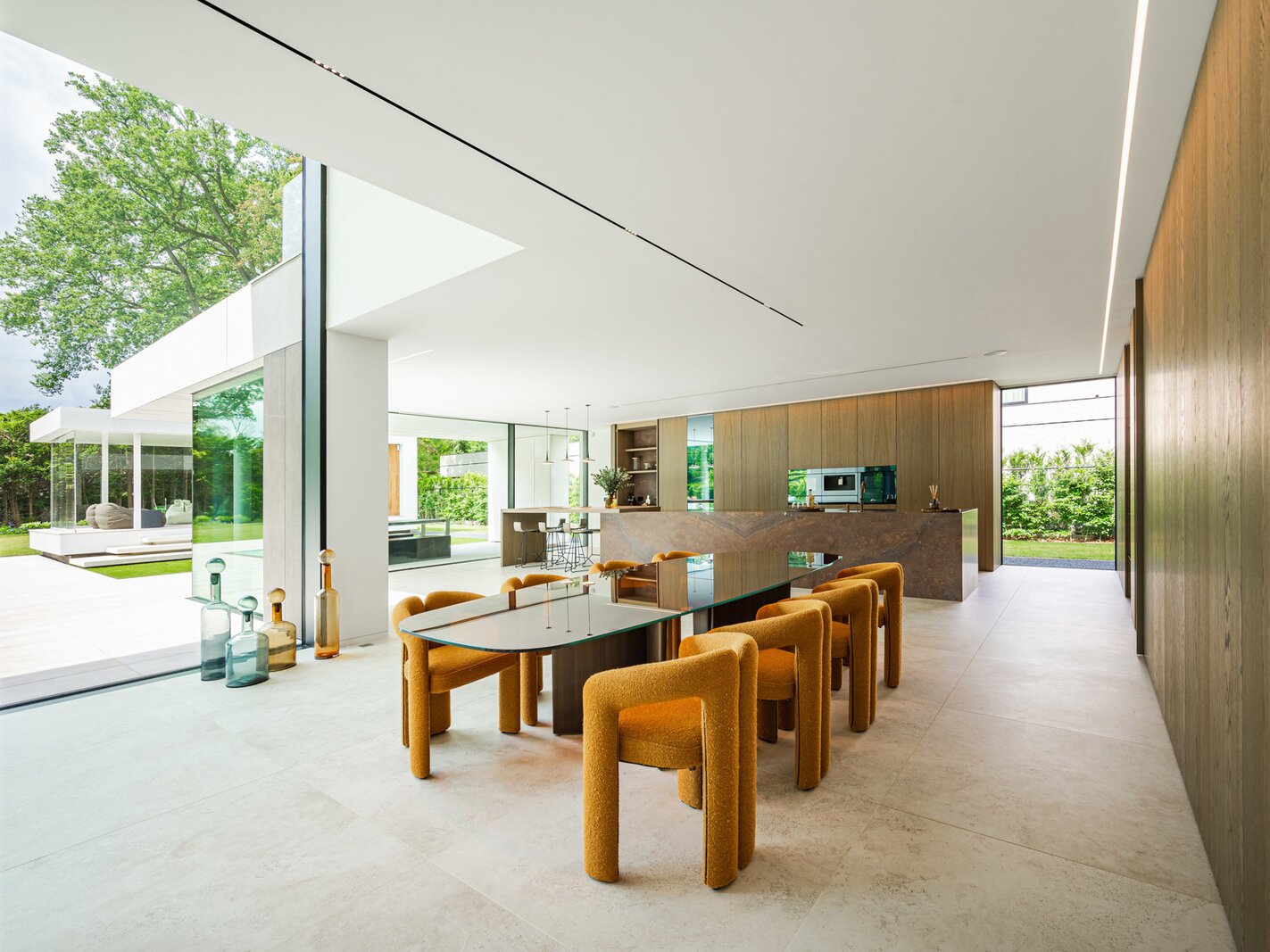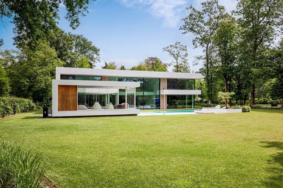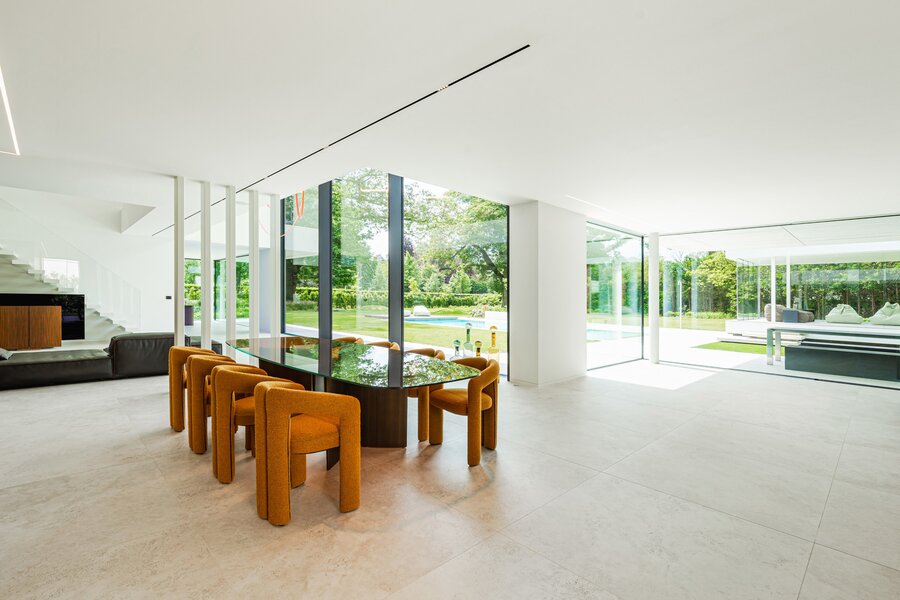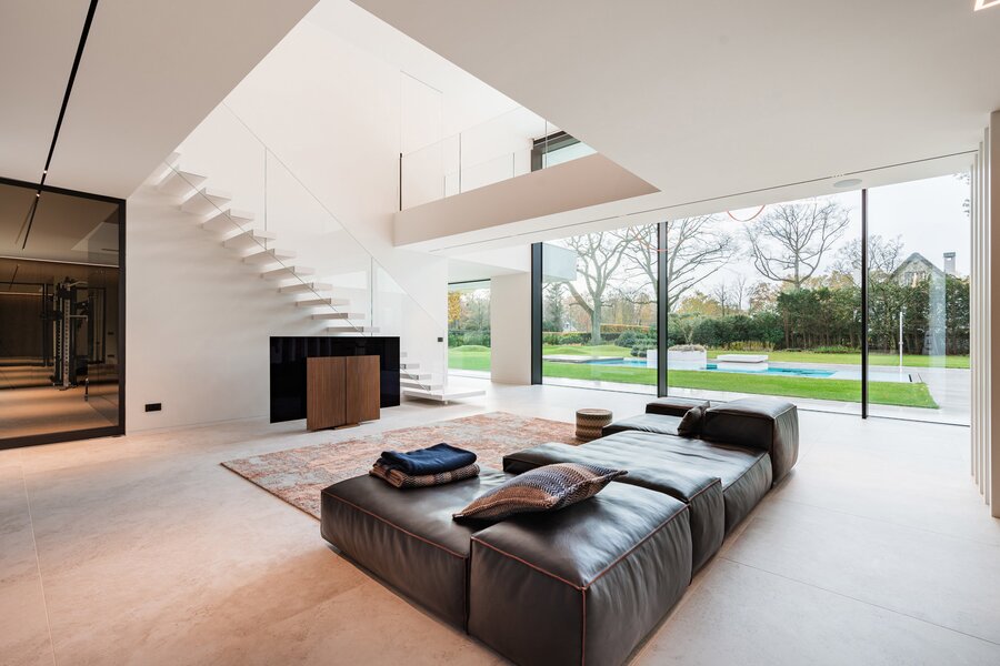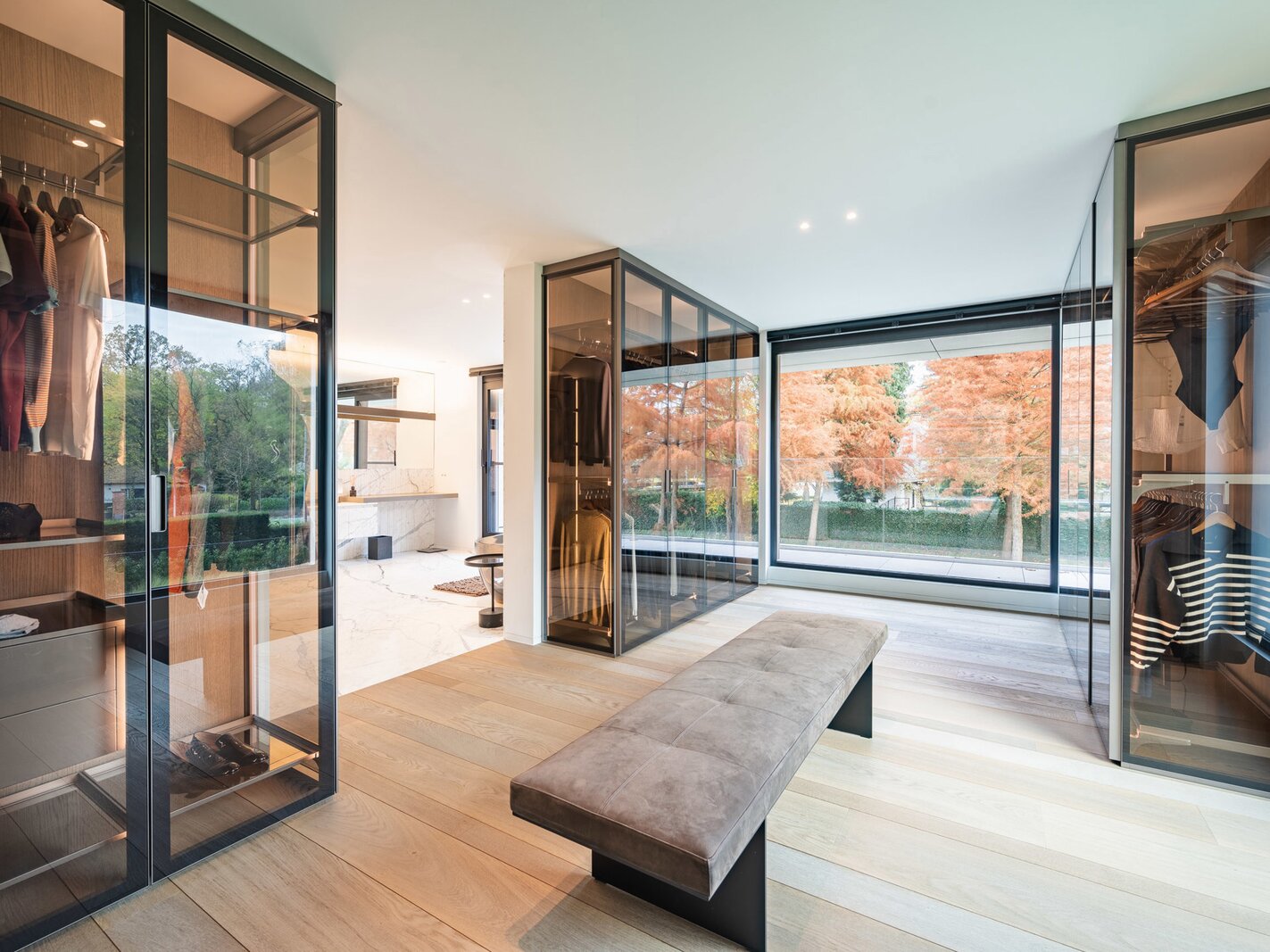 Ontworpen met aandacht voor detail, straalt de villa moderne elegantie uit en is voorzien van hoogwaardige materialen en geavanceerde technologieën. Lichtrijke ruime inkom en vestiaire met grote ramen, waardoor een naadloze verbinding ontstaat tussen binnen en buiten. De leefruimte met open keuken en het kantoor bieden een panoramisch uitzicht en toegang op de tuin. De moderne open keuken met een centraal eiland, vormt het hart van de woning en is uitgerust met state-of-the-art apparatuur. Grenzend aan het kantoor bevindt zich een fitnessruimte. De zwevende open trap met vide naar de eerste verdieping is een architectonisch hoogstandje. Op de bovenverdieping bevindt zich de master suite met een eigen dressing en badkamer. Drie extra kamers, elk met een eigen badkamer. Het overdekt terras en glazen ontspanningsruimte voorzien is voorzien van schuiframen.