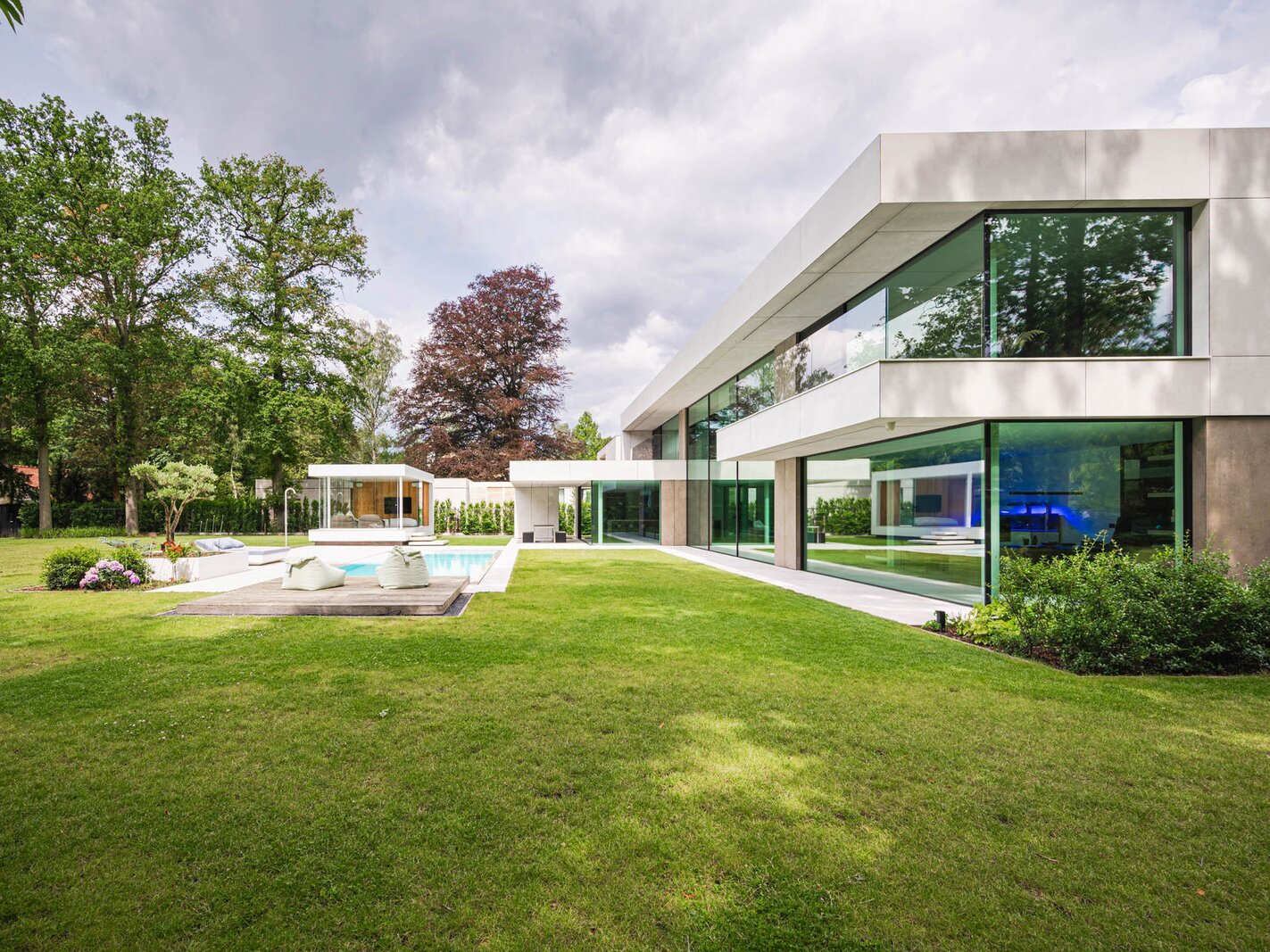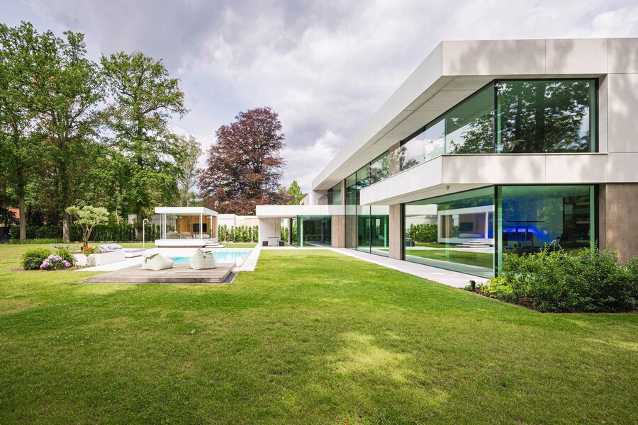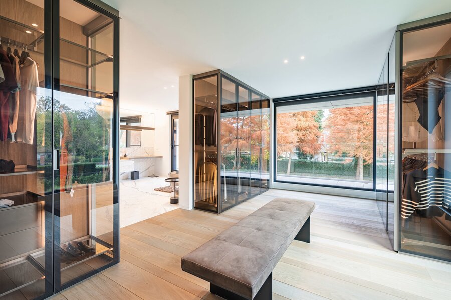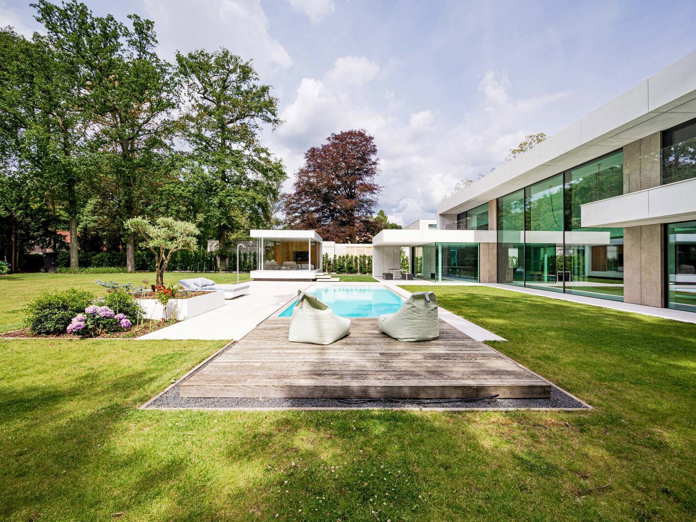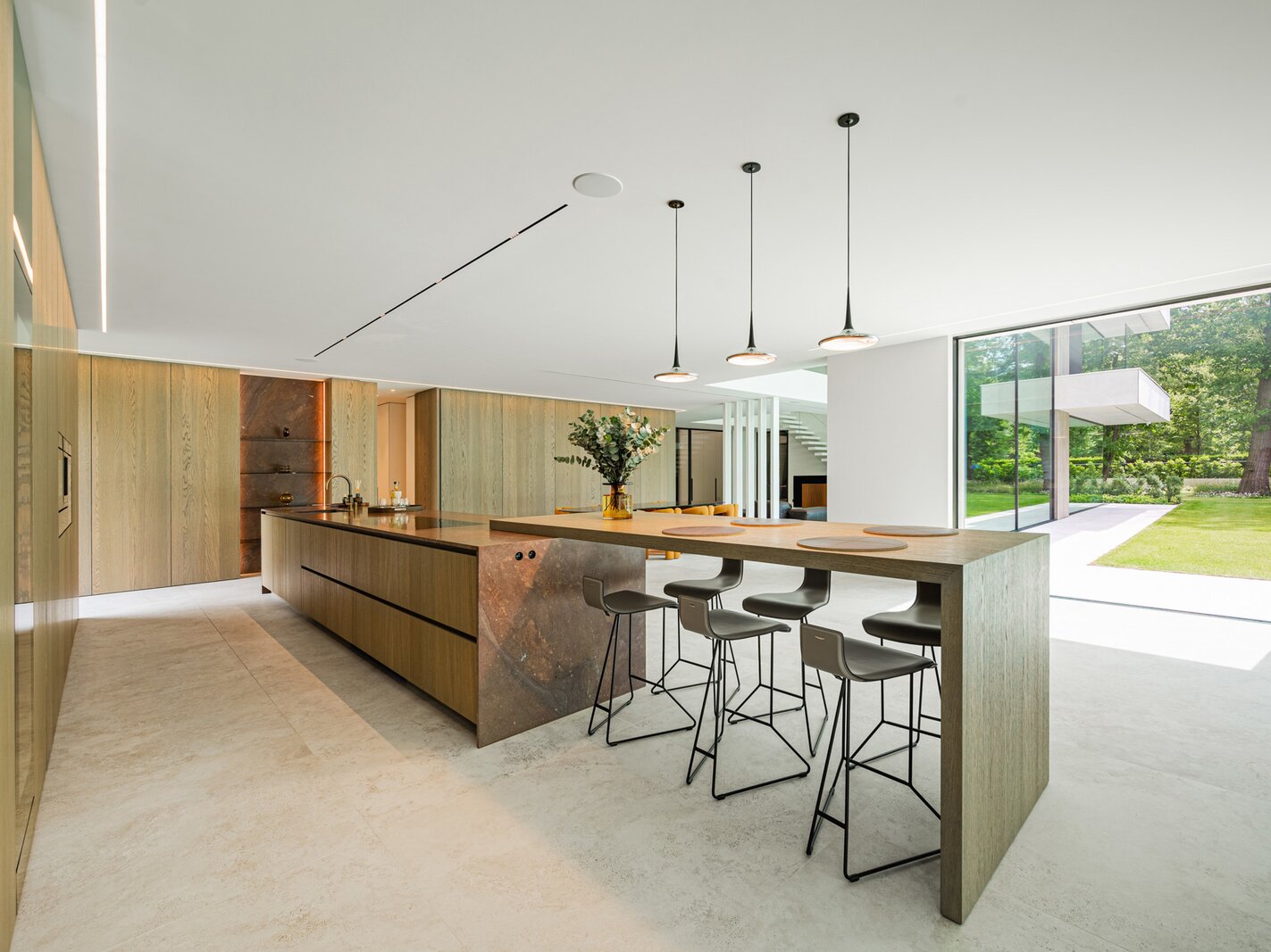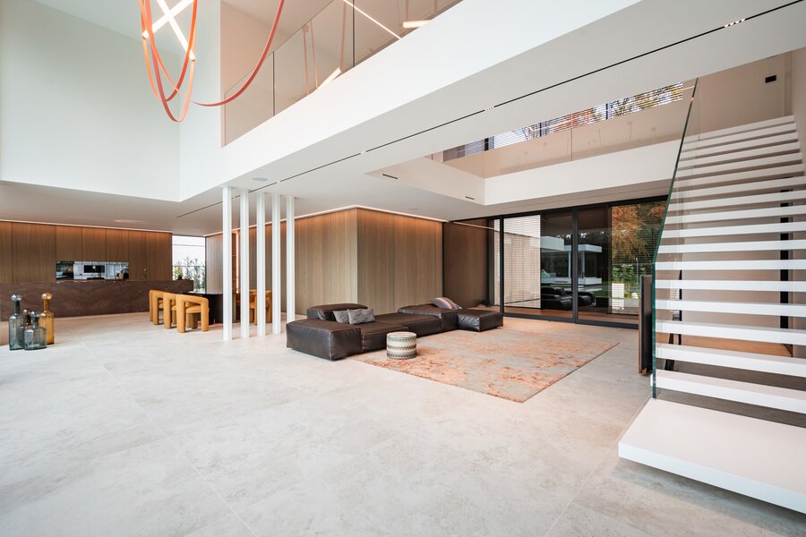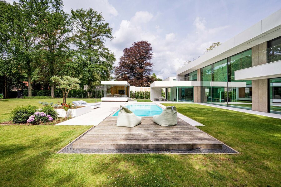 Ontworpen met aandacht voor detail, straalt de villa moderne elegantie uit en is voorzien van hoogwaardige materialen en geavanceerde technologieën. Lichtrijke ruime inkom en vestiaire met grote ramen, waardoor een naadloze verbinding ontstaat tussen binnen en buiten. De leefruimte met open keuken en het kantoor bieden een panoramisch uitzicht en toegang op de tuin. De moderne open keuken met een centraal eiland, vormt het hart van de woning en is uitgerust met state-of-the-art apparatuur. Grenzend aan het kantoor bevindt zich een fitnessruimte. De zwevende open trap met vide naar de eerste verdieping is een architectonisch hoogstandje. Op de bovenverdieping bevindt zich de master suite met een eigen dressing en badkamer. Drie extra kamers, elk met een eigen badkamer. Het overdekt terras en glazen ontspanningsruimte voorzien is voorzien van schuiframen.