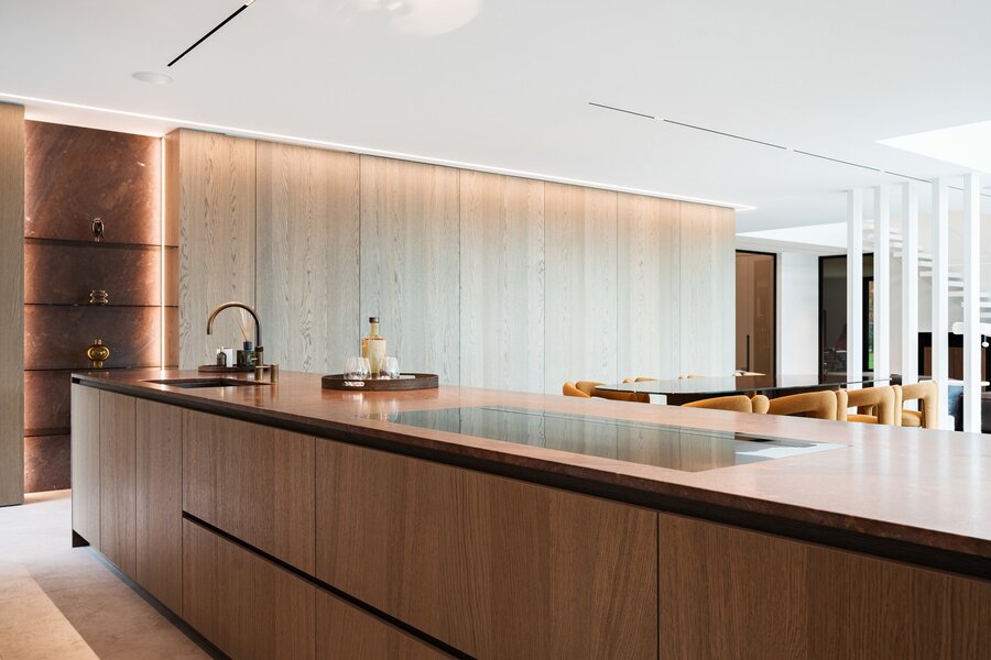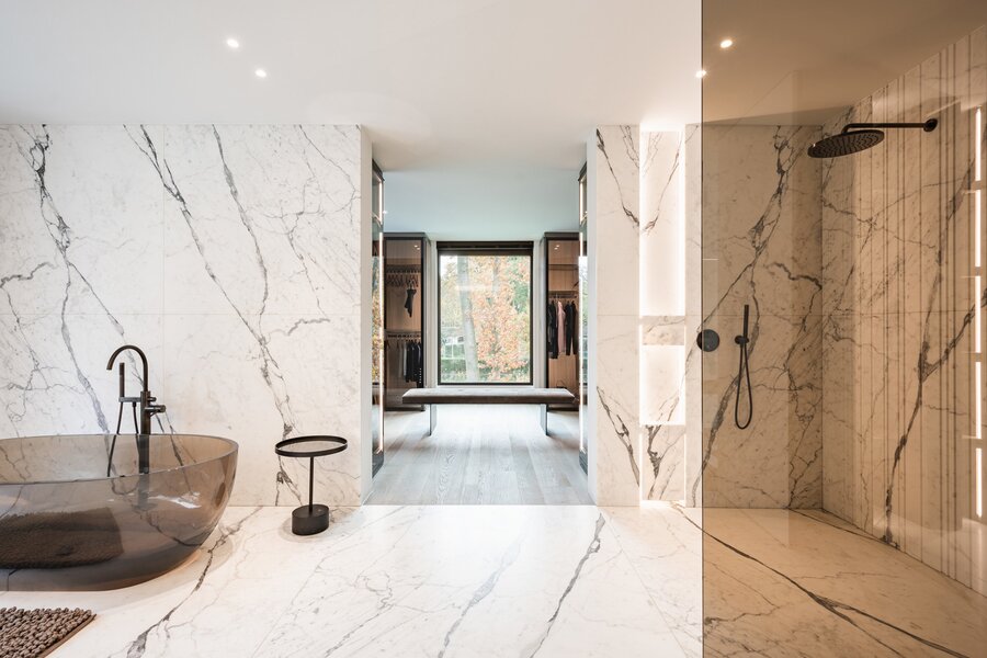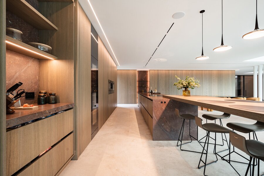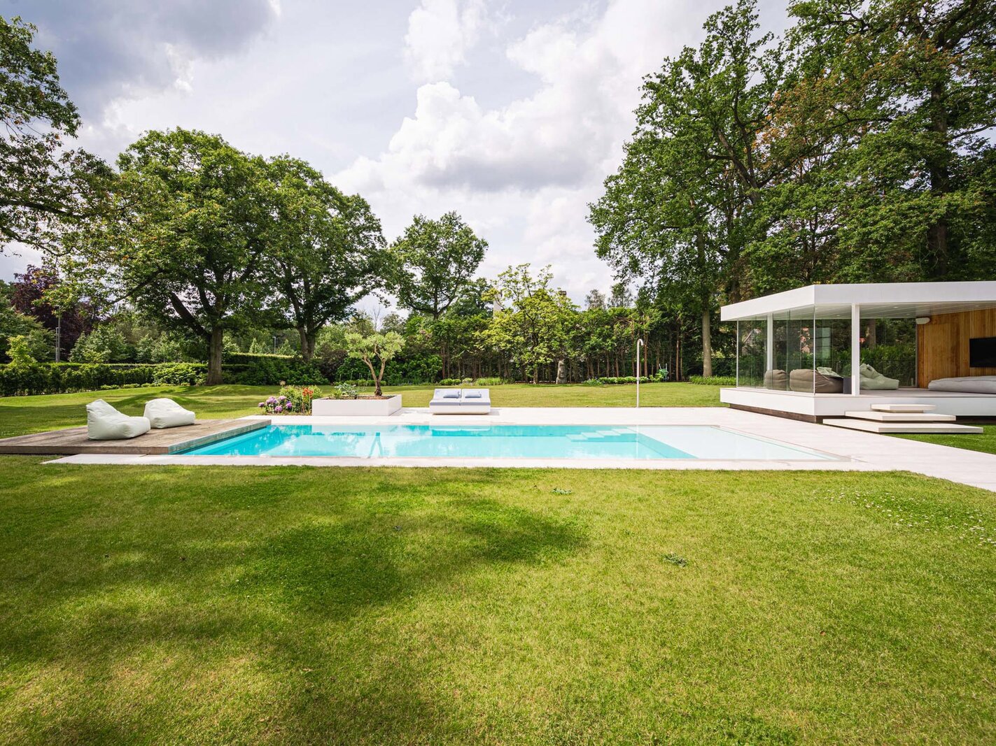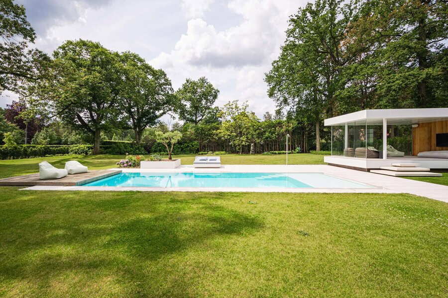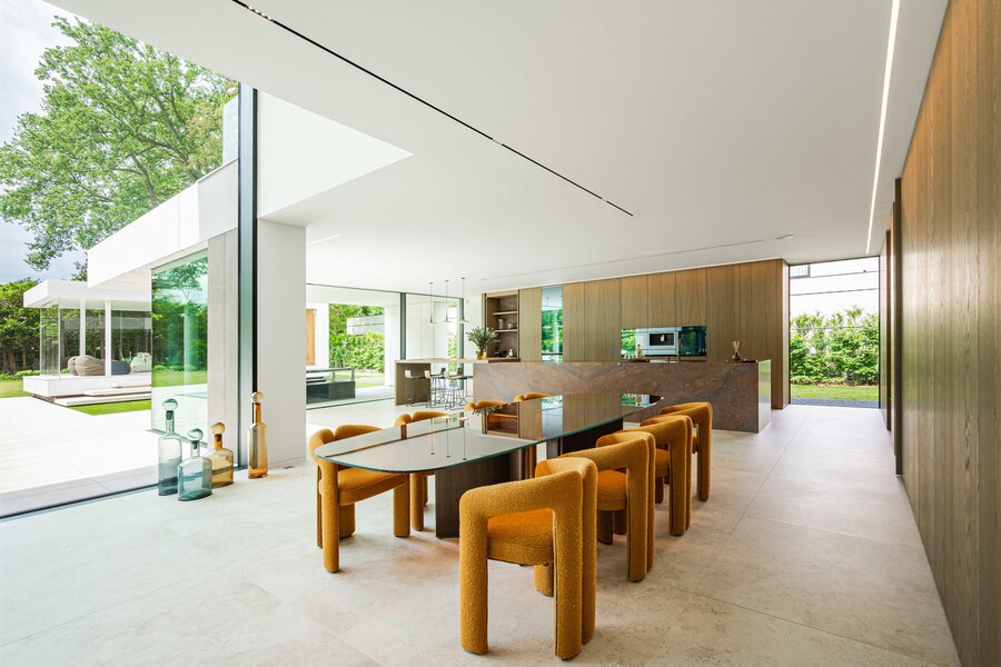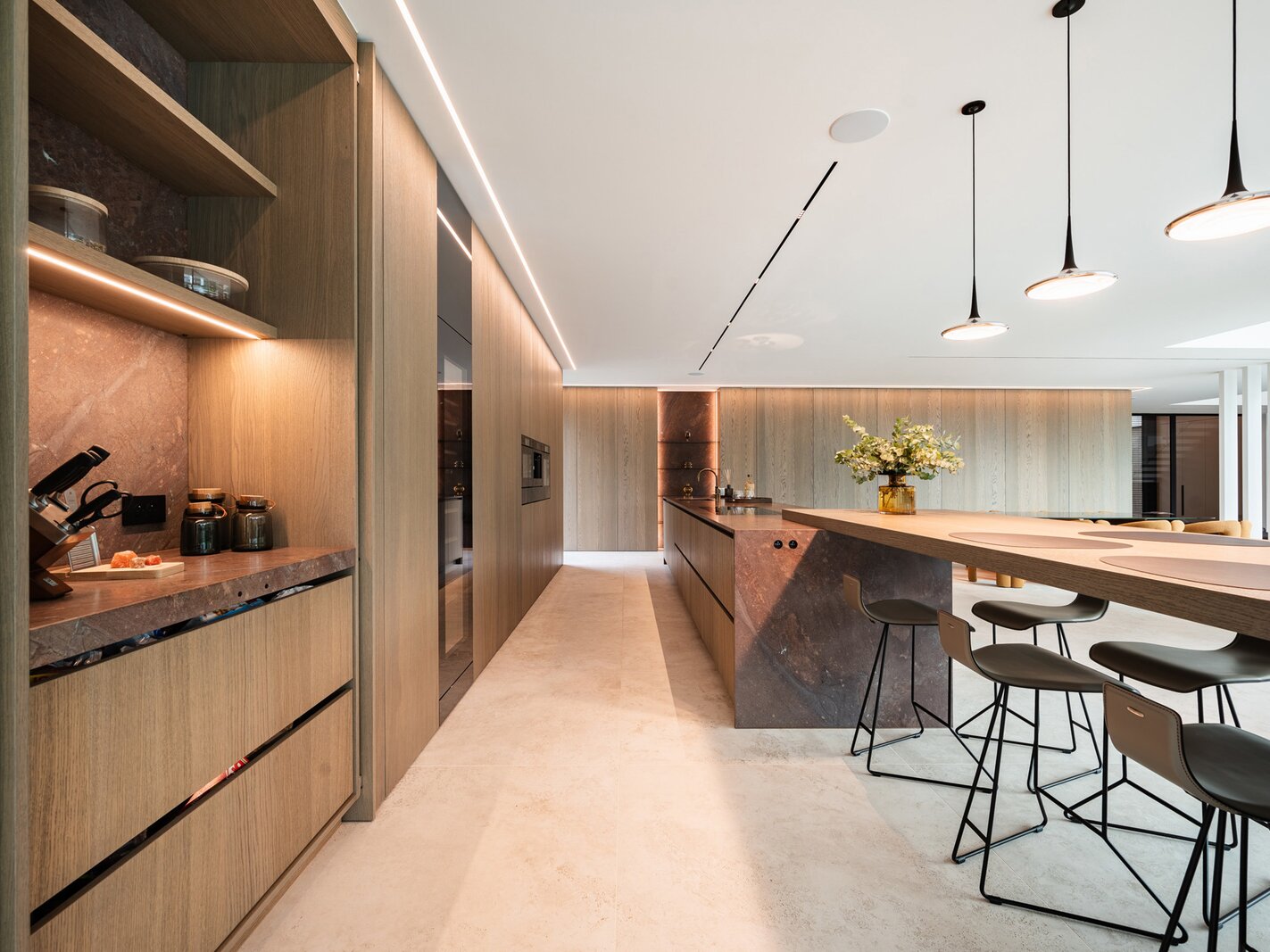 Ontworpen met aandacht voor detail, straalt de villa moderne elegantie uit en is voorzien van hoogwaardige materialen en geavanceerde technologieën. Lichtrijke ruime inkom en vestiaire met grote ramen, waardoor een naadloze verbinding ontstaat tussen binnen en buiten. De leefruimte met open keuken en het kantoor bieden een panoramisch uitzicht en toegang op de tuin. De moderne open keuken met een centraal eiland, vormt het hart van de woning en is uitgerust met state-of-the-art apparatuur. Grenzend aan het kantoor bevindt zich een fitnessruimte. De zwevende open trap met vide naar de eerste verdieping is een architectonisch hoogstandje. Op de bovenverdieping bevindt zich de master suite met een eigen dressing en badkamer. Drie extra kamers, elk met een eigen badkamer. Het overdekt terras en glazen ontspanningsruimte voorzien is voorzien van schuiframen.