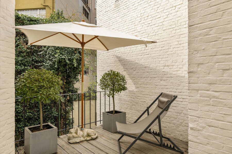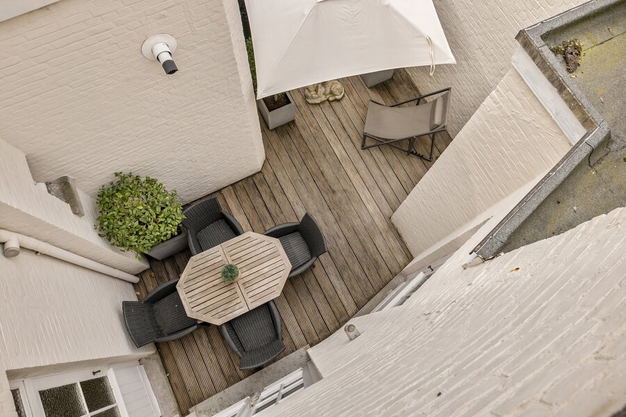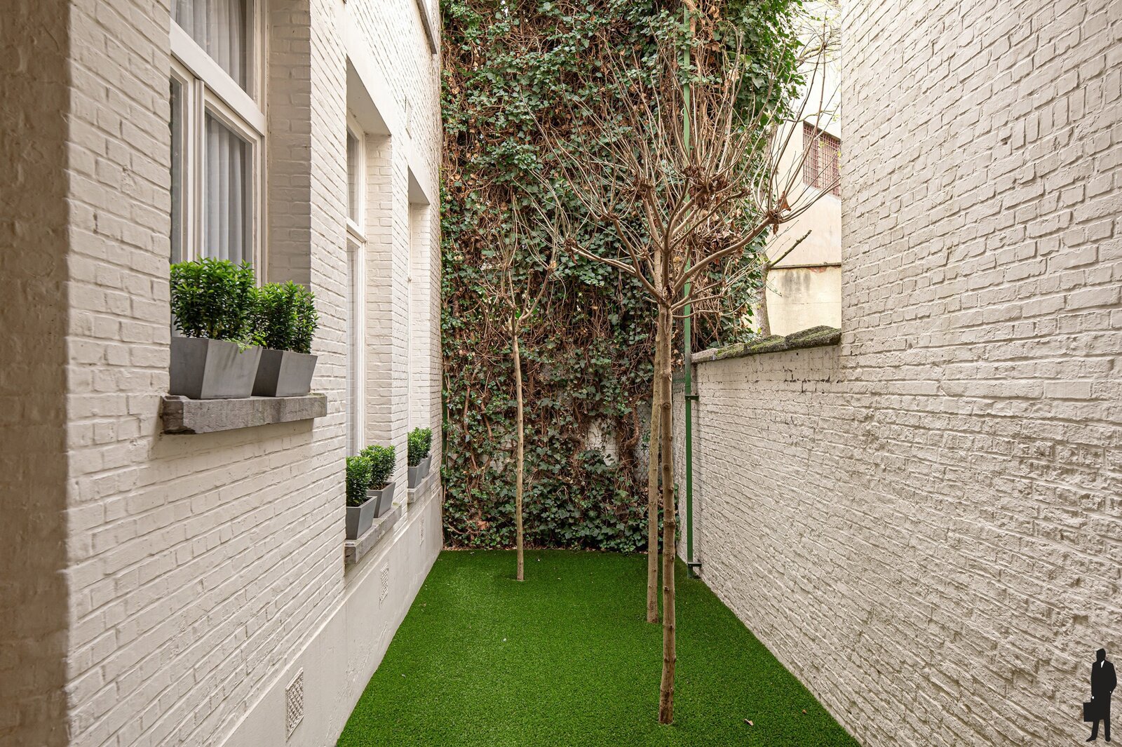 De eerste verdieping omvat een lichtrijke leefruimte, keuken en eetkamer, aangevuld met een polyvalente ruimte achteraan en toegang tot het terras van 10 m². Daarnaast is er een stadstuin van 17 m².