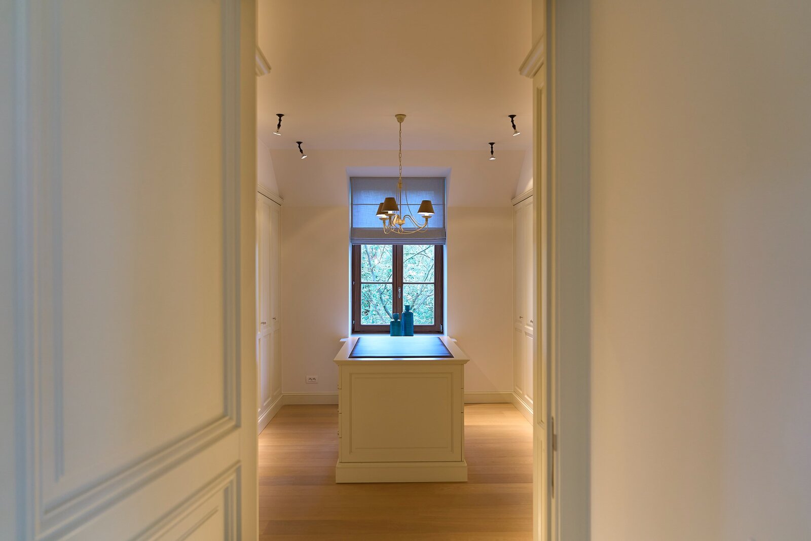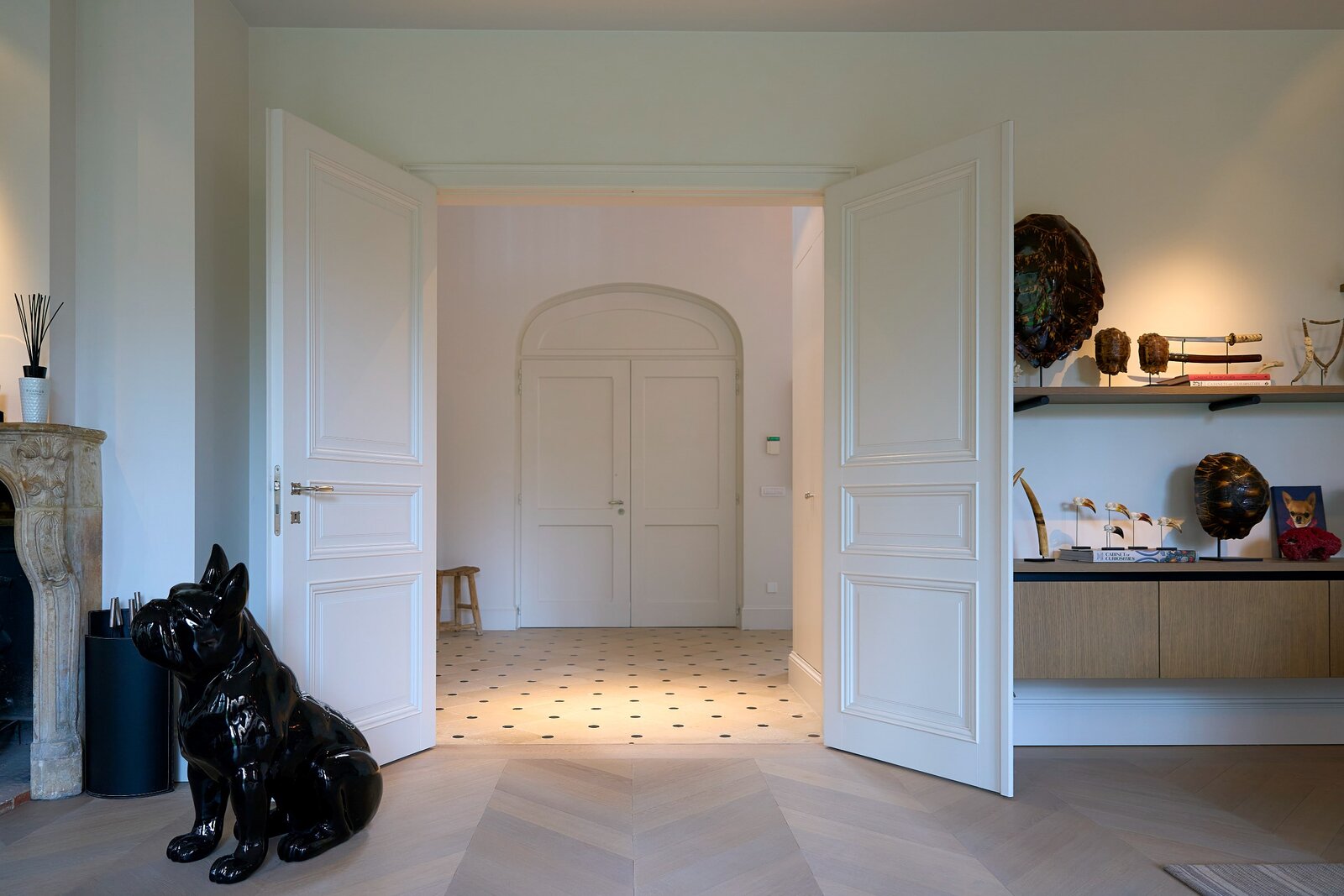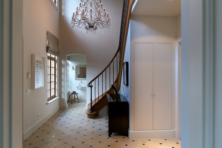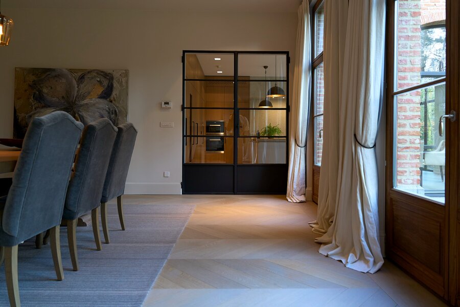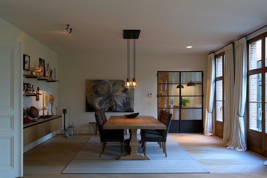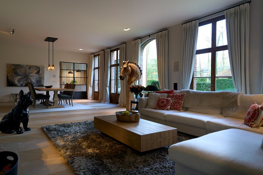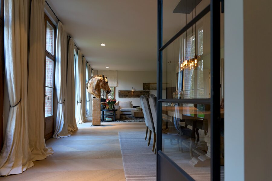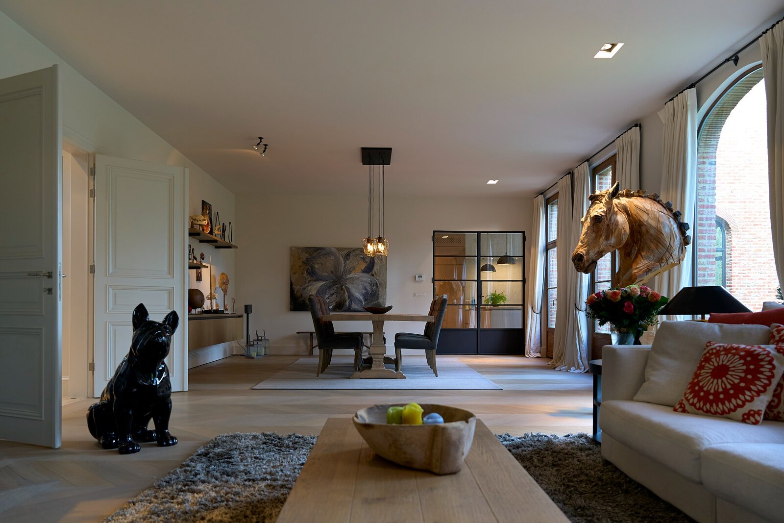 Indeling gelijkvloers: Royale inkomhal met Franse natuursteen, prachtige traphal in Franse rustieke eik en houten balustrade met vide naar verdieping, vestiaire en gastentoilet met natuurstenen handenwasser. Via inkomhal toegang tot bureel met Franse eiken vloer, living van 70 m² met authentieke natuurstenen open haard en eiken parket in Hongaarse punt . Zeer ruime nieuwe leefkeuken (volledig geïnstalleerd) verbonden met royale ontbijthoek op tegelvloer in groot formaat Bijkeuken met extra kastruimte. Garage voor 2 wagens met automatisatie en fietsenberging. CV, electriciteitskast e.d. in garage. Dienstingang aan zijgevel garage. Hoogte plafond kamers gelijkvloers 300 cm, hoogte deuren 235 cm.