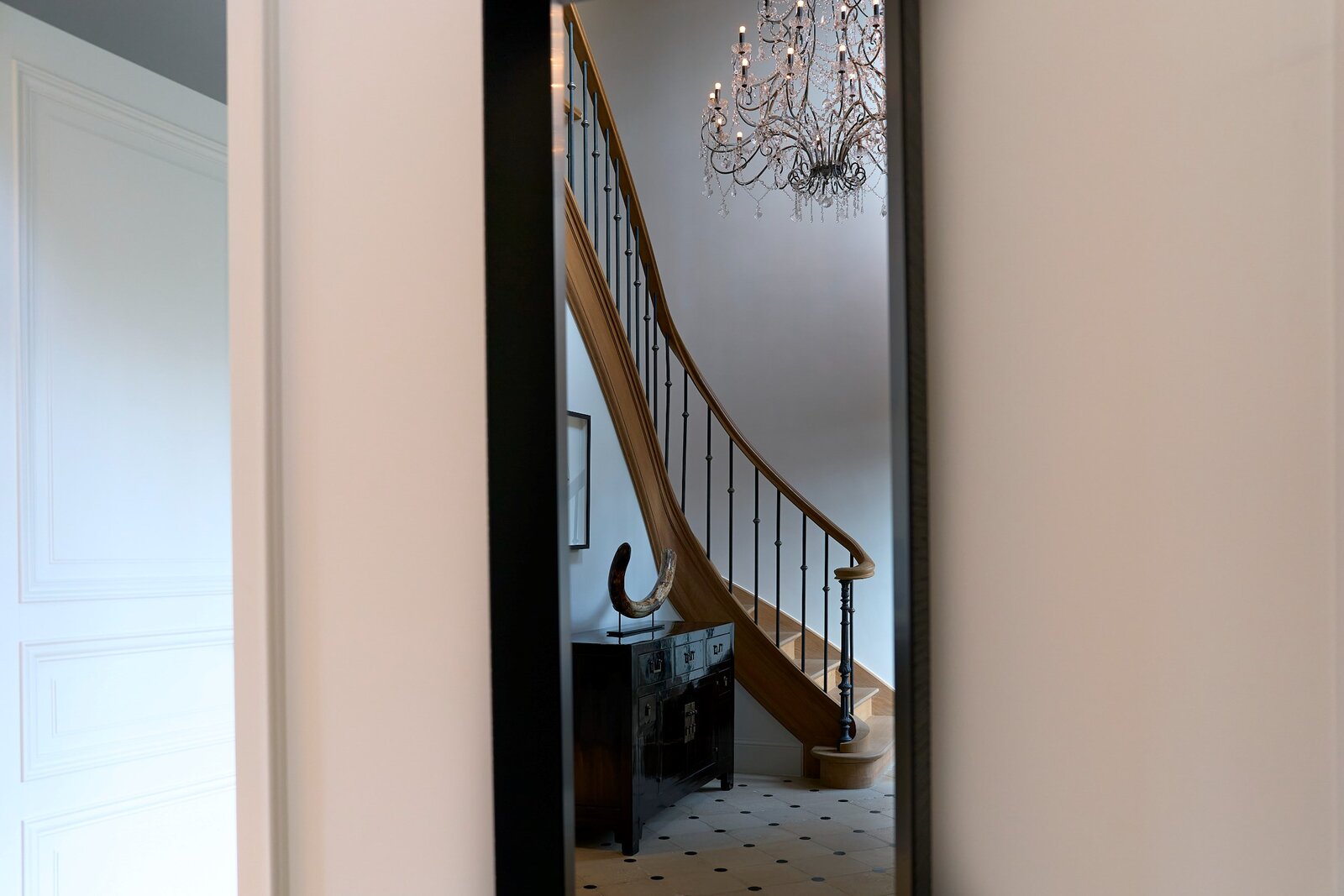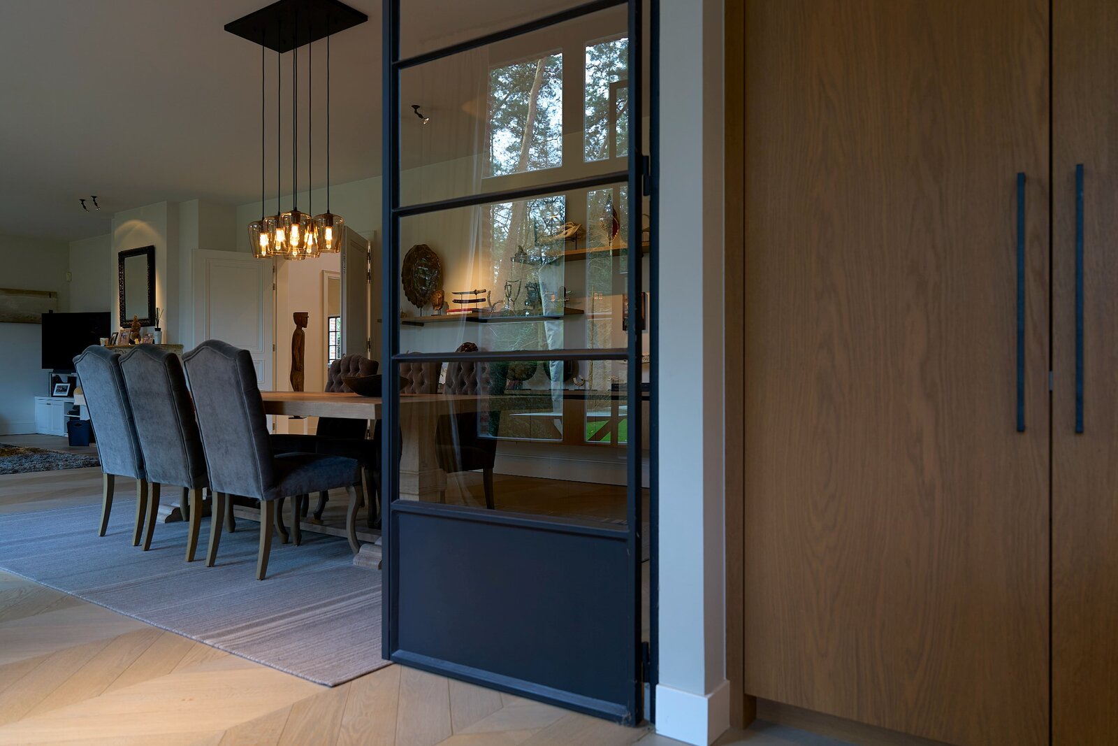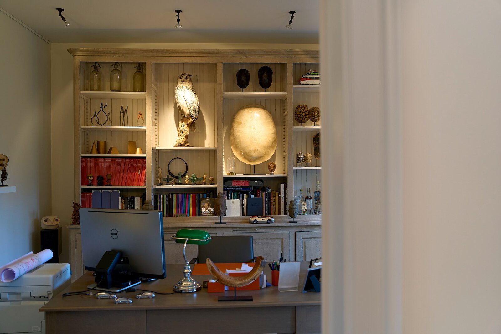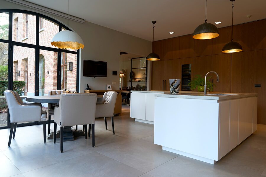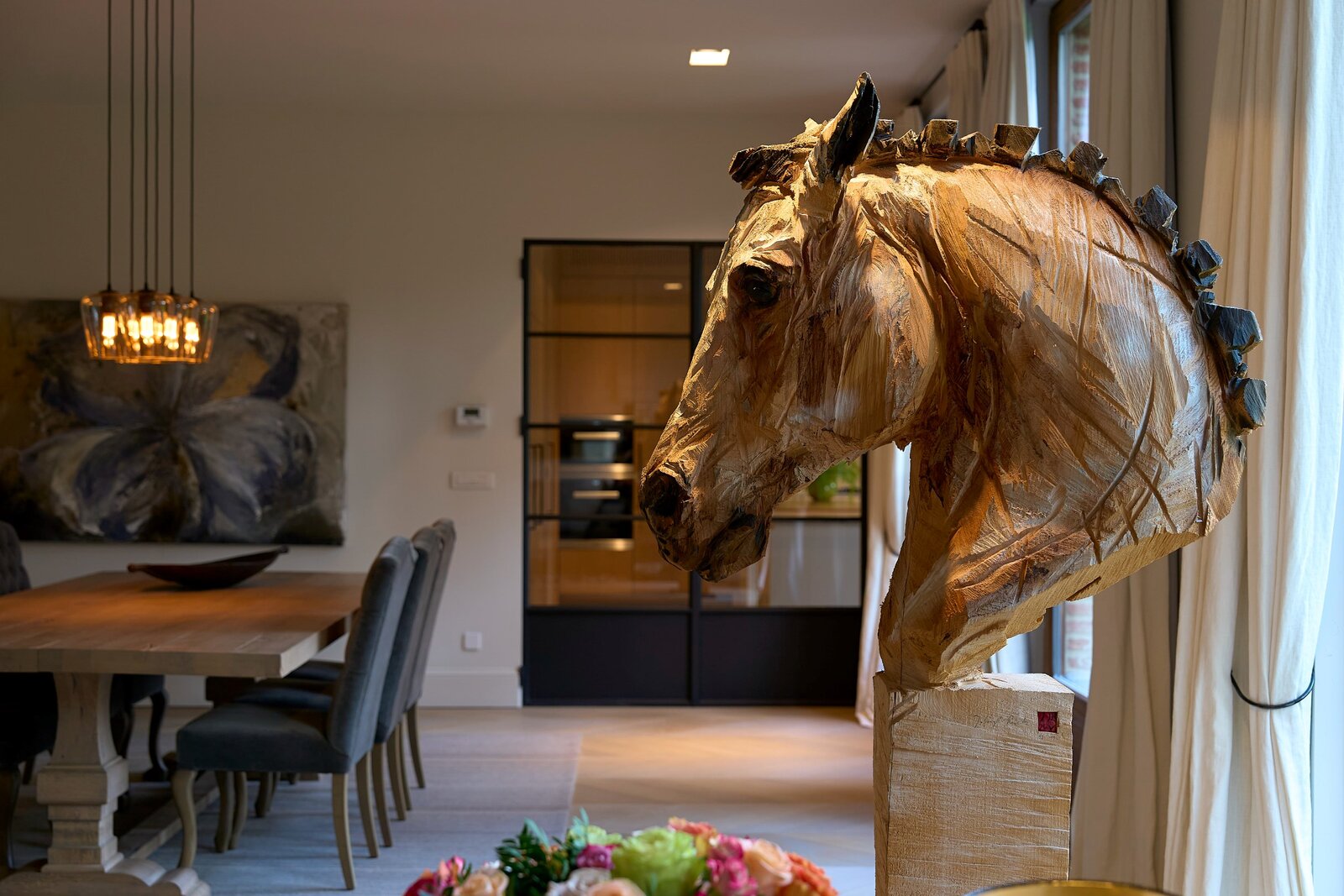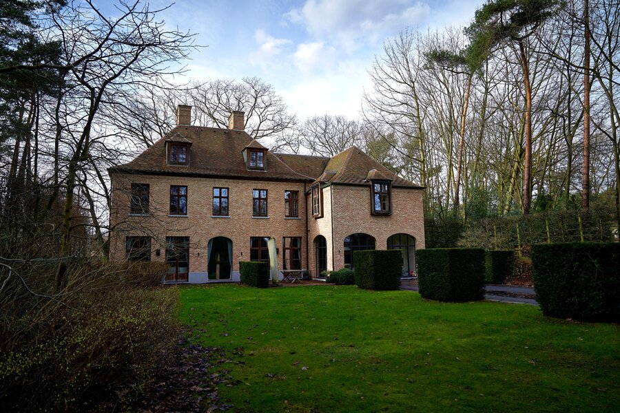 Indeling gelijkvloers: Royale inkomhal met Franse natuursteen, prachtige traphal in Franse rustieke eik en houten balustrade met vide naar verdieping, vestiaire en gastentoilet met natuurstenen handenwasser. Via inkomhal toegang tot bureel met Franse eiken vloer, living van 70 m² met authentieke natuurstenen open haard en eiken parket in Hongaarse punt . Zeer ruime nieuwe leefkeuken (volledig geïnstalleerd) verbonden met royale ontbijthoek op tegelvloer in groot formaat Bijkeuken met extra kastruimte. Garage voor 2 wagens met automatisatie en fietsenberging. CV, electriciteitskast e.d. in garage. Dienstingang aan zijgevel garage. Hoogte plafond kamers gelijkvloers 300 cm, hoogte deuren 235 cm.