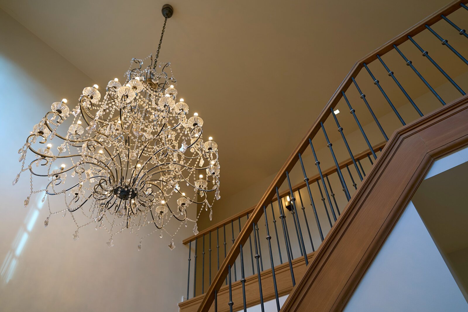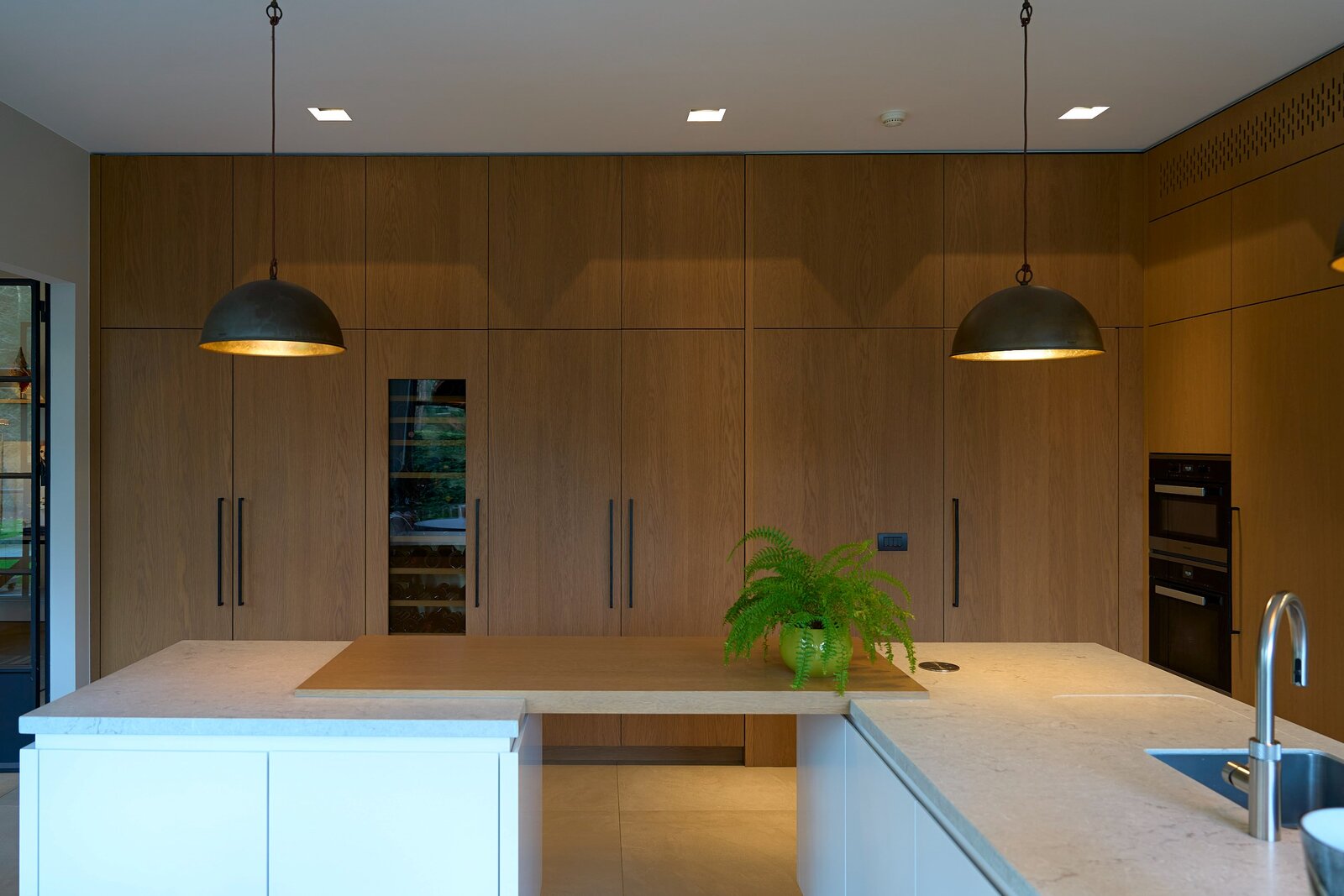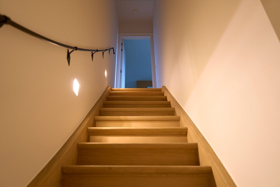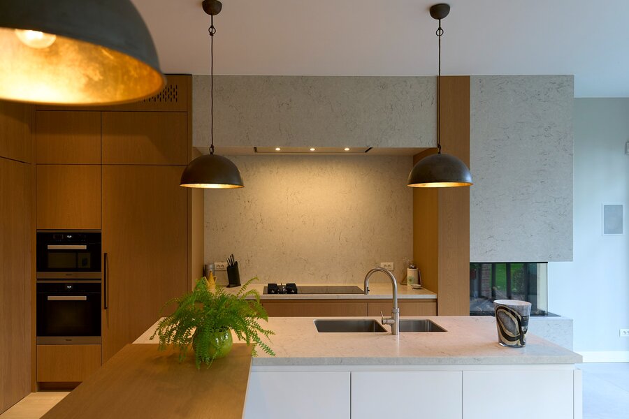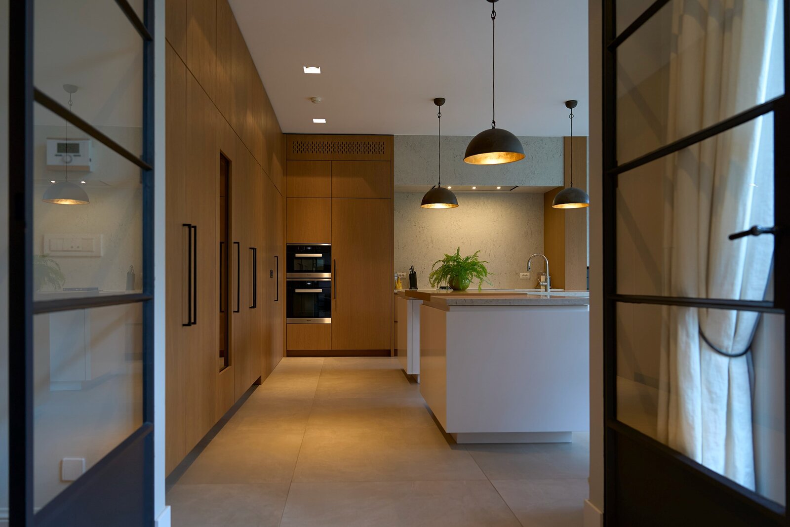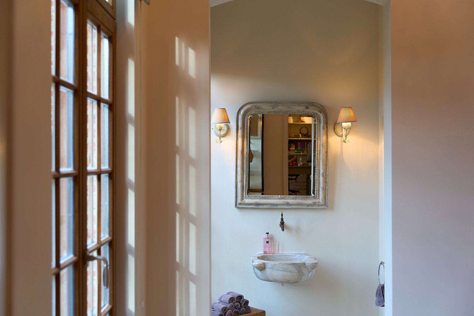 Indeling gelijkvloers: Royale inkomhal met Franse natuursteen, prachtige traphal in Franse rustieke eik en houten balustrade met vide naar verdieping, vestiaire en gastentoilet met natuurstenen handenwasser. Via inkomhal toegang tot bureel met Franse eiken vloer, living van 70 m² met authentieke natuurstenen open haard en eiken parket in Hongaarse punt . Zeer ruime nieuwe leefkeuken (volledig geïnstalleerd) verbonden met royale ontbijthoek op tegelvloer in groot formaat Bijkeuken met extra kastruimte. Garage voor 2 wagens met automatisatie en fietsenberging. CV, electriciteitskast e.d. in garage. Dienstingang aan zijgevel garage. Hoogte plafond kamers gelijkvloers 300 cm, hoogte deuren 235 cm.