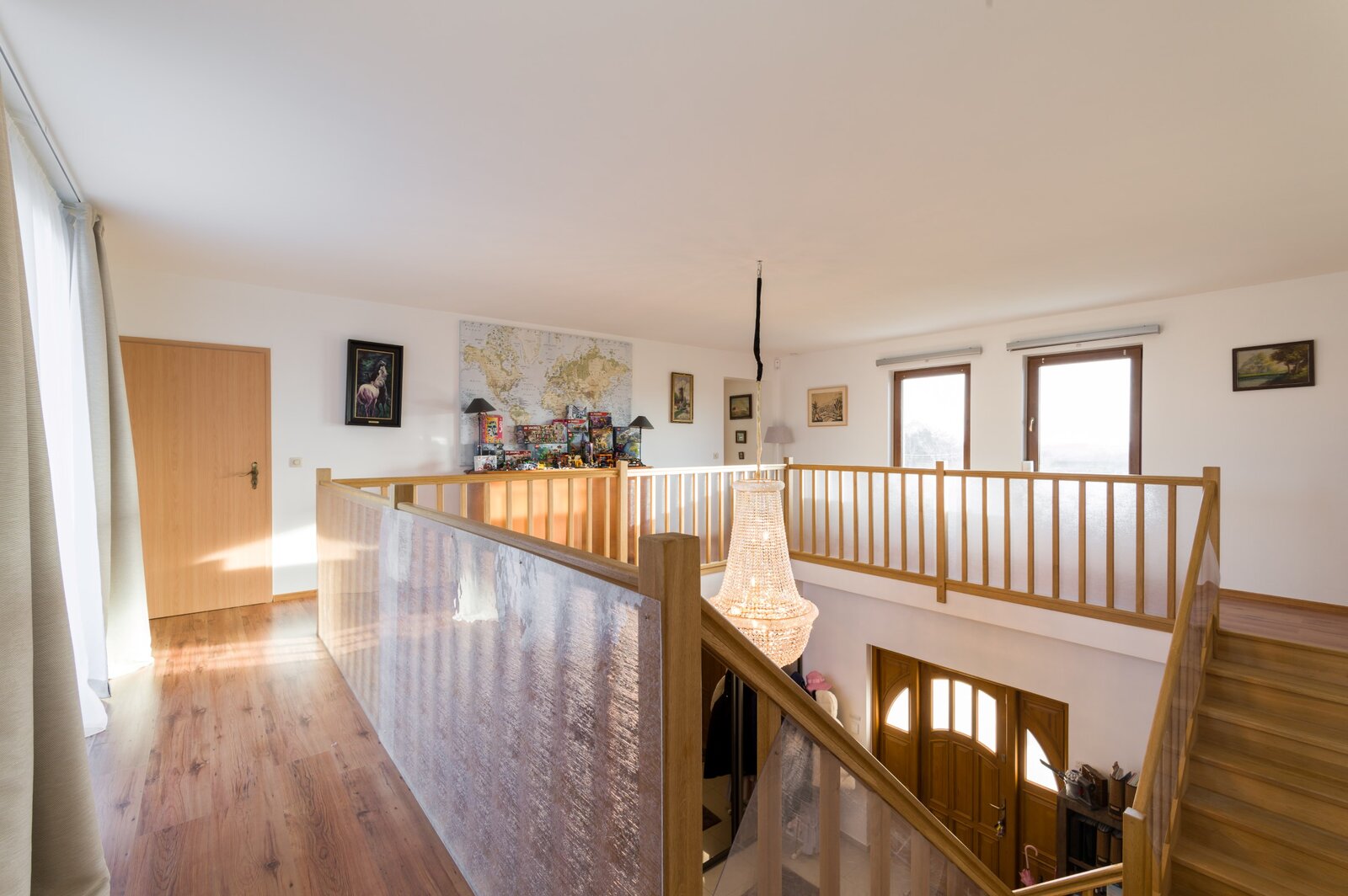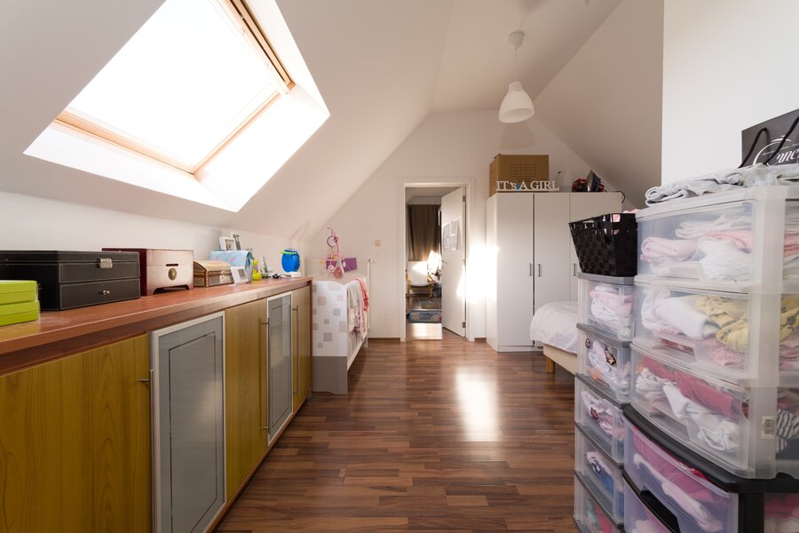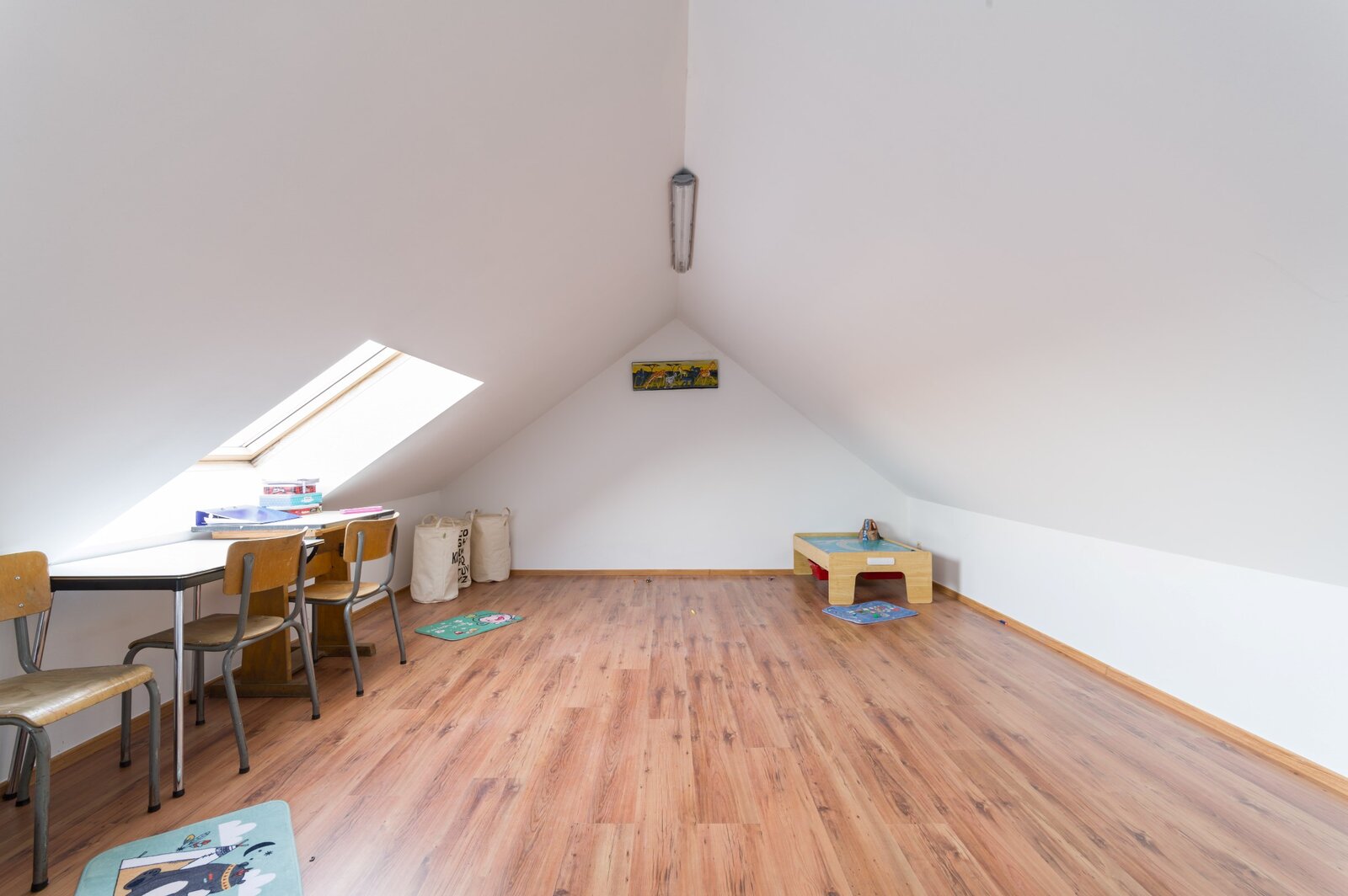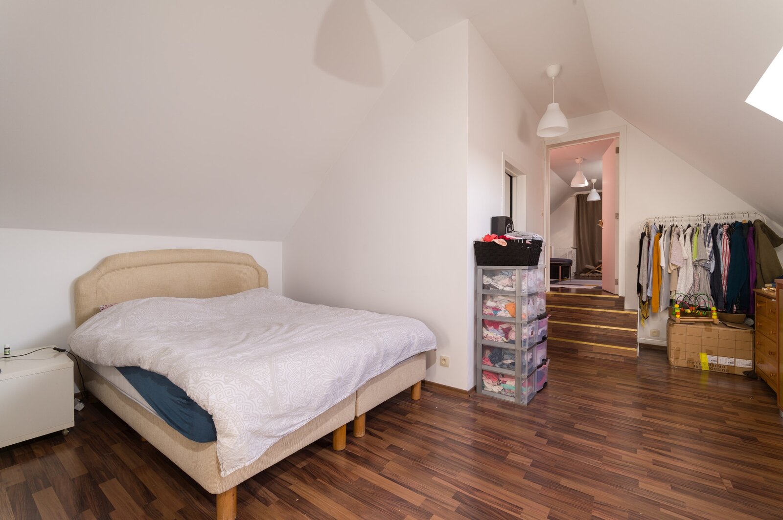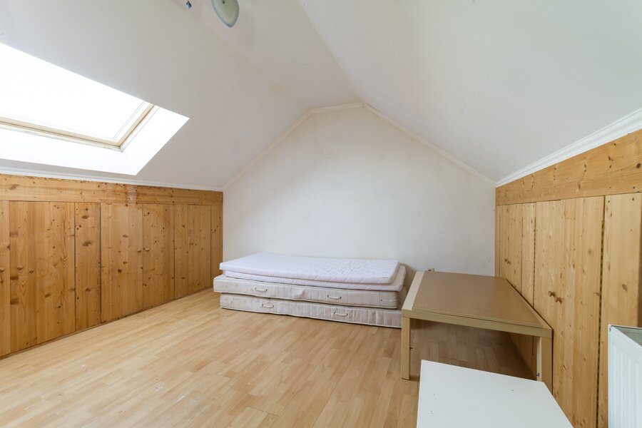 Verdieping: overloop met enerzijds de masterbedroom met dressing, badkamer en enorme stockageruimte. Aan de andere zijde van de open traphal een doorgang met 2 slaapkamers en een trap naar de dakverdieping waar zich nog 3 afzonderlijke grote ruimten bevinden.