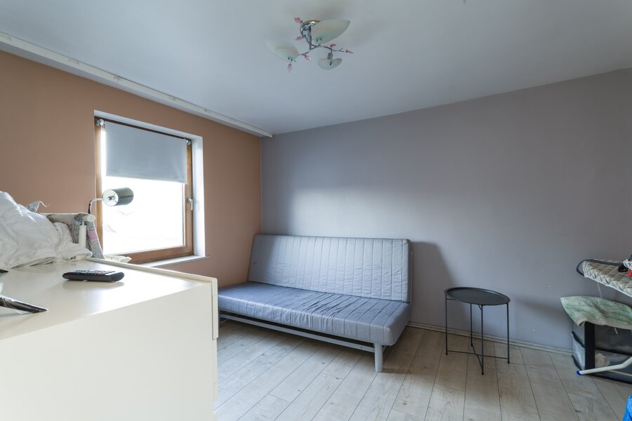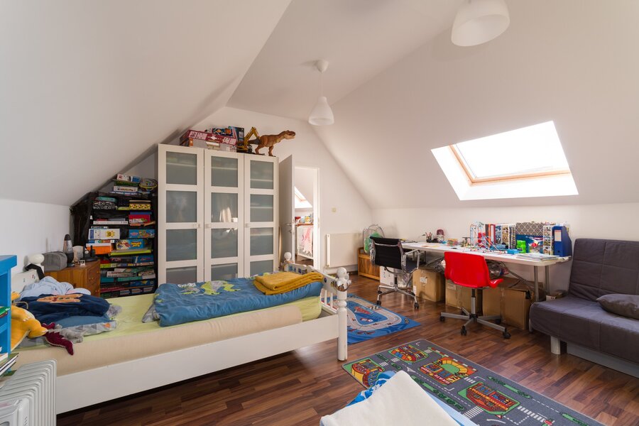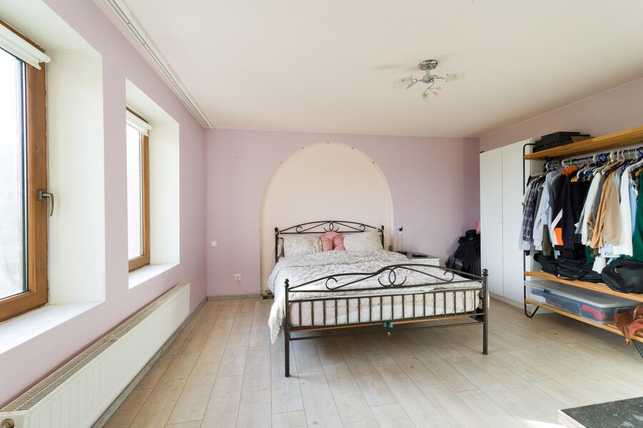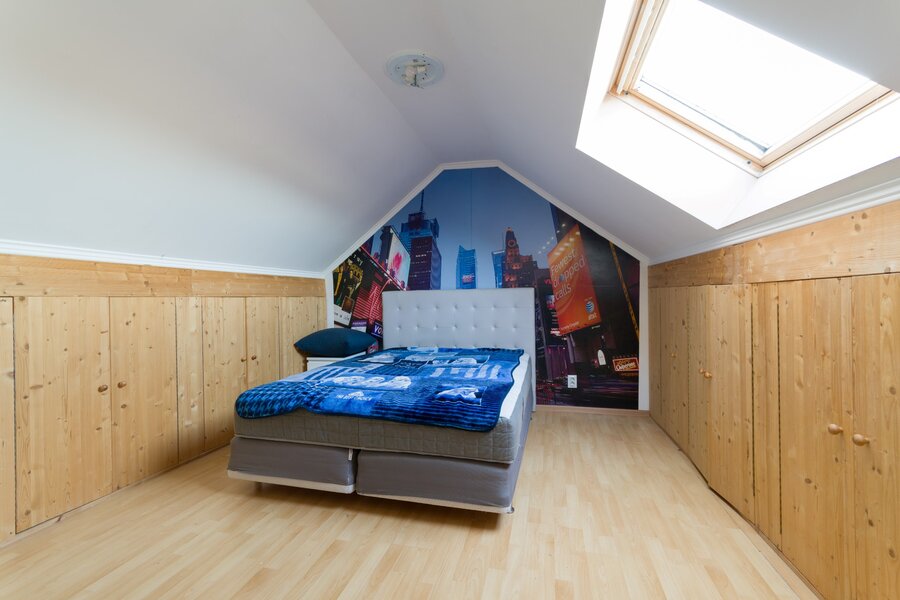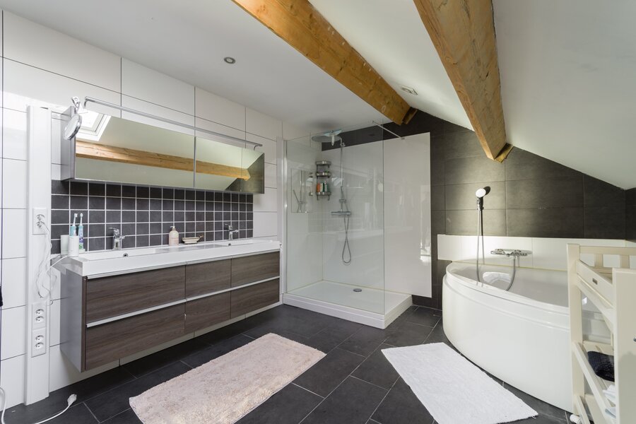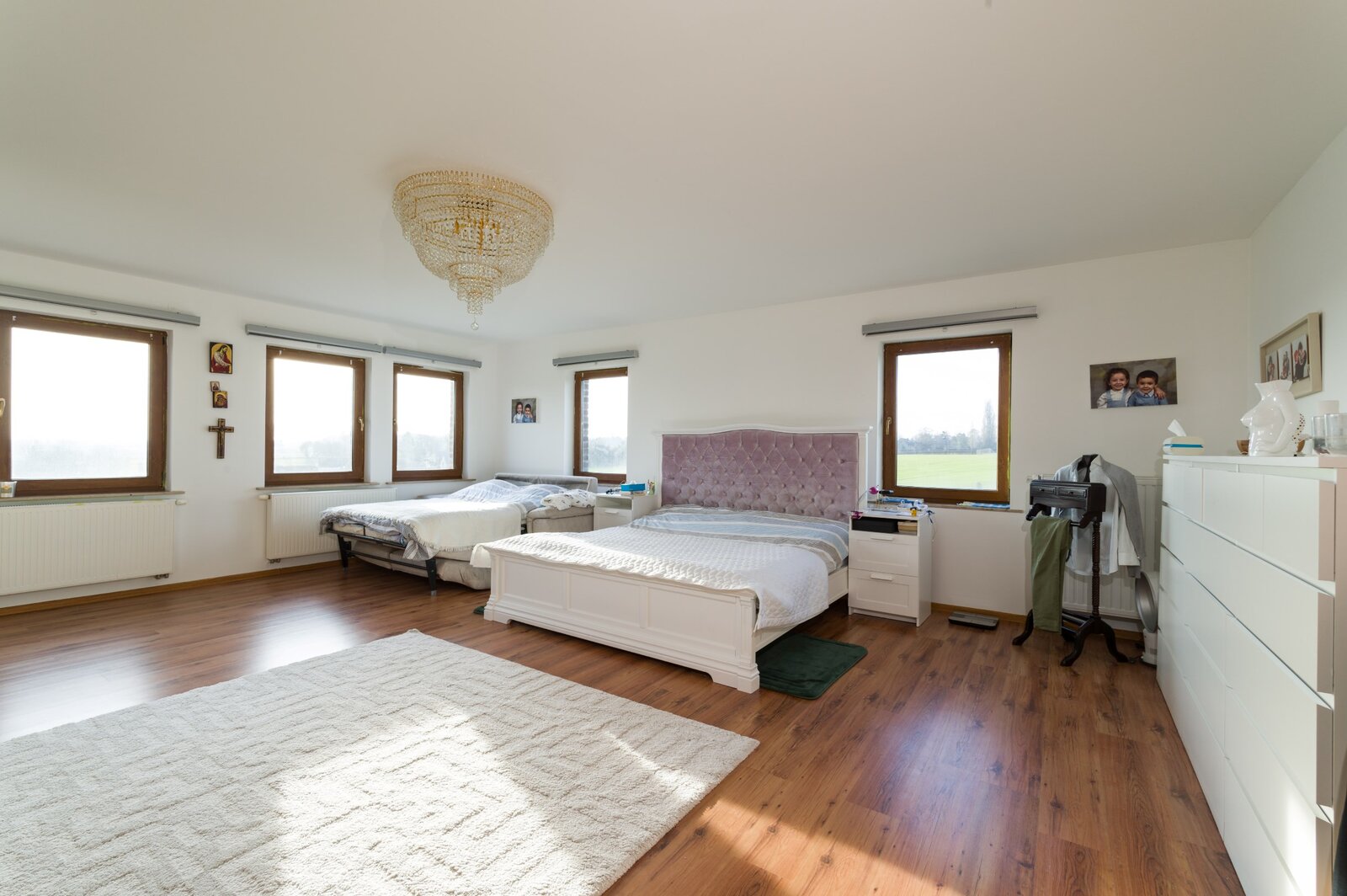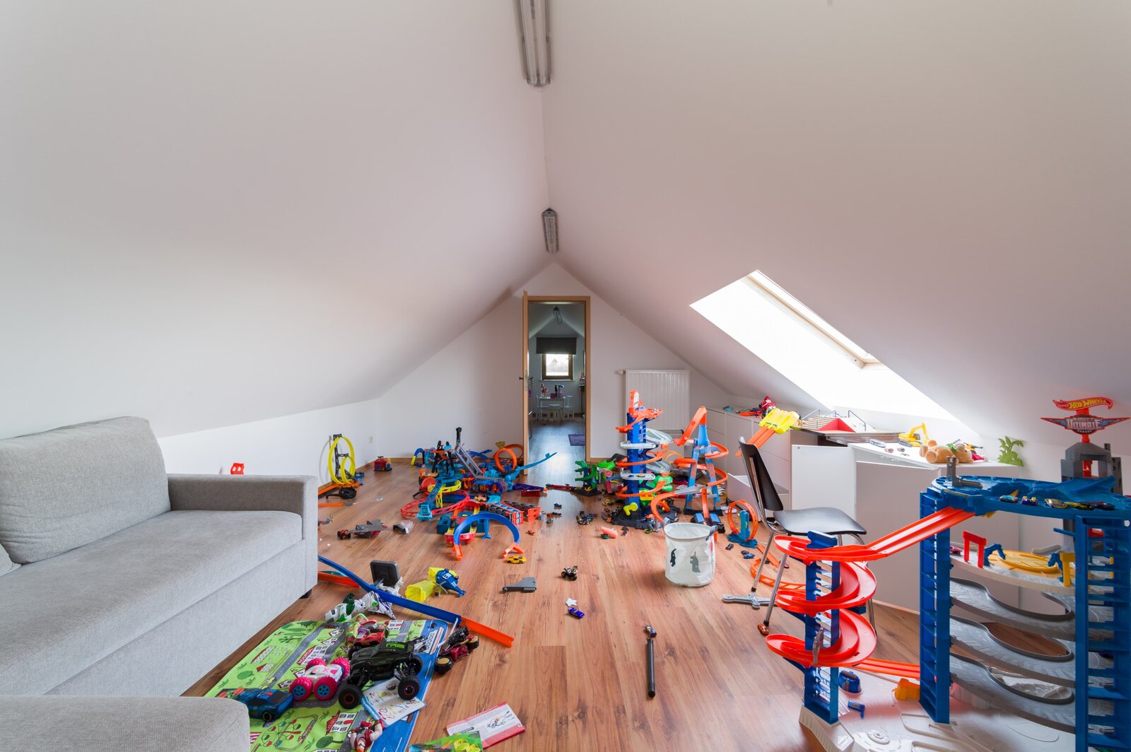 Verdieping: overloop met enerzijds de masterbedroom met dressing, badkamer en enorme stockageruimte. Aan de andere zijde van de open traphal een doorgang met 2 slaapkamers en een trap naar de dakverdieping waar zich nog 3 afzonderlijke grote ruimten bevinden.