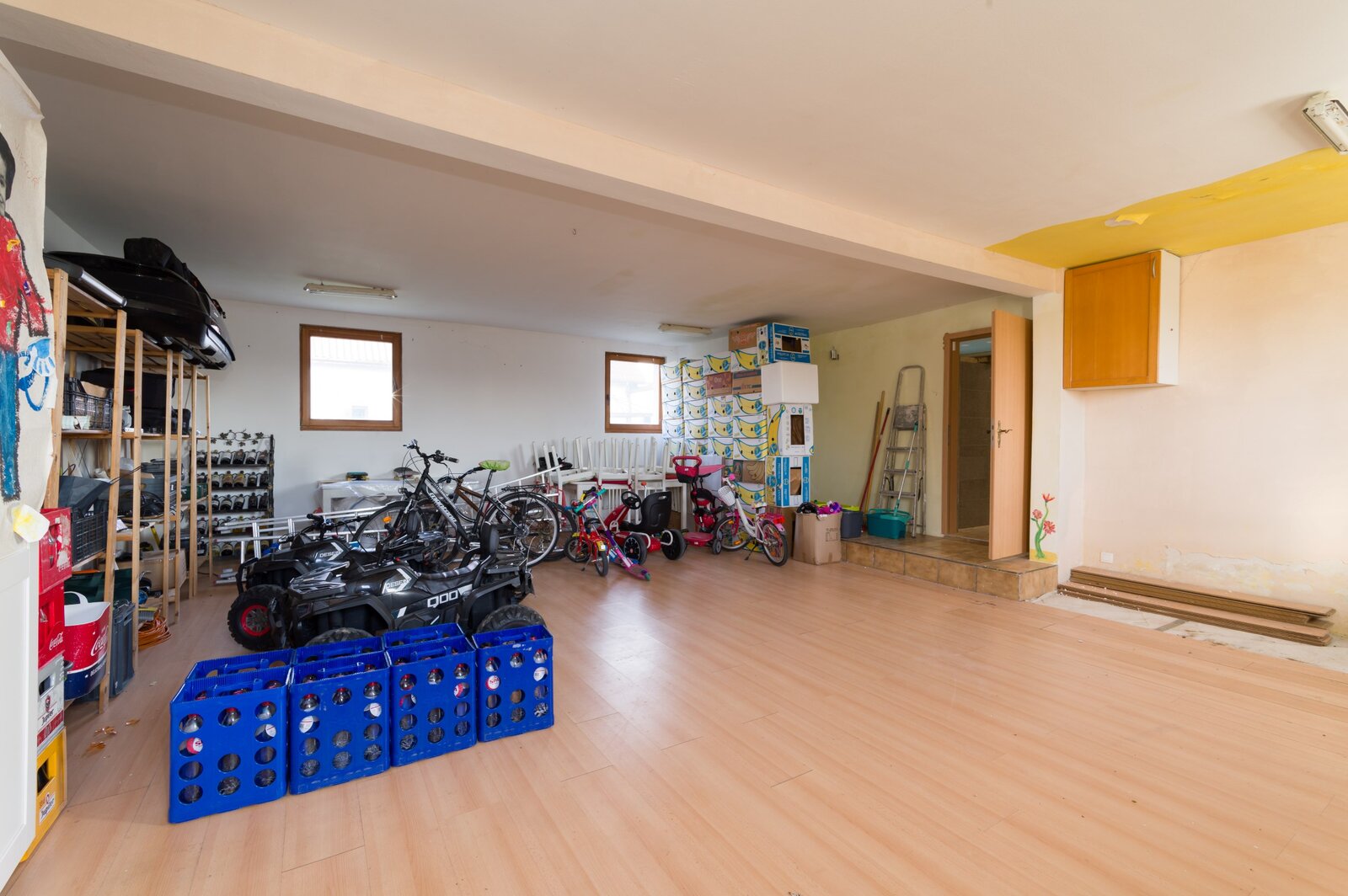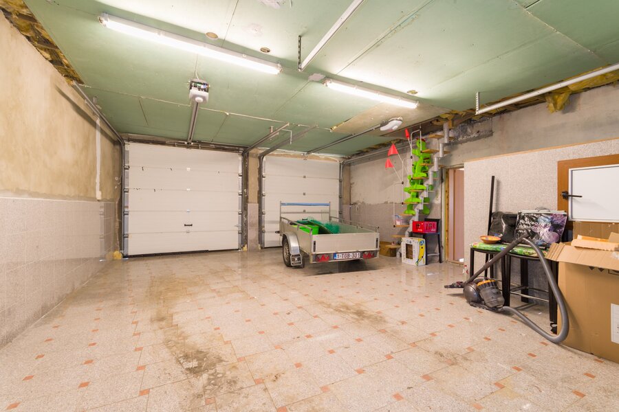 Inkomhal met vestiairewand, toilet en tweedelige trap, leef- en zitruimte, keuken en ontbijthoek, tweede zitplaats, dubbele garage met aansluitend een enorme berging.