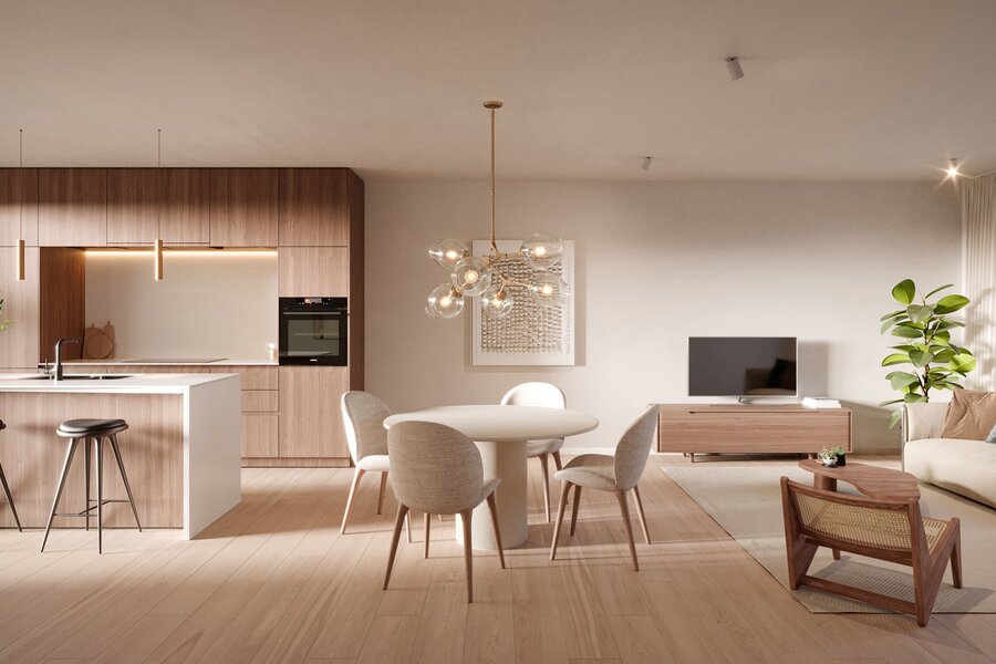 Elk appartement heeft standaard een volledig afgewerkte keuken voorzien van kolomkasten in eikfineer, composieten werkblad en deels matte melamine.