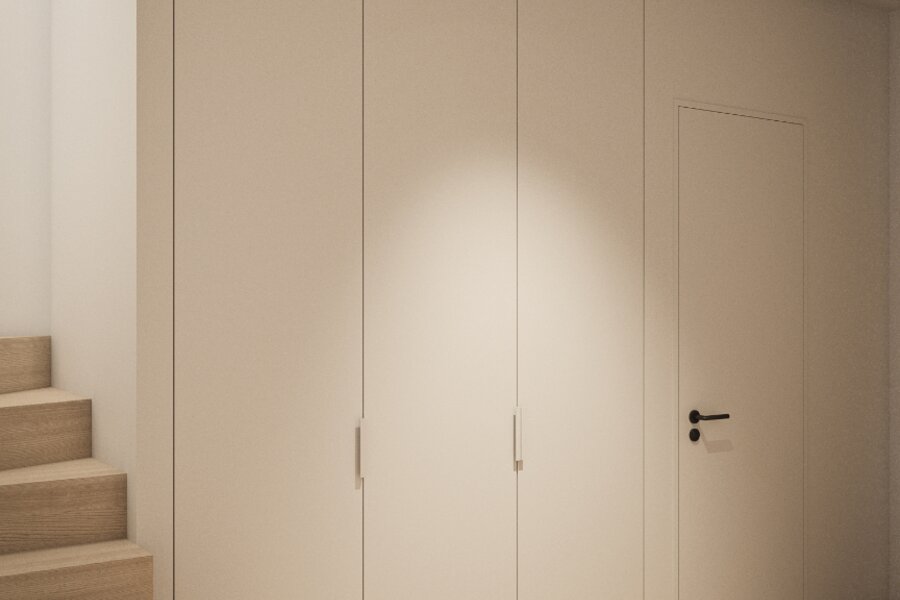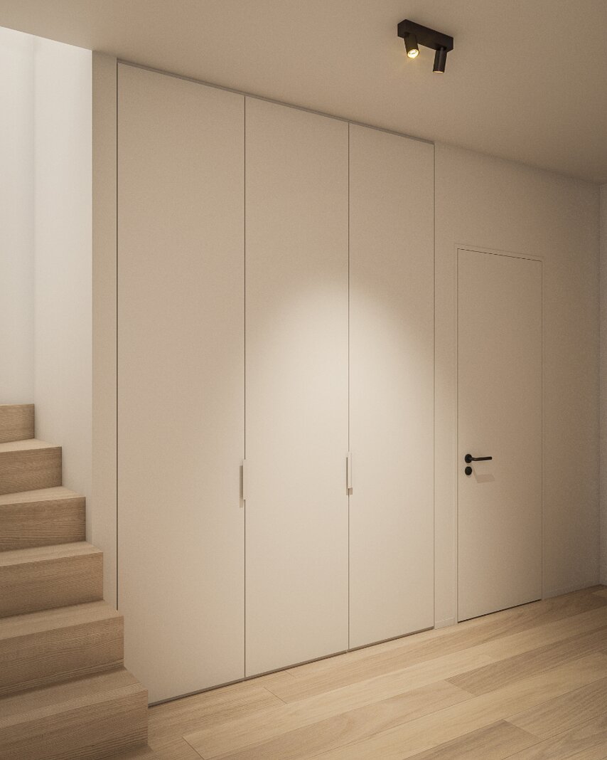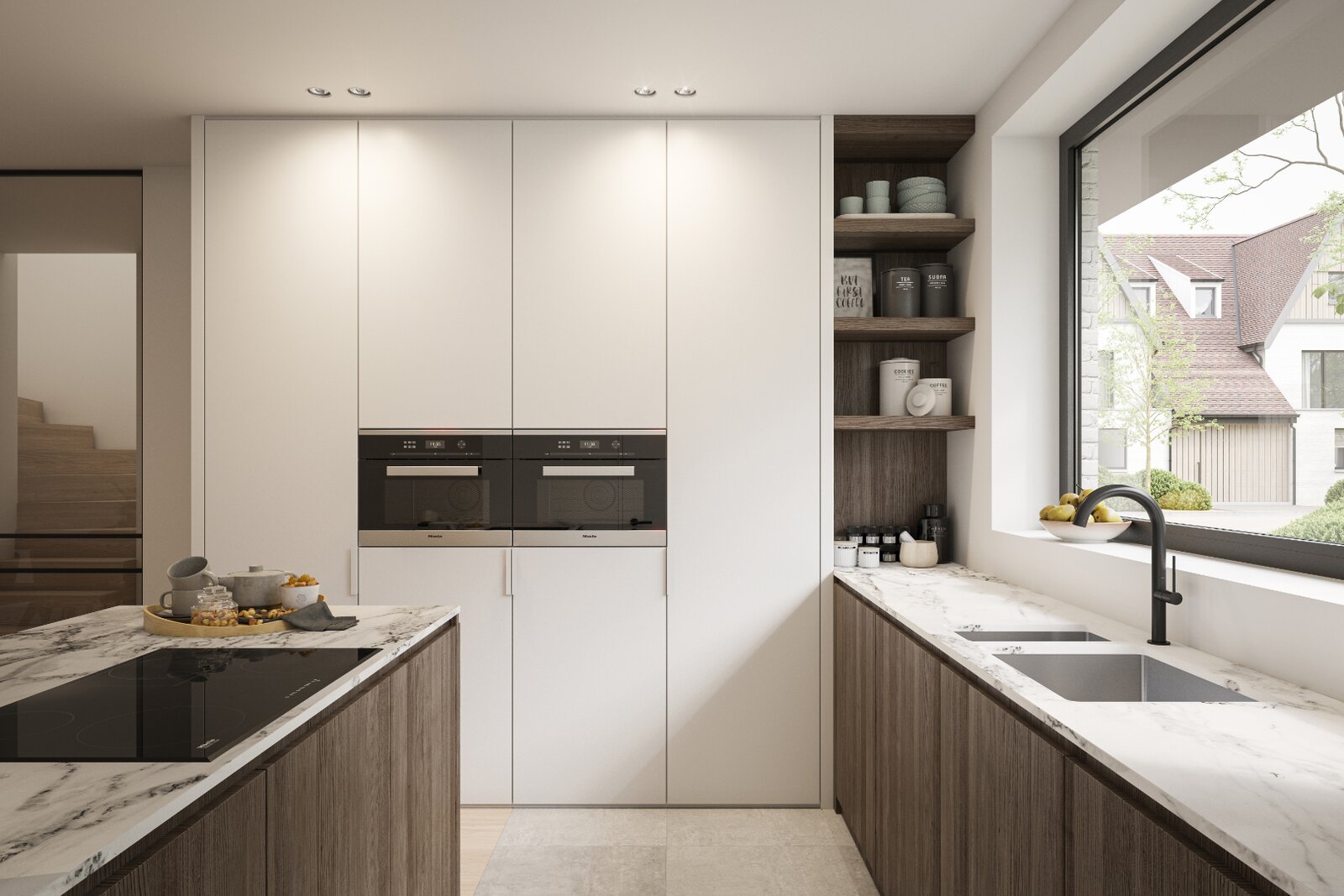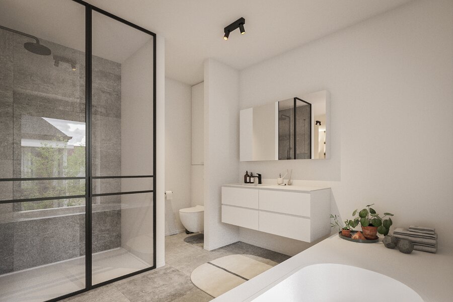 Ruime hal met trap, gastentoilet, vestiaire. Grote living met zicht op de tuin, eetruimte en keuken met aansluitende berging. Eerste verdieping: nachthal met toilet, een masterslaapkamer met badkamer en dressing. Een tweede en derde ruime slaapkamer met badkamer en terras. Tweede verdieping: ruime zolder. Grote ondergrondse garage met berging en parkeerplaats voor max. 3 wagens. Ruime kelder.