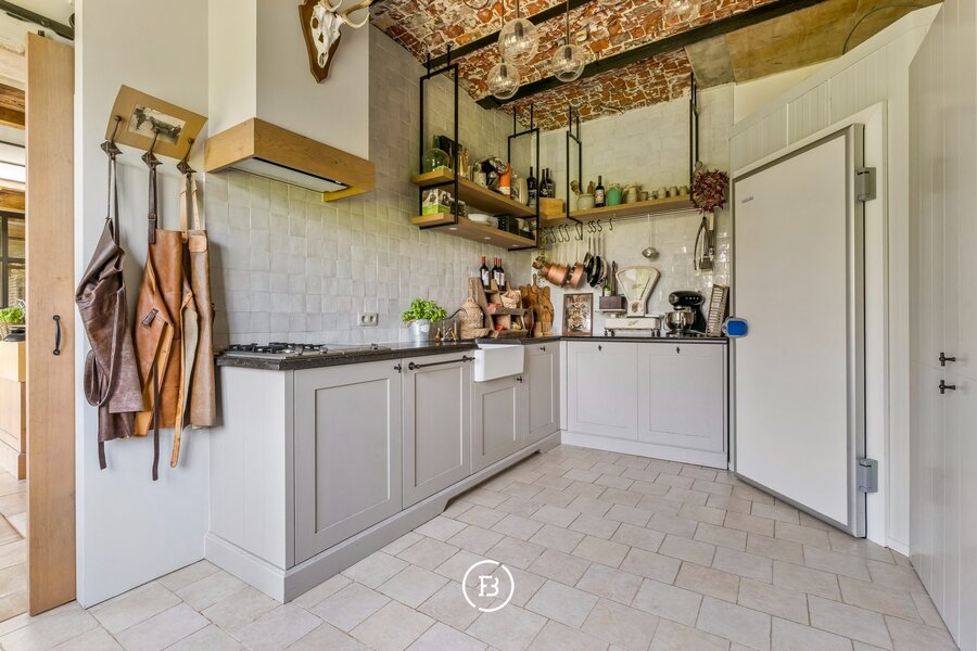 Het woongedeelte heeft een royale bewoonbare oppervlakte van 600 m² en biedt alle comfort en luxe. De ruime inkomhal verwelkomt u met een vestiaire en een gastentoilet, terwijl een lichtrijke bureauruimte uitzicht biedt op de prachtig aangelegde tuin. Verder vindt u op het gelijkvloers een praktische berg- en wasruimte met douche, een zithoek met open haard, een eetruimte, een moderne open keuken, en een volledig uitgeruste bijkeuken met koelcel. Buiten nodigen diverse terrassen uit om te genieten van de rust, het groen en de vijver die het domein omringen.