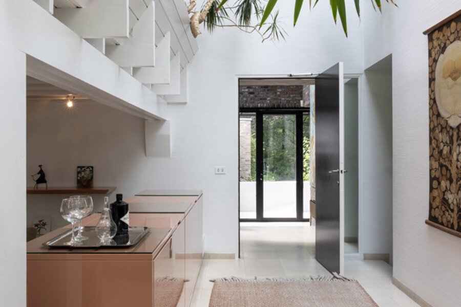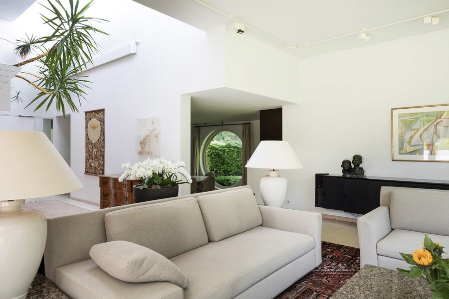 De lichtrijke hal zorgt voor een indrukwekkende entree met plafond in zichtbeton, vast tapijt en natuursteen. Binnen lopen de split-levels mooi in elkaar over: knusse zithoek met open haard, woonkamer met unieke raampartijen en fenomenaal tuinzicht, op niveau het 1ste bureau, supergezellige eetkamer met open haard én BBQ. Ernaast, de moderne keuken (Miele, Gaggenau) met bijkeuken. Het zonovergoten landgoed met tuin en tennisveld is een unieke plek voor spelende kinderen, rustzoekers, levensgenieters én sportievelingen.
