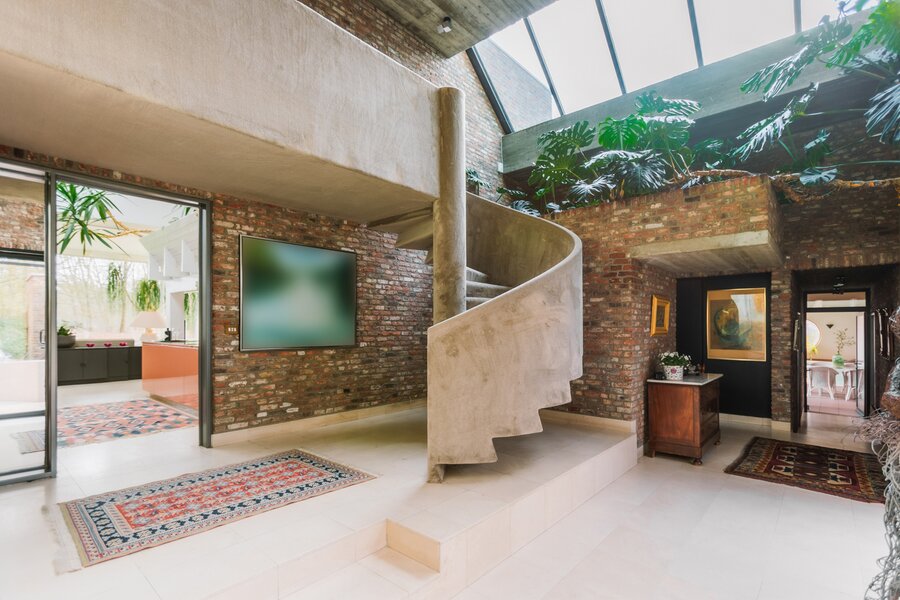 In 1975 ontwierp architect Paul Schellekens deze villa met boeiende contrasten in texturen, ruwe materialen, geometrische en massieve volumes, accentmuren in baksteen, split-levels... – de Turnhoutse School op haar best, én bovendien energetisch geoptimaliseerd met o.a. zonnepanelen, geothermische warmtepomp, isolatie, airco...