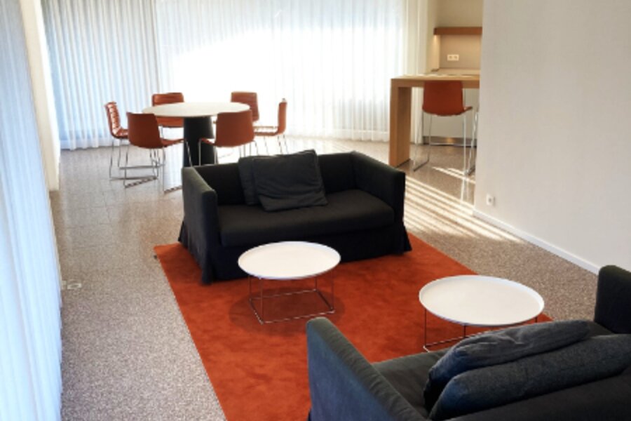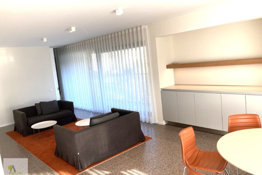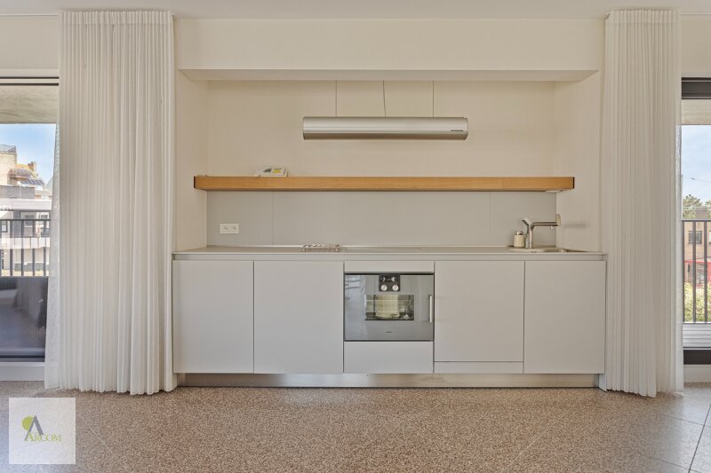 Indeling : inkomhall, toilet, technische ruimte /berging met aansluiting voor was-en droogkast, royale lichtrijke living omgeven door grote glaspartijen uitgevend op een fantastisch groot terras, open ingerichte kwalitatieve keuken (Bulthaup 1) voorzien van alle hedendaagse toestellen, 2 slaapkamers + slaaphoek -