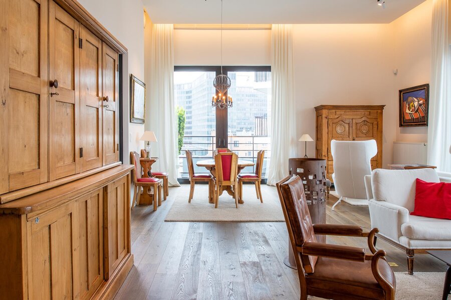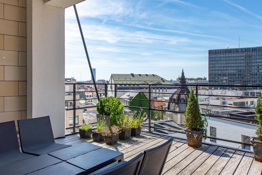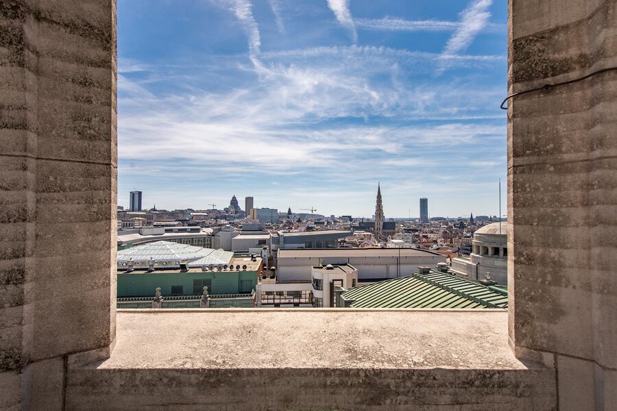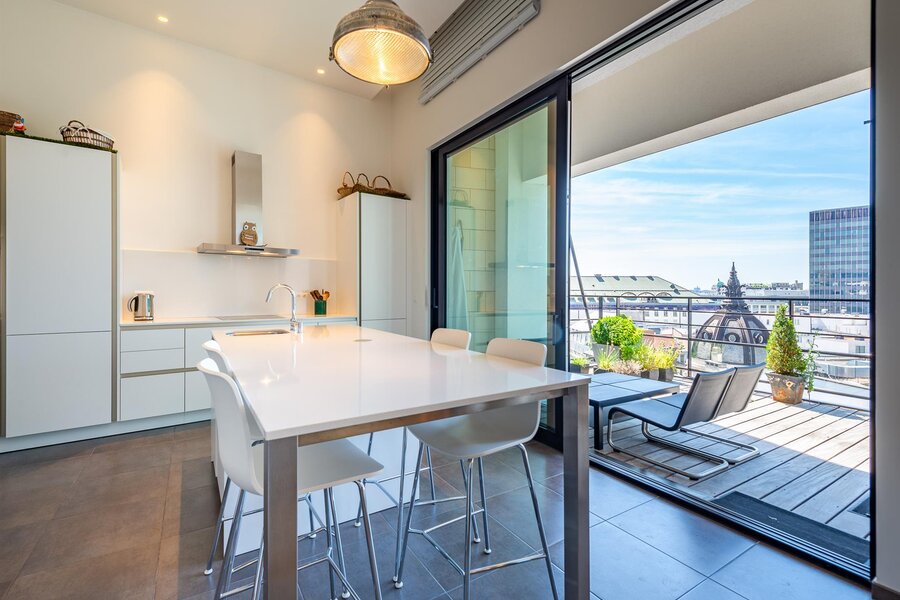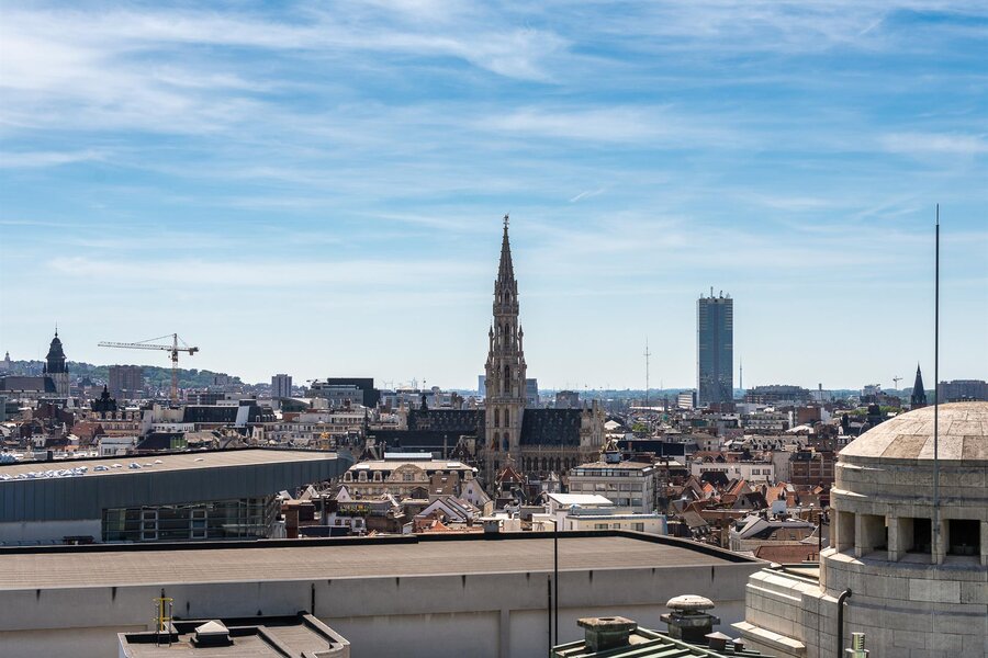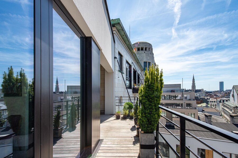 Op een steenworp afstand van de historische stadswijken, in een emblematisch gebouw, een penthouse van ongeveer 200 m² met een terras van 23 m² en een ononderbroken uitzicht over Brussel.