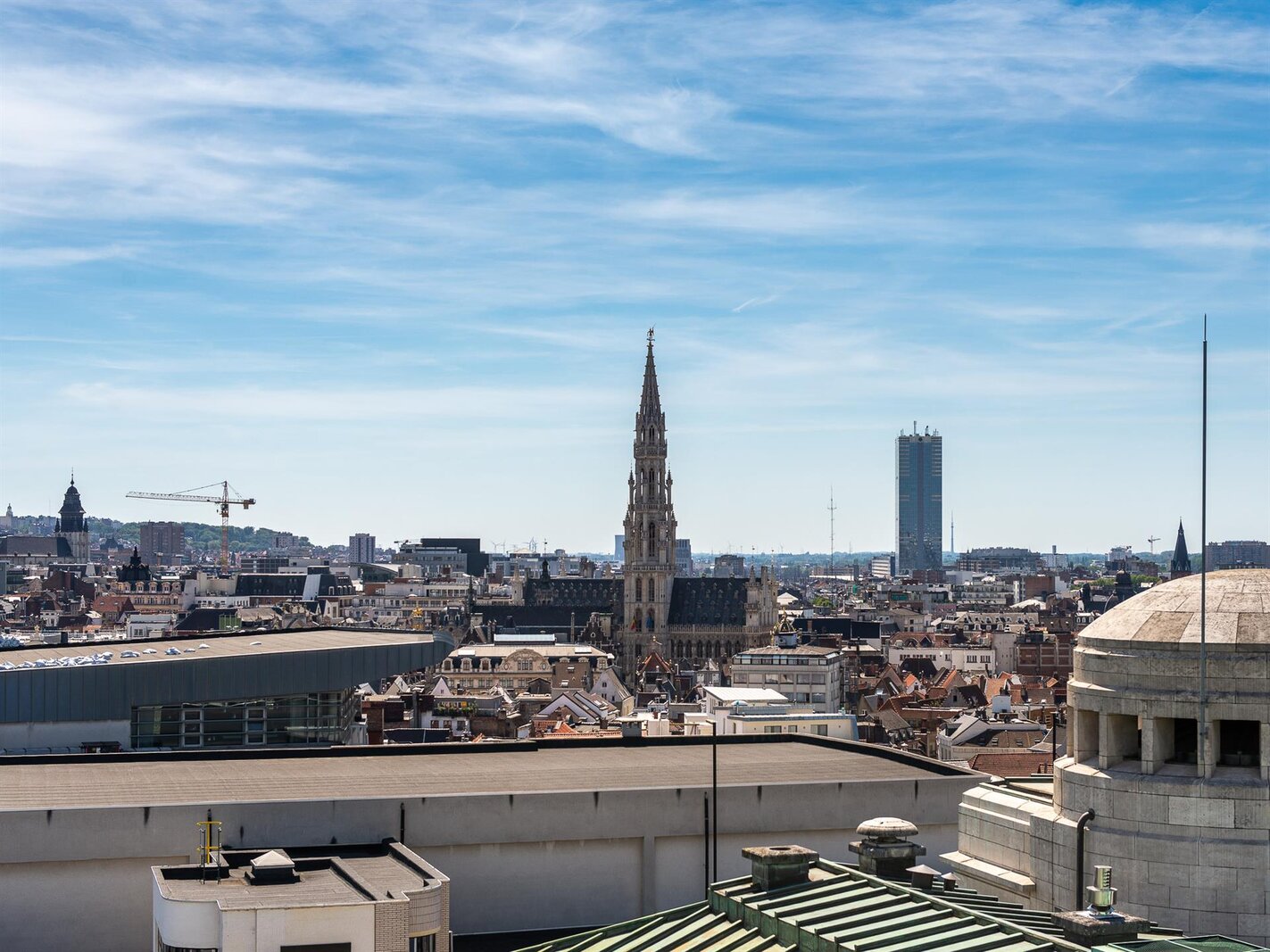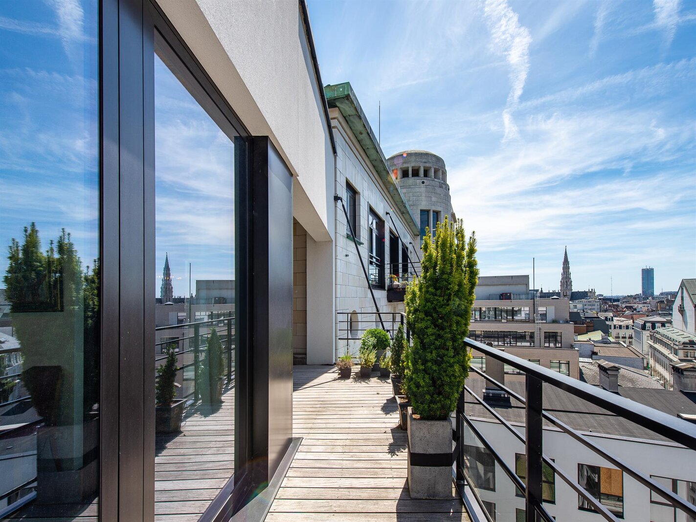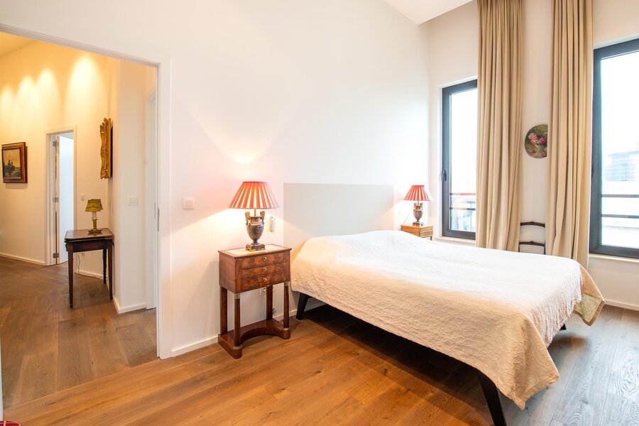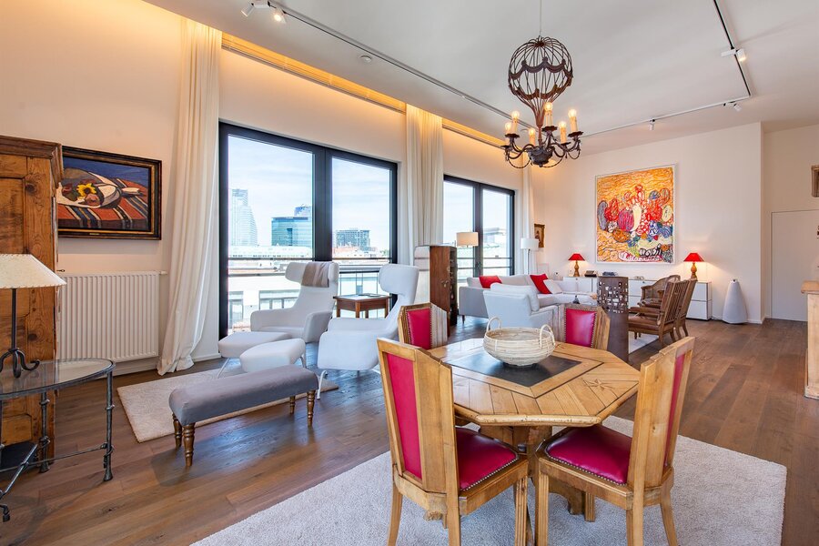 Op een steenworp afstand van de historische stadswijken, in een emblematisch gebouw, een penthouse van ongeveer 200 m² met een terras van 23 m² en een ononderbroken uitzicht over Brussel.