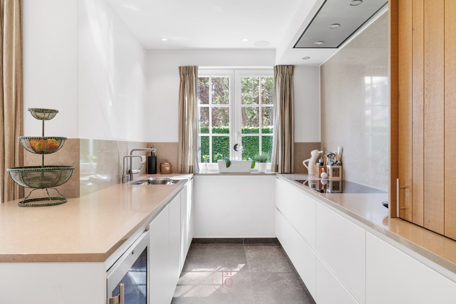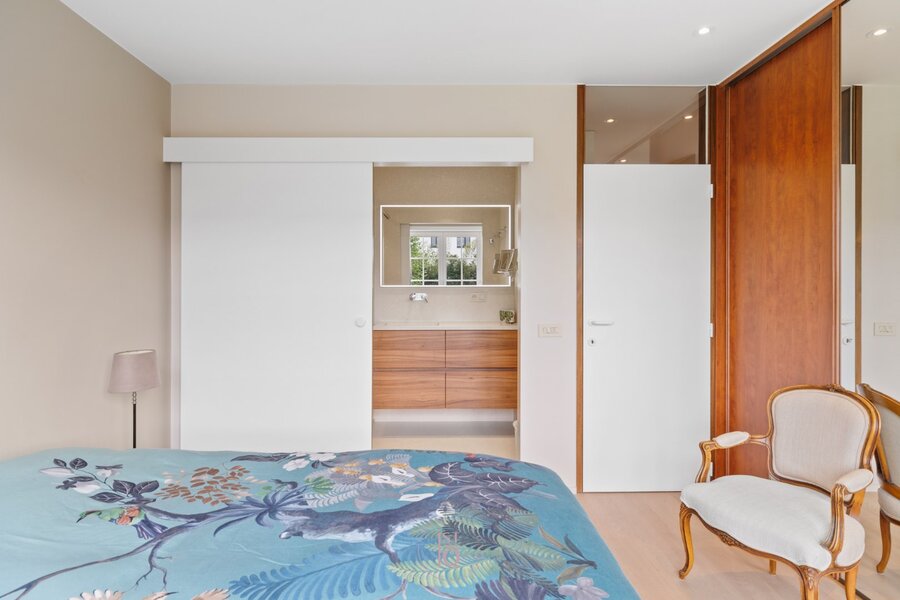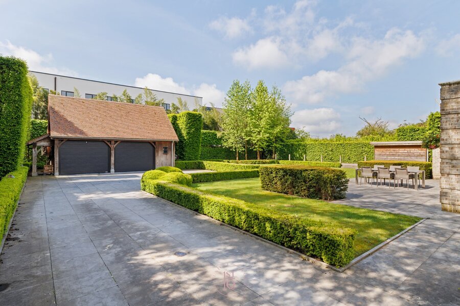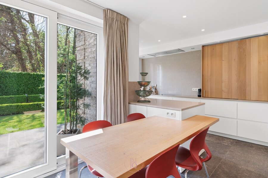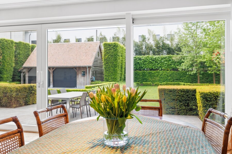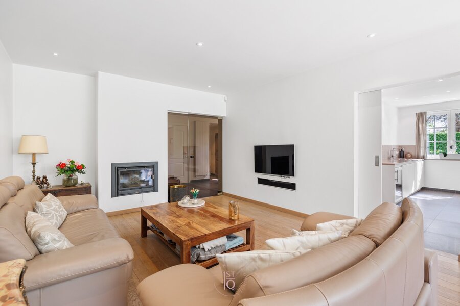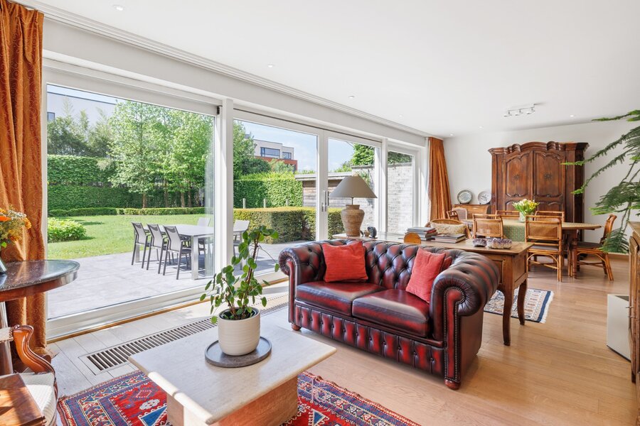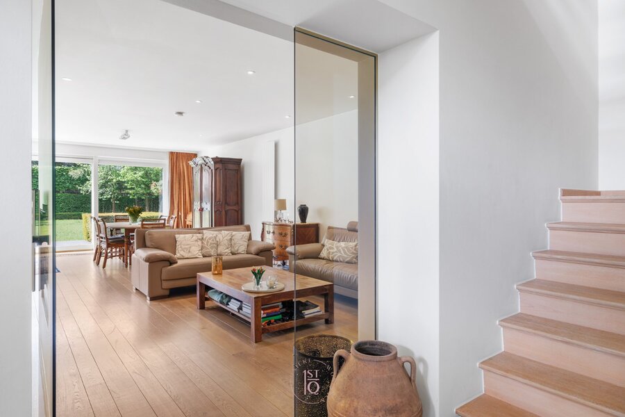 De prachtige leefruimte is het hart van het huis, met een parketvloer van topkwaliteit, een sfeervolle haard en grote glaspartijen die natuurlijk licht binnenlaten en uitzicht bieden op de aangelegde tuin. Deze grote privétuin is een rustig toevluchtsoord aan de rand van de stad, met een petanquebaan en verschillende hoekjes om te ontspannen en te genieten van de buitenlucht.