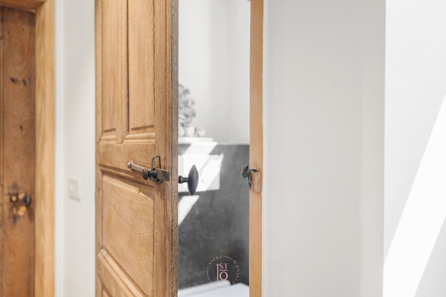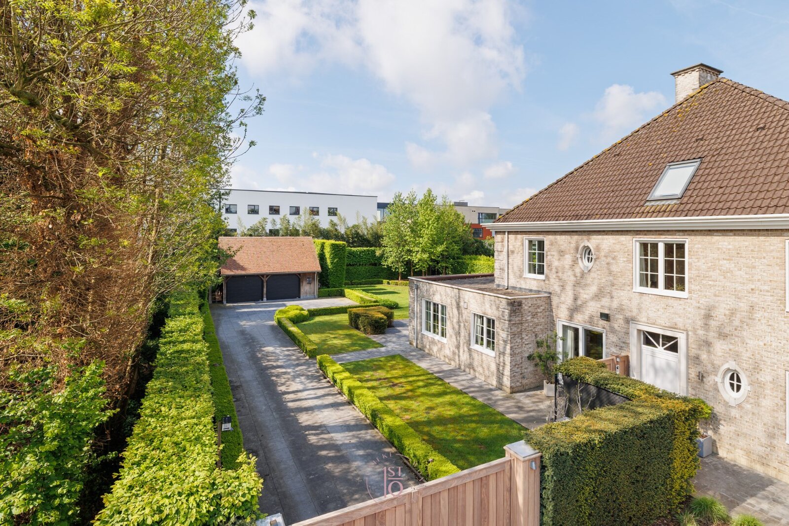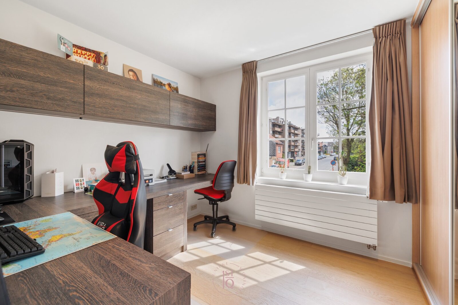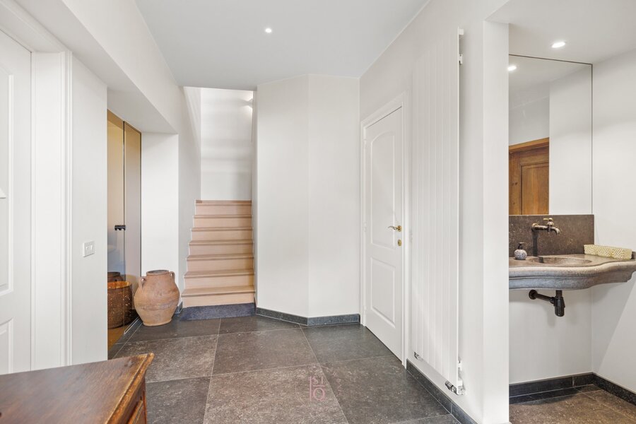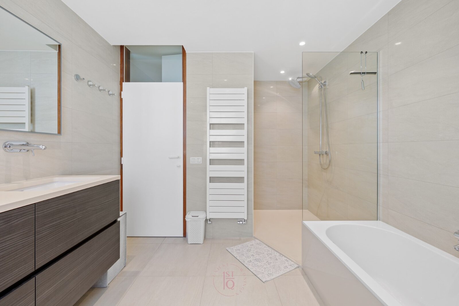 De prachtige leefruimte is het hart van het huis, met een parketvloer van topkwaliteit, een sfeervolle haard en grote glaspartijen die natuurlijk licht binnenlaten en uitzicht bieden op de aangelegde tuin. Deze grote privétuin is een rustig toevluchtsoord aan de rand van de stad, met een petanquebaan en verschillende hoekjes om te ontspannen en te genieten van de buitenlucht.