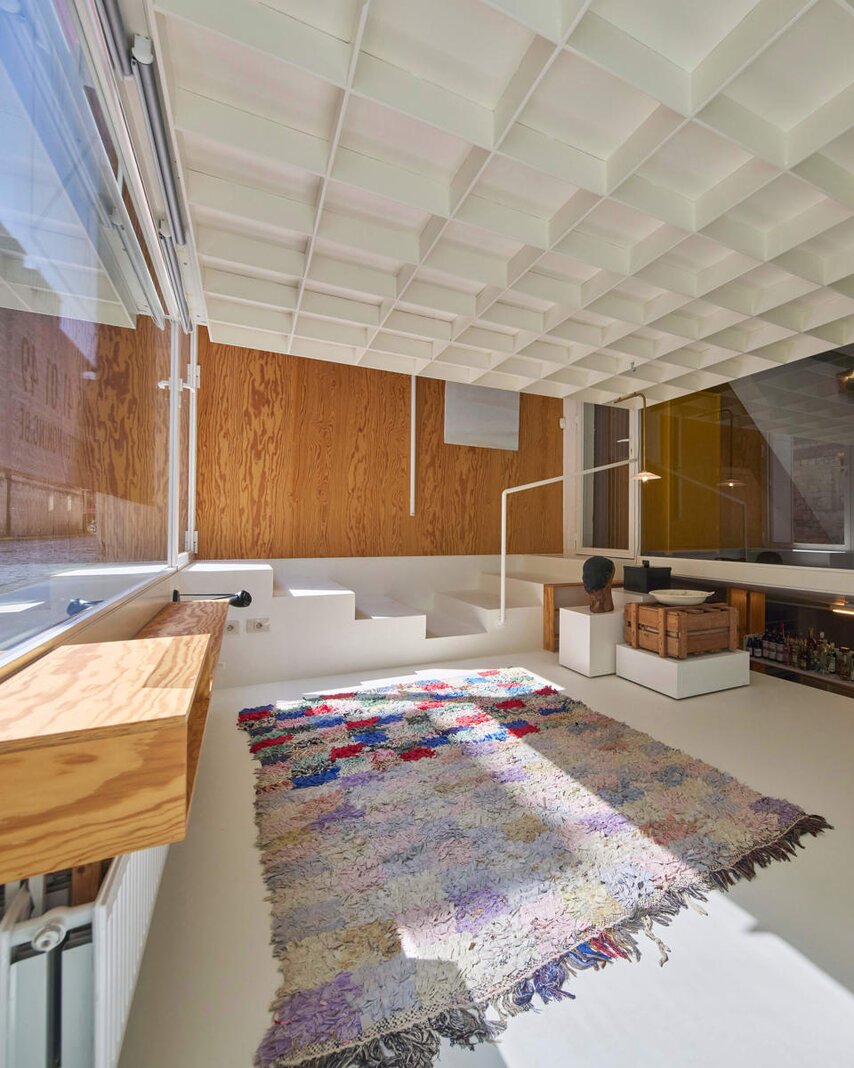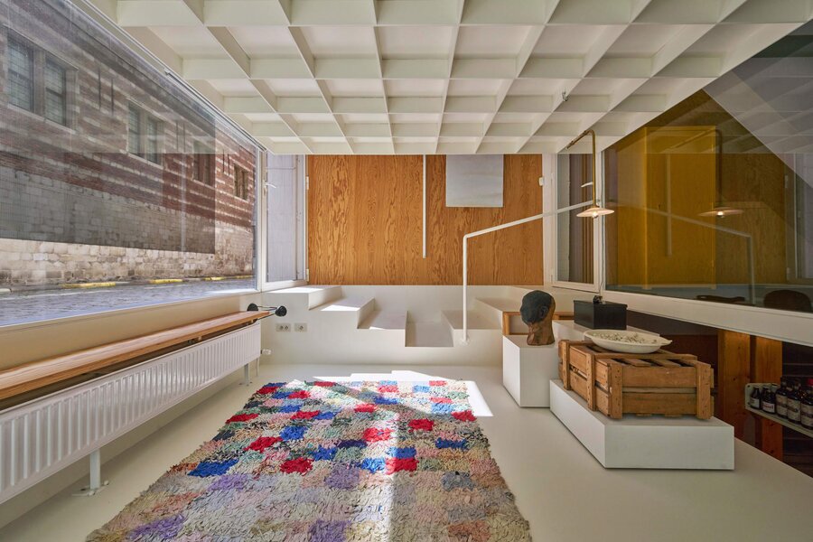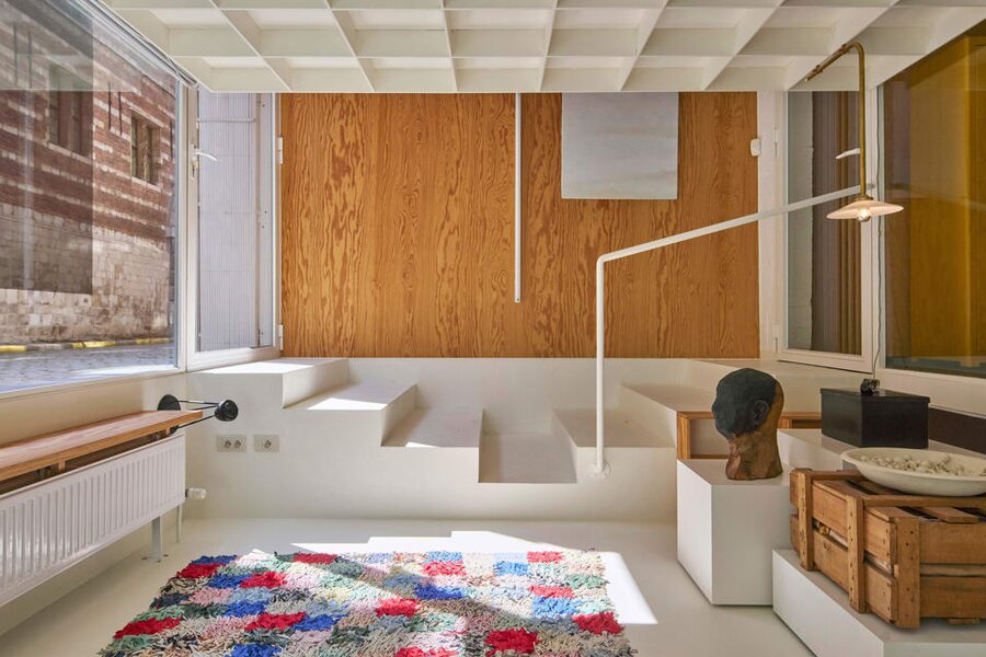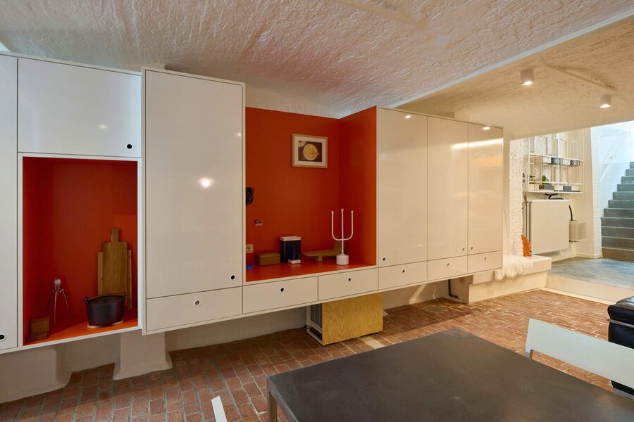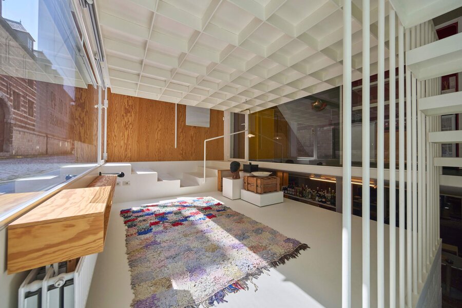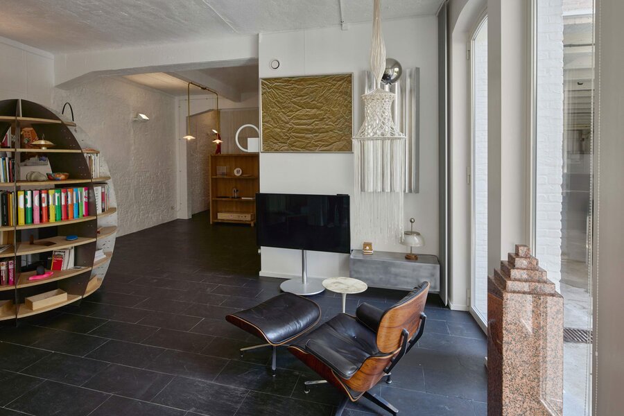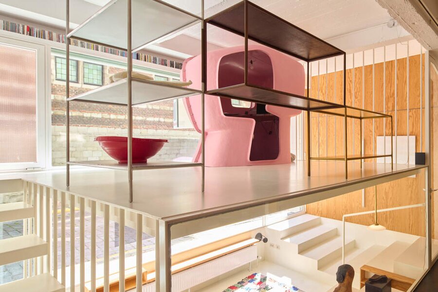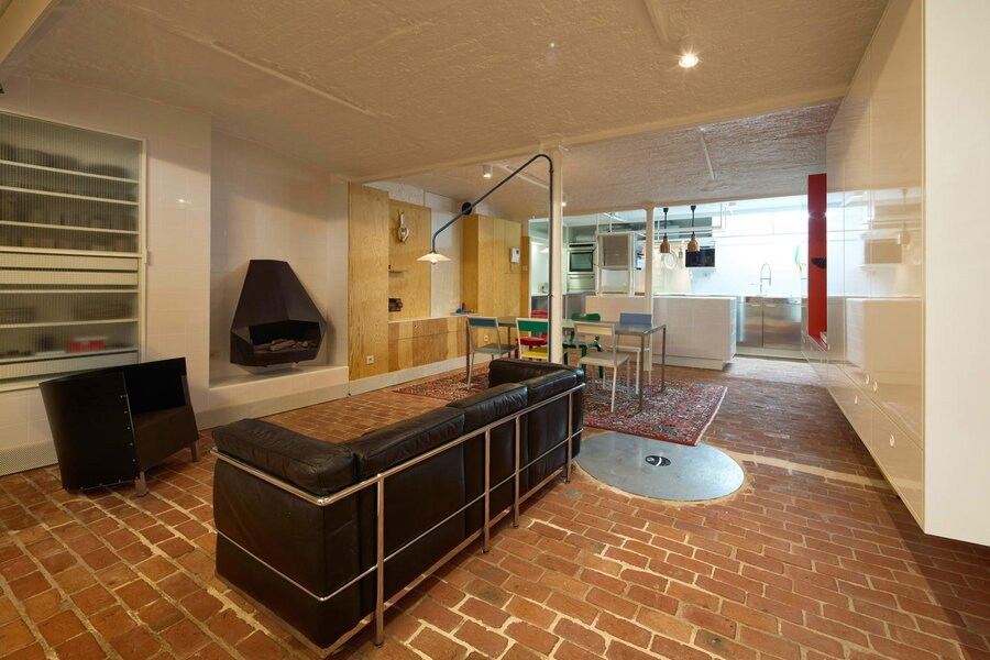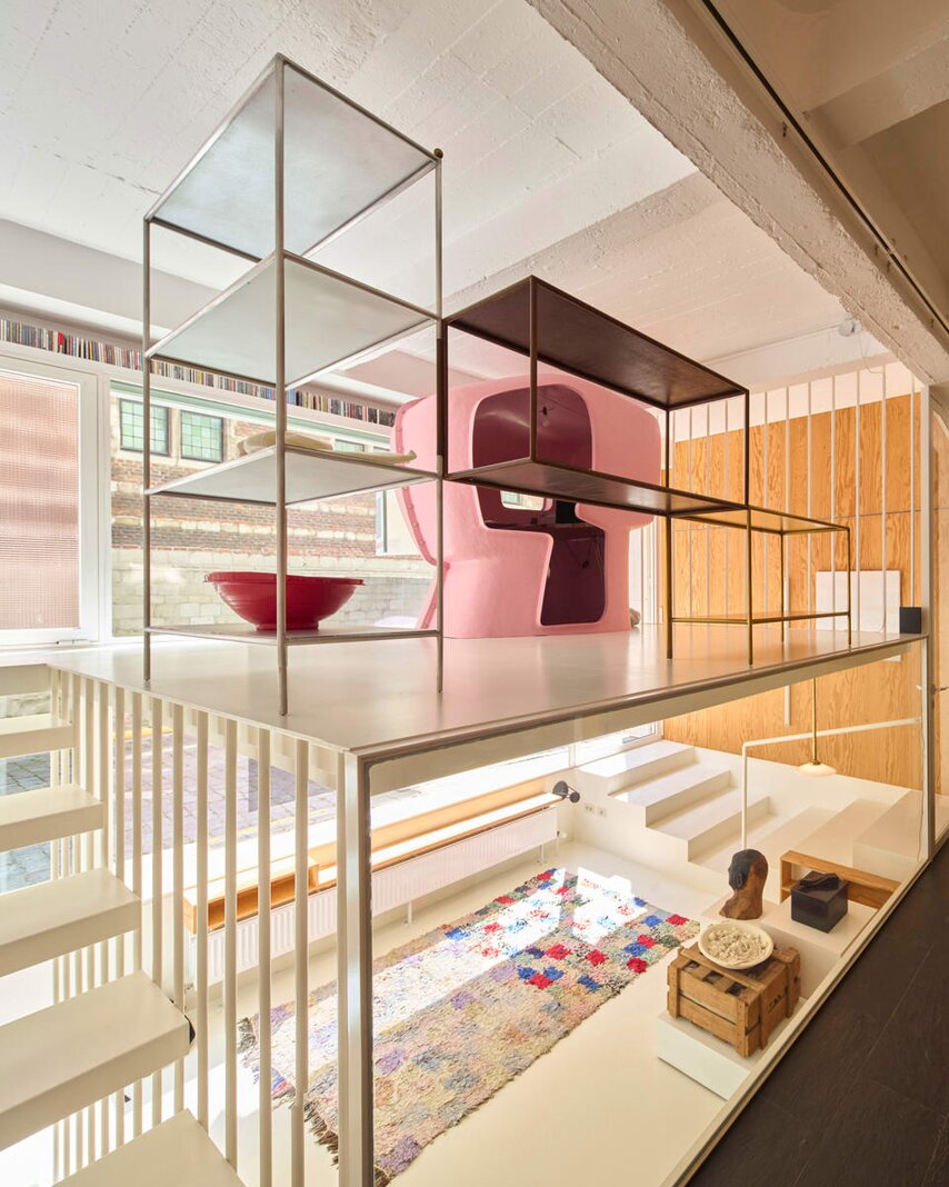 Het loftconcept is hier radicaal doorgetrokken: een pure loft zonder binnenmuren, een open spel van volumes, licht en niveauverschillen. De ruimte is verdeeld over drie niveaus: een open gelijkvloers met indrukwekkende plafondhoogte, een stalen split-level geïnspireerd op scheepsbouw – ultradunne vloerplaat en visuele lichtheid – en een karatervolle souterrain uit 1800, verborgen onder een gebouw uit 1933. Omdat er aanvankelijk geen daglicht tot in de kelder drong, werd bewust een split-level gecreëerd dat licht diep de ruimte in trekt.