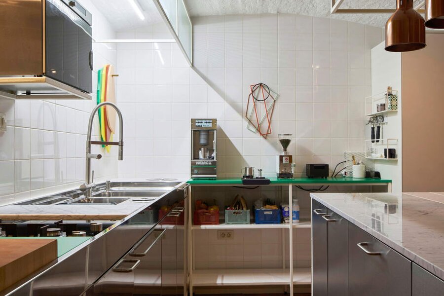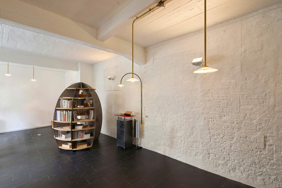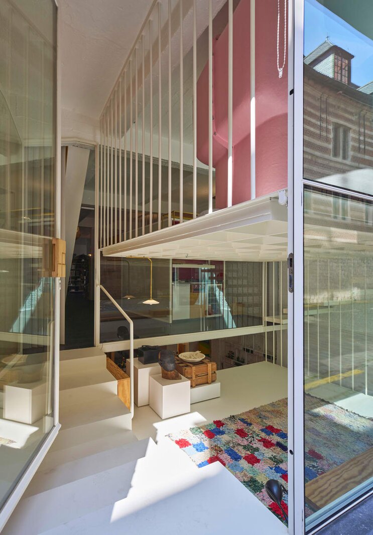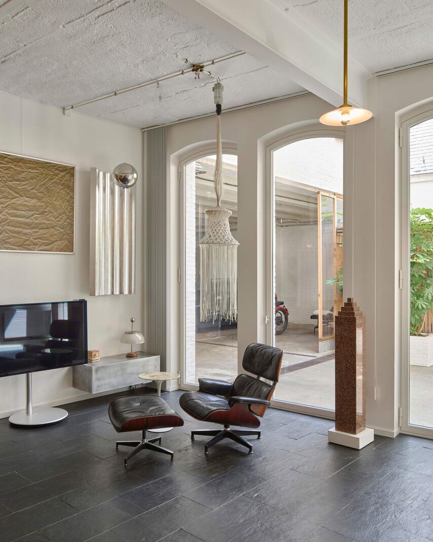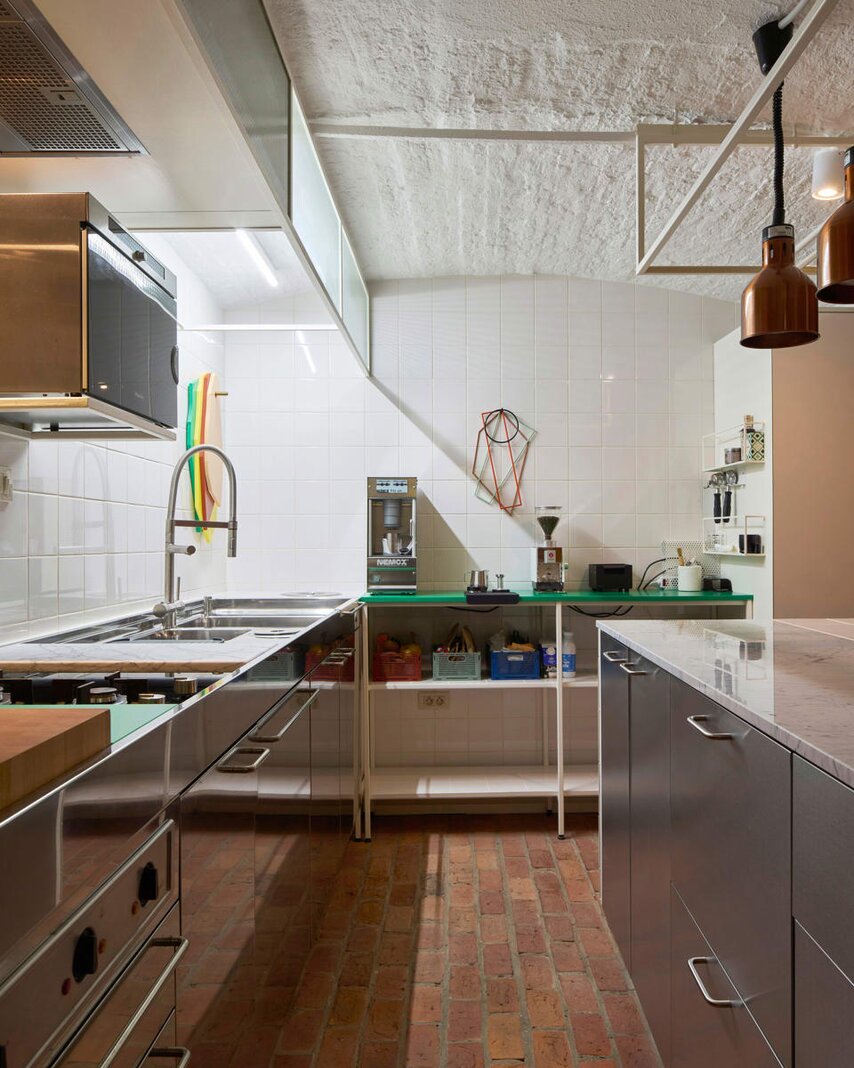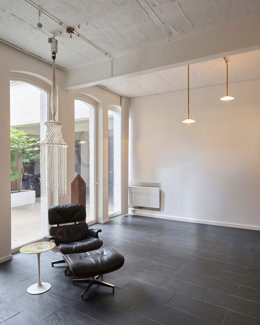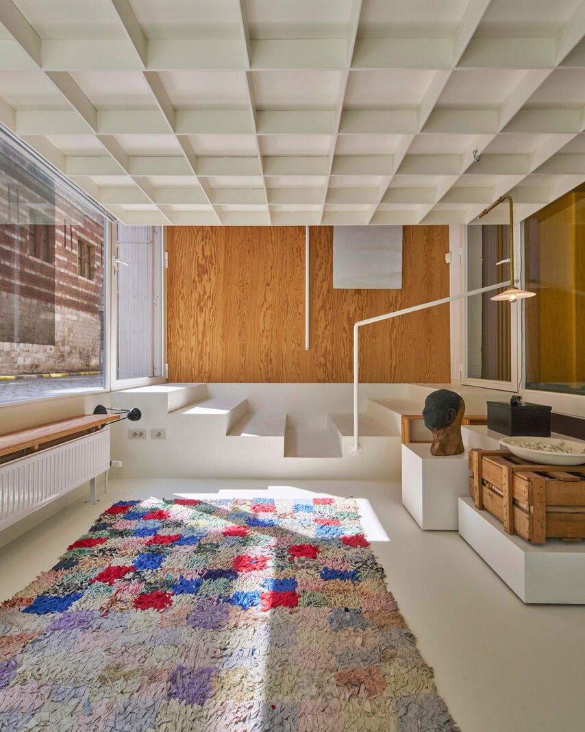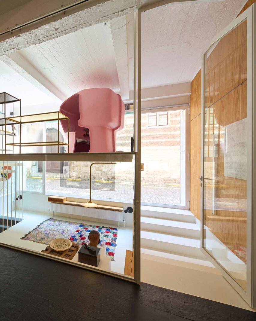 Het loftconcept is hier radicaal doorgetrokken: een pure loft zonder binnenmuren, een open spel van volumes, licht en niveauverschillen. De ruimte is verdeeld over drie niveaus: een open gelijkvloers met indrukwekkende plafondhoogte, een stalen split-level geïnspireerd op scheepsbouw – ultradunne vloerplaat en visuele lichtheid – en een karatervolle souterrain uit 1800, verborgen onder een gebouw uit 1933. Omdat er aanvankelijk geen daglicht tot in de kelder drong, werd bewust een split-level gecreëerd dat licht diep de ruimte in trekt.
