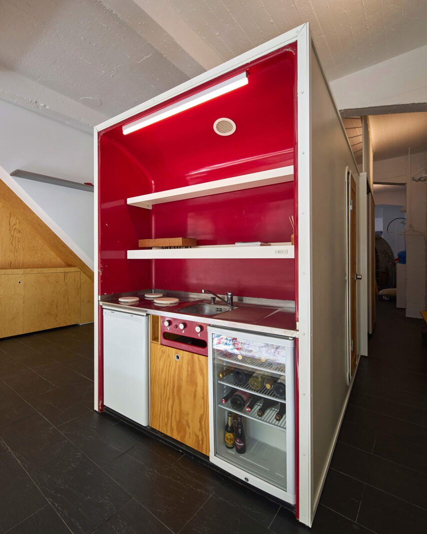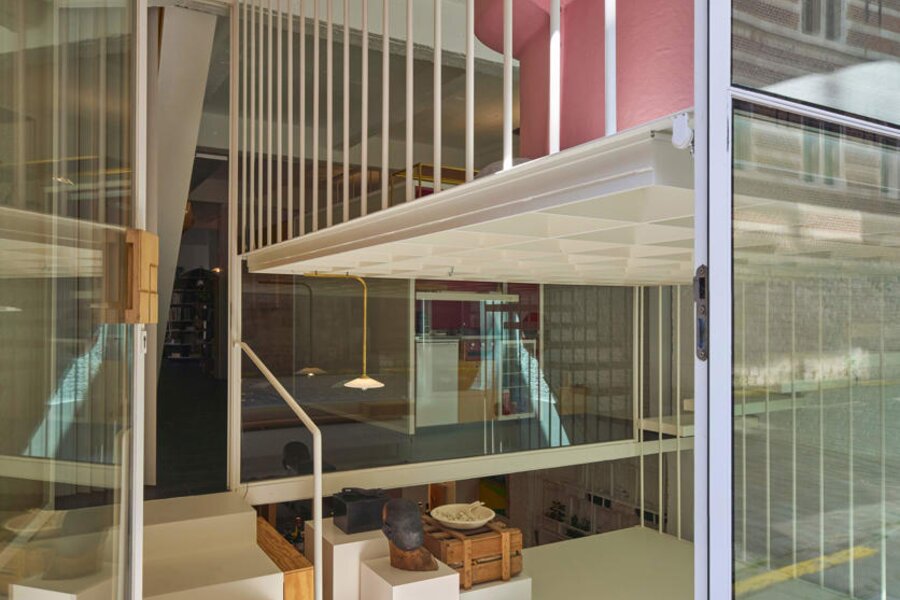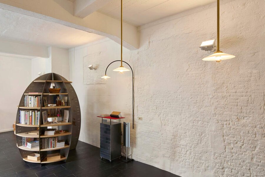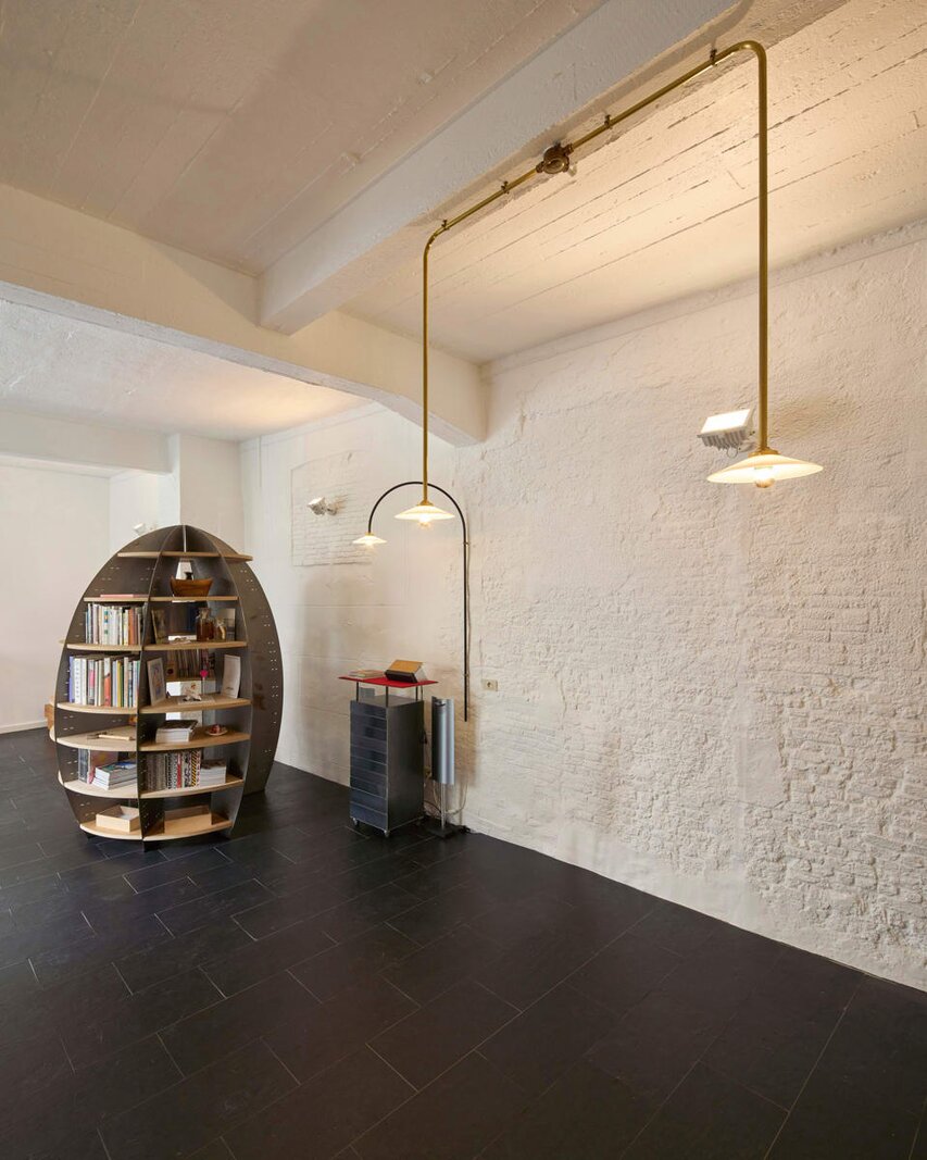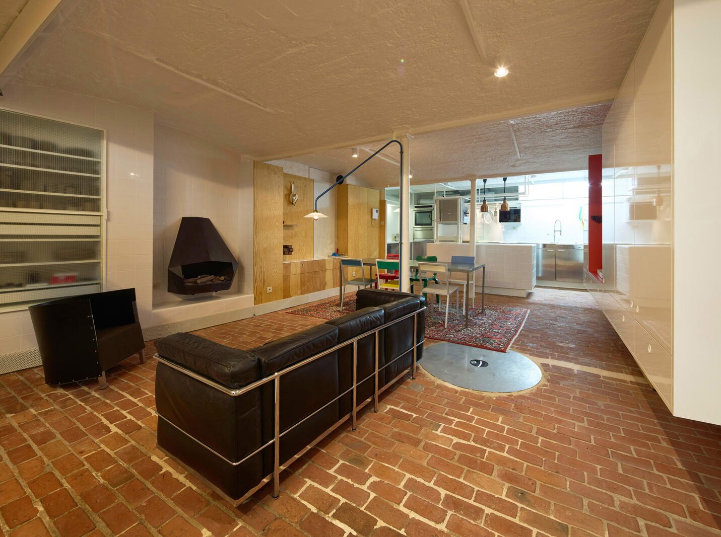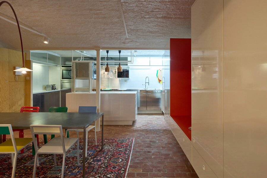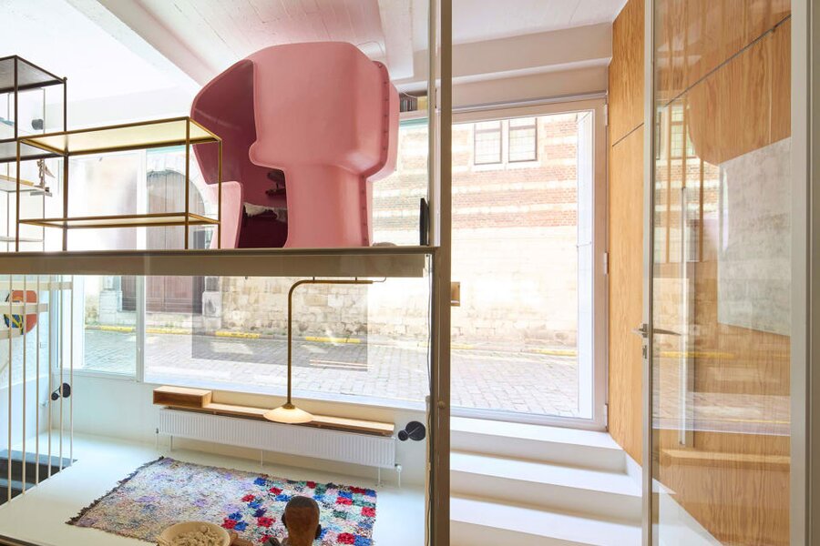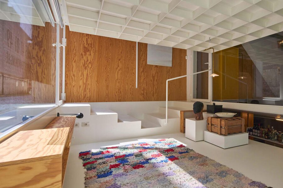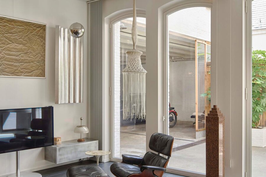 Het loftconcept is hier radicaal doorgetrokken: een pure loft zonder binnenmuren, een open spel van volumes, licht en niveauverschillen. De ruimte is verdeeld over drie niveaus: een open gelijkvloers met indrukwekkende plafondhoogte, een stalen split-level geïnspireerd op scheepsbouw – ultradunne vloerplaat en visuele lichtheid – en een karatervolle souterrain uit 1800, verborgen onder een gebouw uit 1933. Omdat er aanvankelijk geen daglicht tot in de kelder drong, werd bewust een split-level gecreëerd dat licht diep de ruimte in trekt.