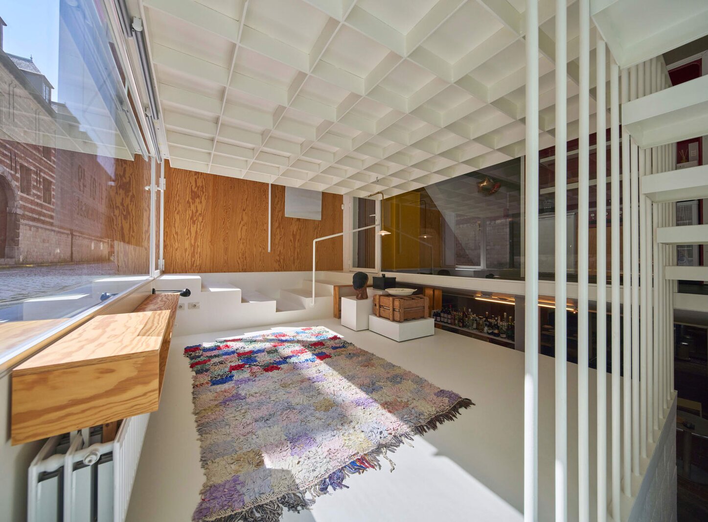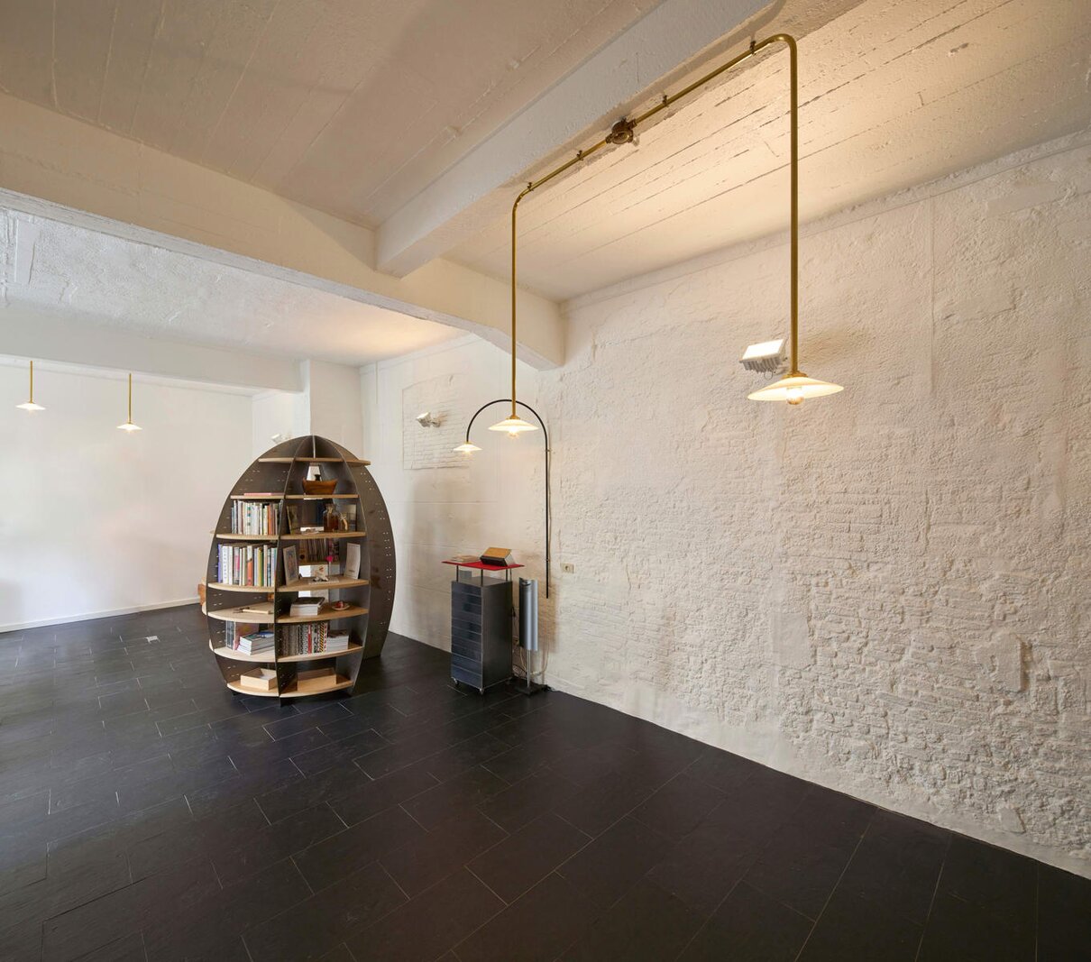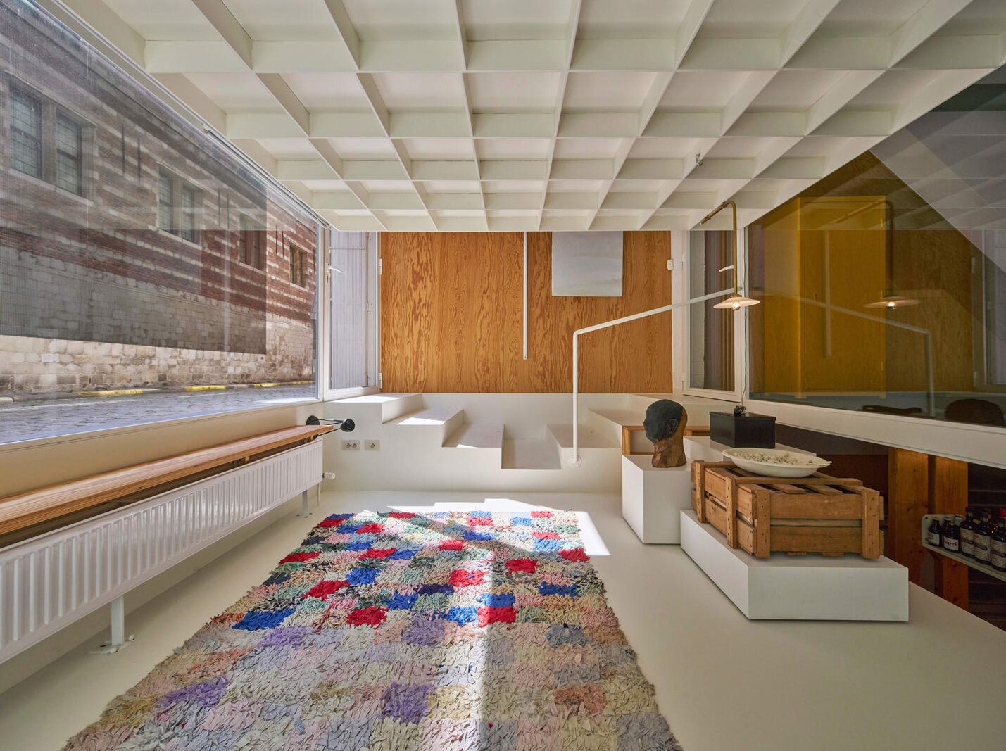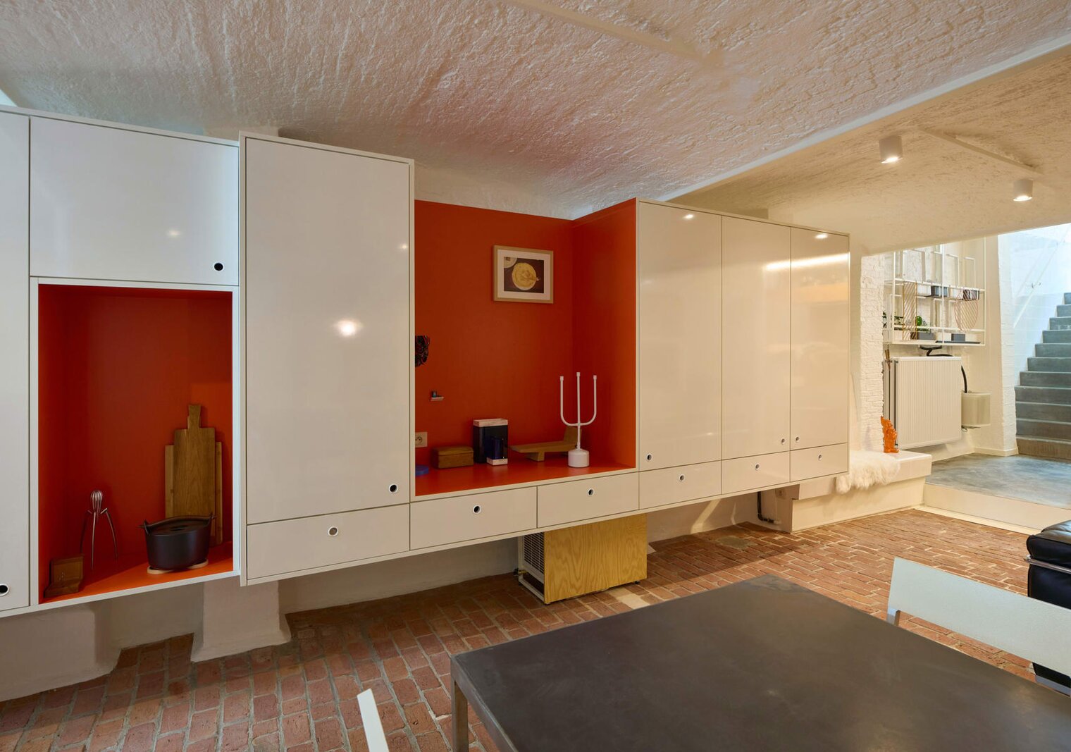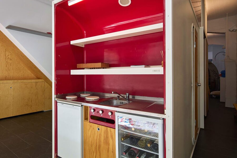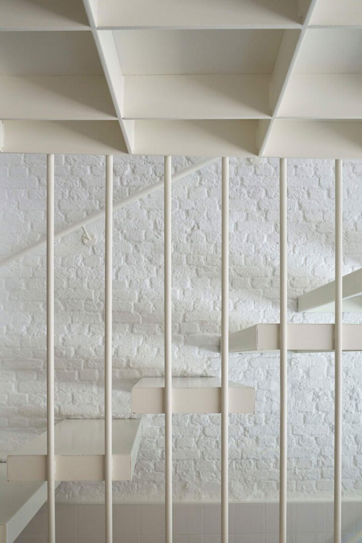 Het loftconcept is hier radicaal doorgetrokken: een pure loft zonder binnenmuren, een open spel van volumes, licht en niveauverschillen. De ruimte is verdeeld over drie niveaus: een open gelijkvloers met indrukwekkende plafondhoogte, een stalen split-level geïnspireerd op scheepsbouw – ultradunne vloerplaat en visuele lichtheid – en een karatervolle souterrain uit 1800, verborgen onder een gebouw uit 1933. Omdat er aanvankelijk geen daglicht tot in de kelder drong, werd bewust een split-level gecreëerd dat licht diep de ruimte in trekt.