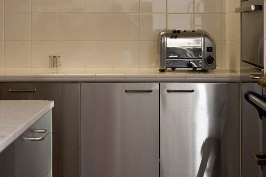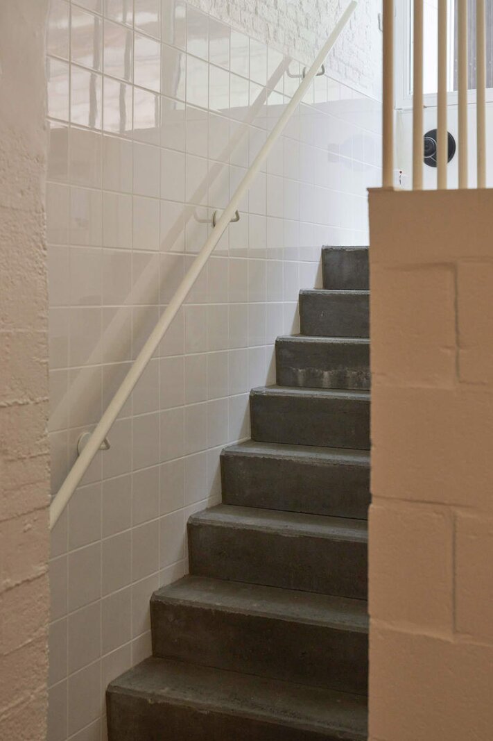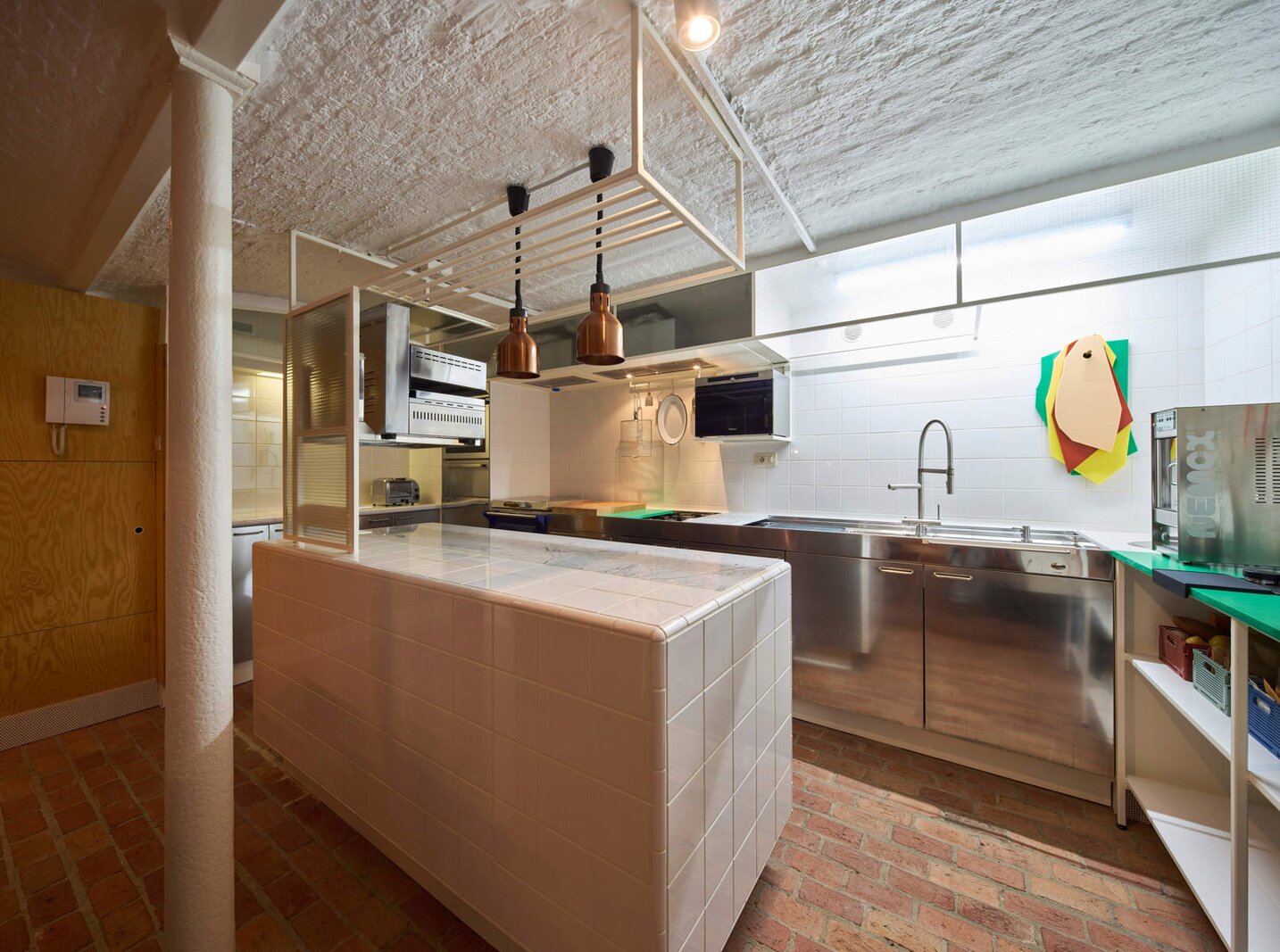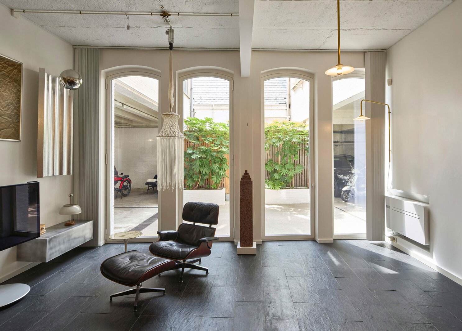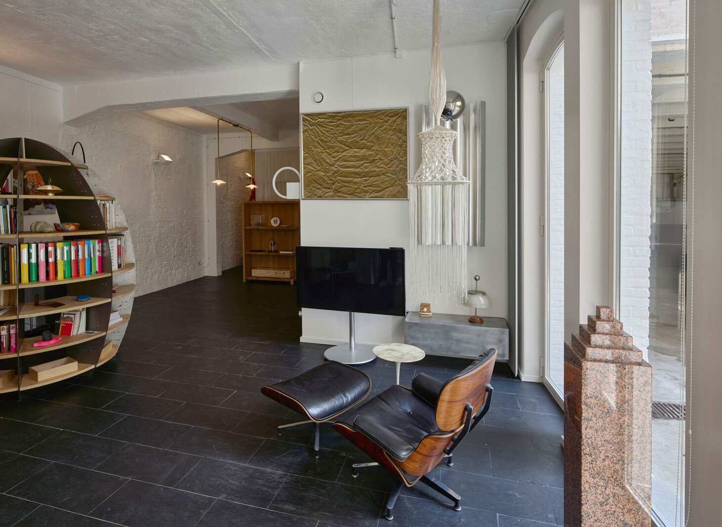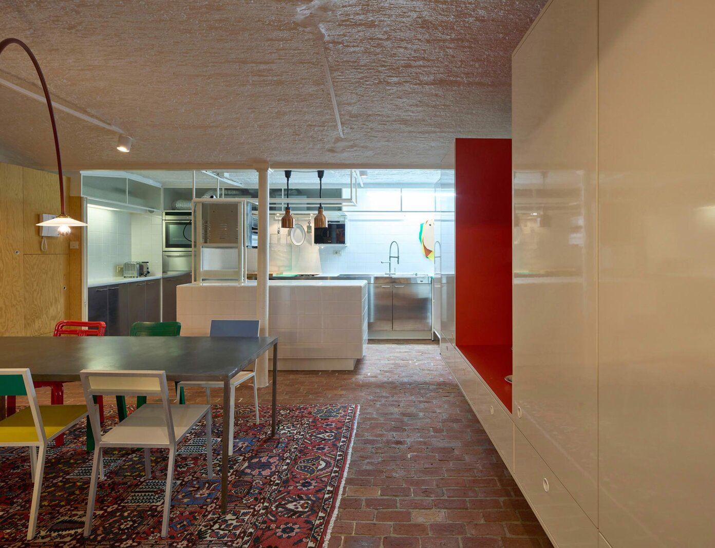 Het loftconcept is hier radicaal doorgetrokken: een pure loft zonder binnenmuren, een open spel van volumes, licht en niveauverschillen. De ruimte is verdeeld over drie niveaus: een open gelijkvloers met indrukwekkende plafondhoogte, een stalen split-level geïnspireerd op scheepsbouw – ultradunne vloerplaat en visuele lichtheid – en een karatervolle souterrain uit 1800, verborgen onder een gebouw uit 1933. Omdat er aanvankelijk geen daglicht tot in de kelder drong, werd bewust een split-level gecreëerd dat licht diep de ruimte in trekt.