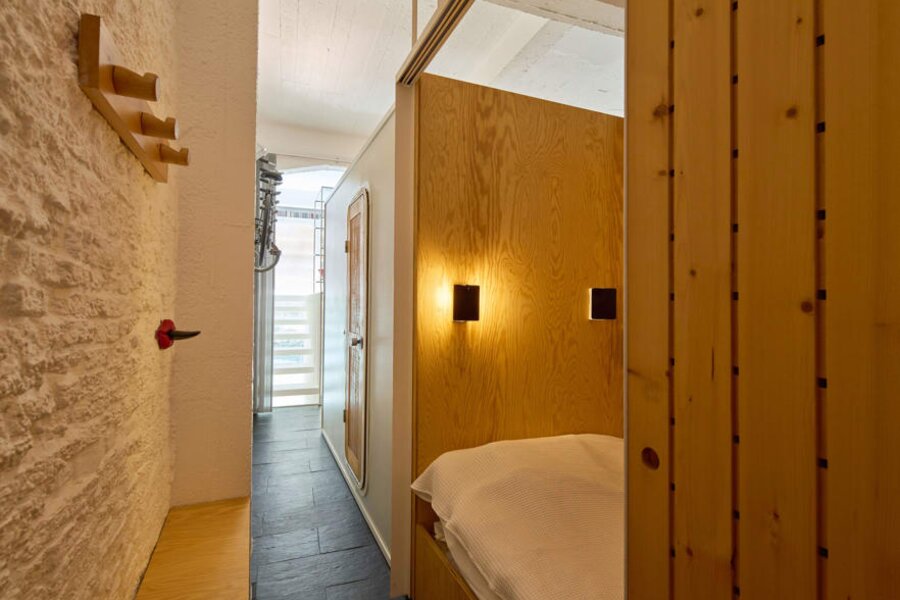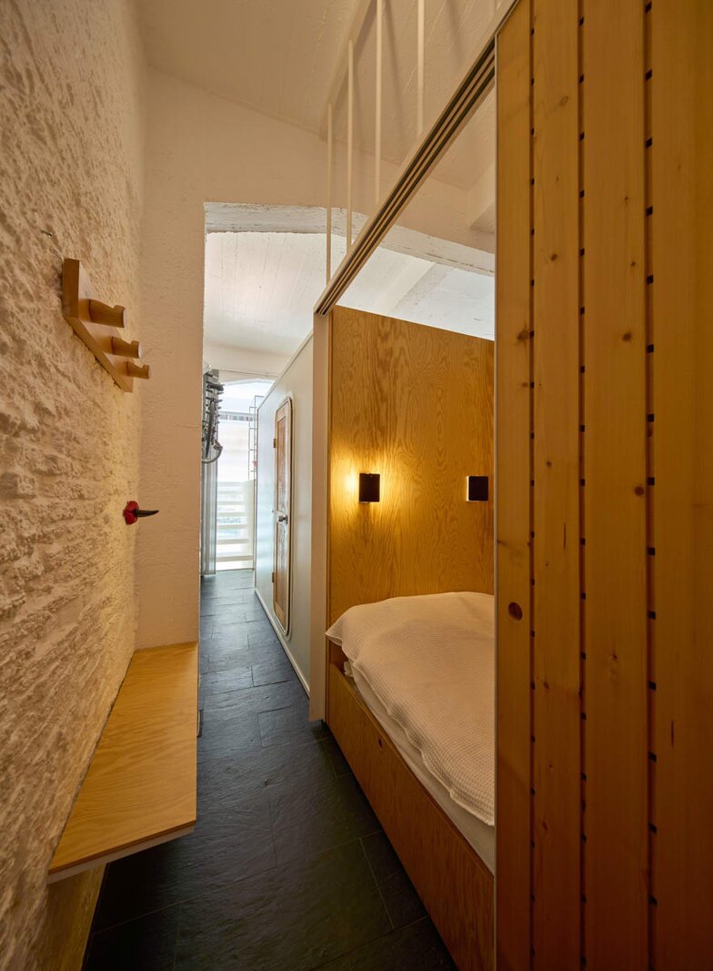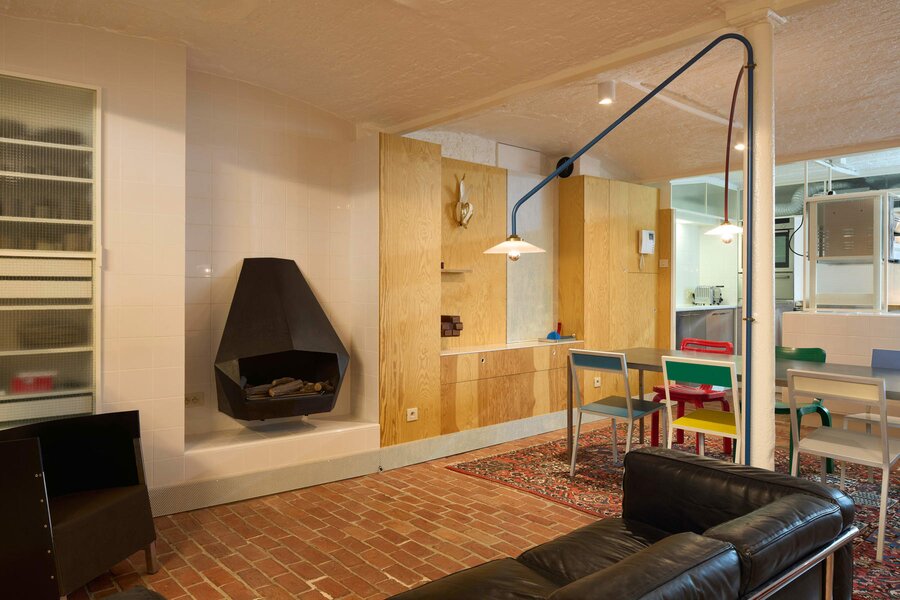Op het gelijkvloers zorgen modules voor karakter: een originele sanitaire unit van Charlotte Perriand ontworpen voor Les Arcs 1800 en een slaapunit op maat, beide verplaatsbaar. Overal zorgen stalen ramen met veiligheidsglas en schaarhekken voor een industriële look met comfort.