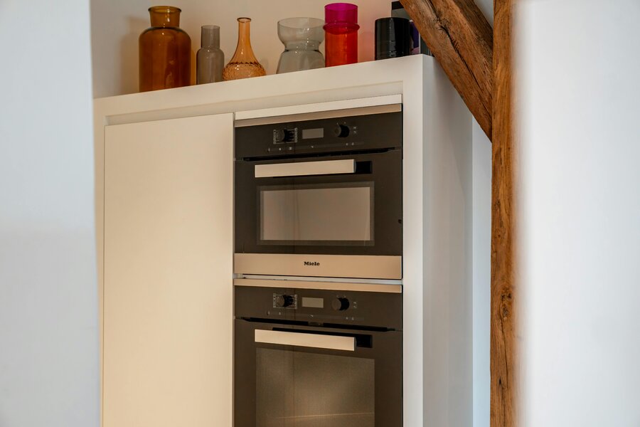 - Leefruimte en ingerichte keuken, en aansluitende berging, met prachtig uitzicht op de Stadsschouwburg;