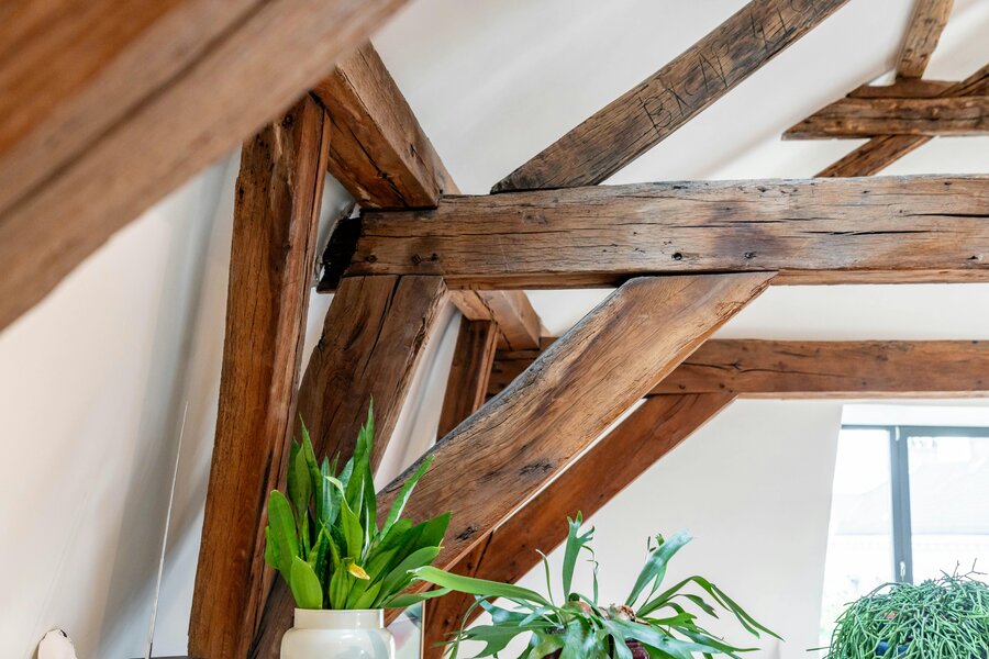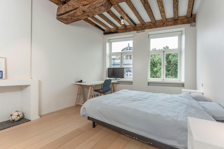 - Slaapkamer 2 en 3 met authentieke balken en zicht op de Stadsschouwburg