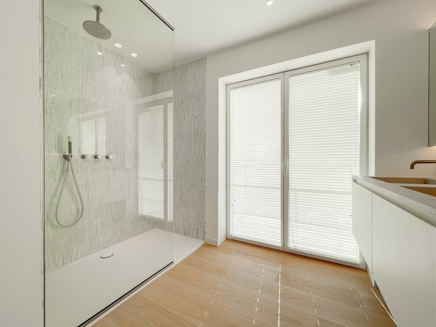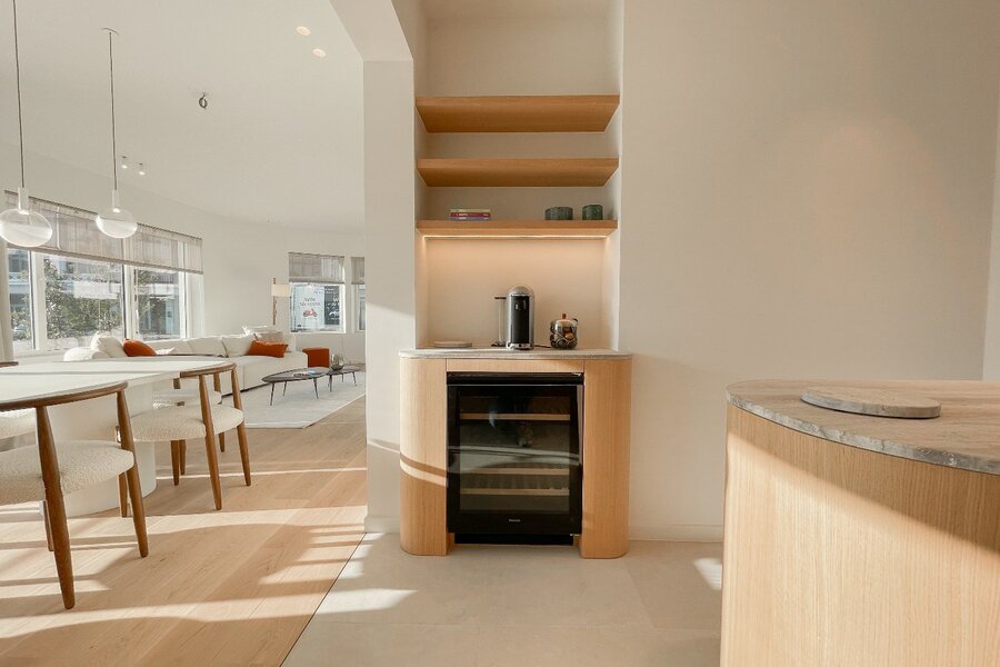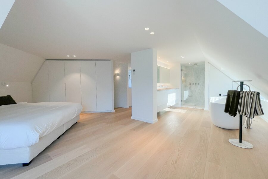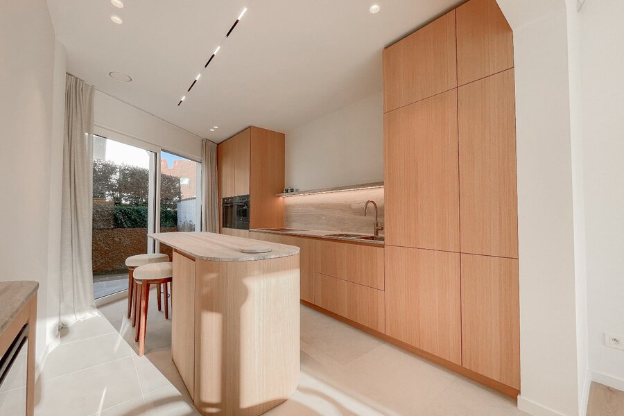 Bij het betreden van de woning komt u in een ruime inkomhal met gastentoilet en vestiaire. De lichtrijke leefruimte omvat een gezellige salon en eetkamer, die uitgeven op een westgericht terras. De open, volledig uitgeruste keuken is voorzien van Miele-toestellen (oven, combi-oven, wijnkast, koelkast, vaatwasser) en een Quooker-kraan. Vanuit de keuken heeft u directe toegang tot een tweede terras en de fraai aangelegde achtertuin, die is uitgerust met sfeerverlichting en een automatisch besproeiingssysteem.