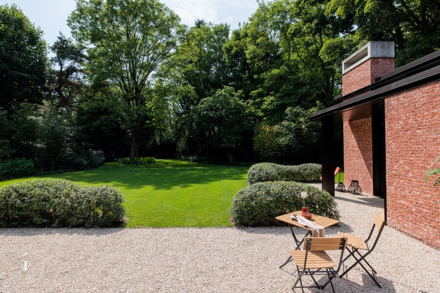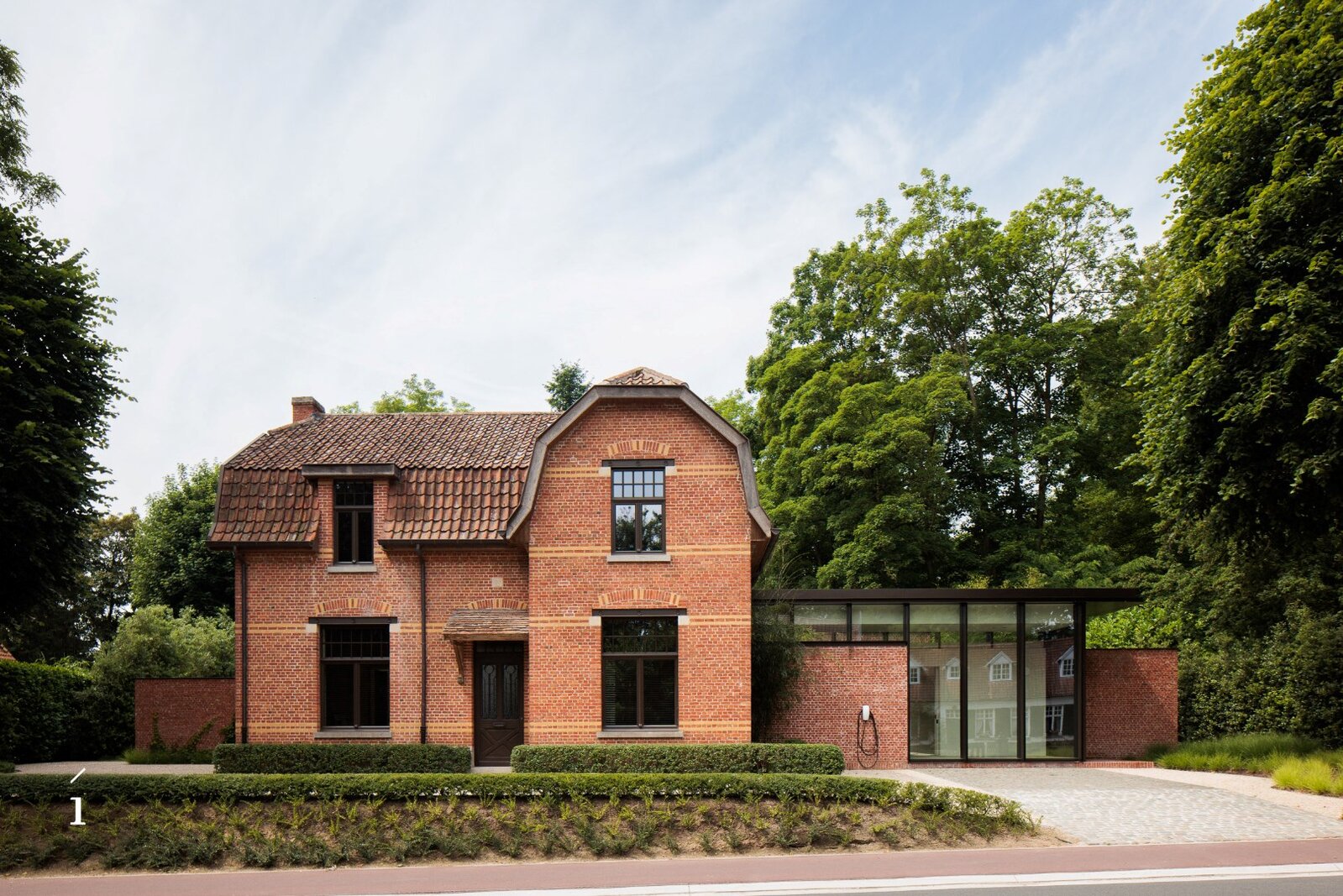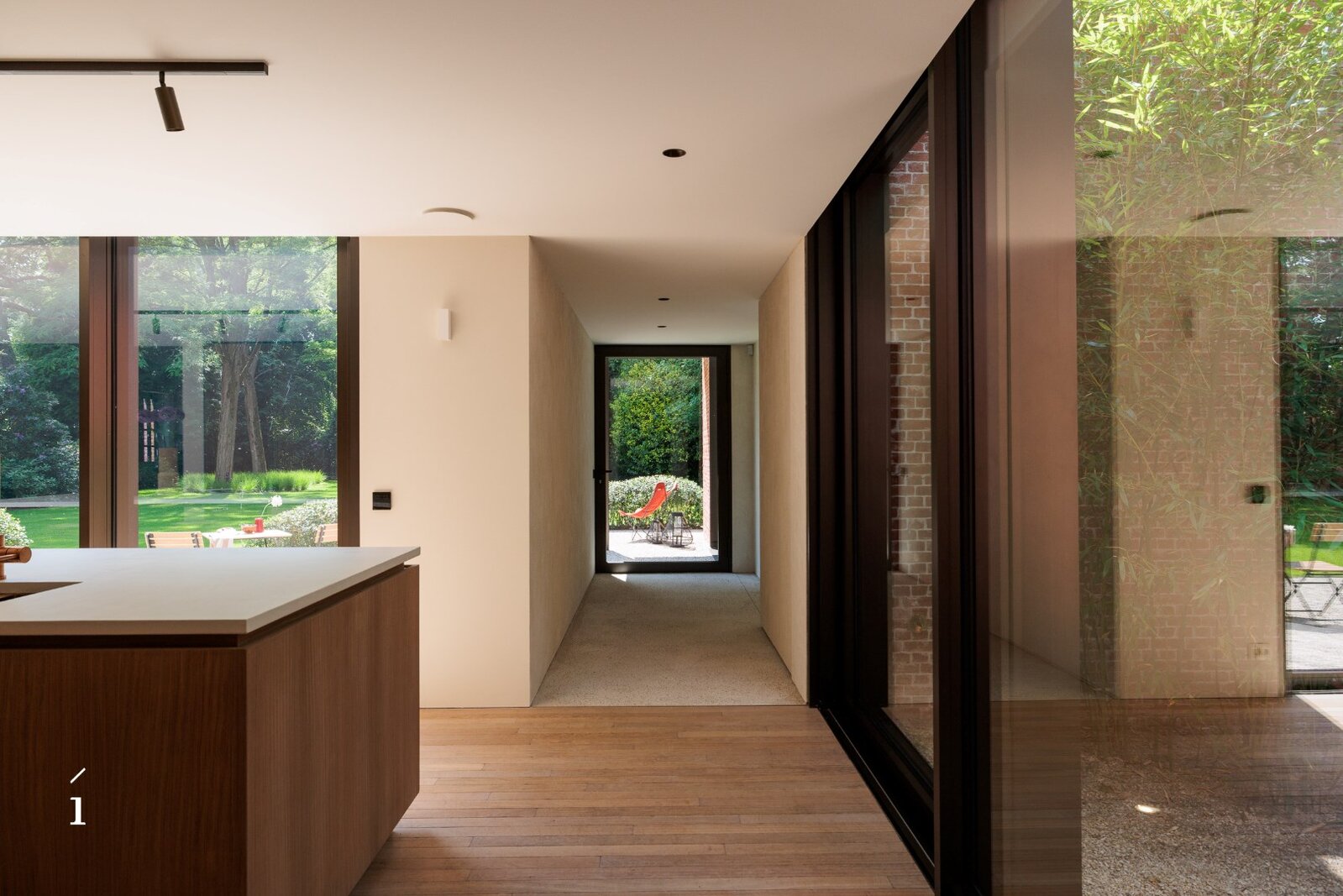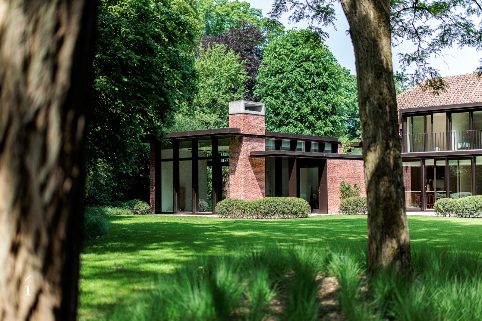 De woning werd ontworpen door Yama Architects die de eigendom omschrijven als een subtiele verschuiving van vier volumes, zorgvuldig gepositioneerd rond een centrale patio. Het resultaat is een unieke beleving van ruimte, licht en rust. Vanuit elke kamer is er een directe verbinding met het omliggende groen, wat zorgt voor een constante dialoog tussen interieur en landschap. De volledige woning werd in 2023 onderworpen aan een grondige totaalrenovatie en uitbreiding, met behoud van authentieke elementen en met gebruik van gerecupereerde bakstenen, wat het geheel een tijdloze uitstraling geeft.