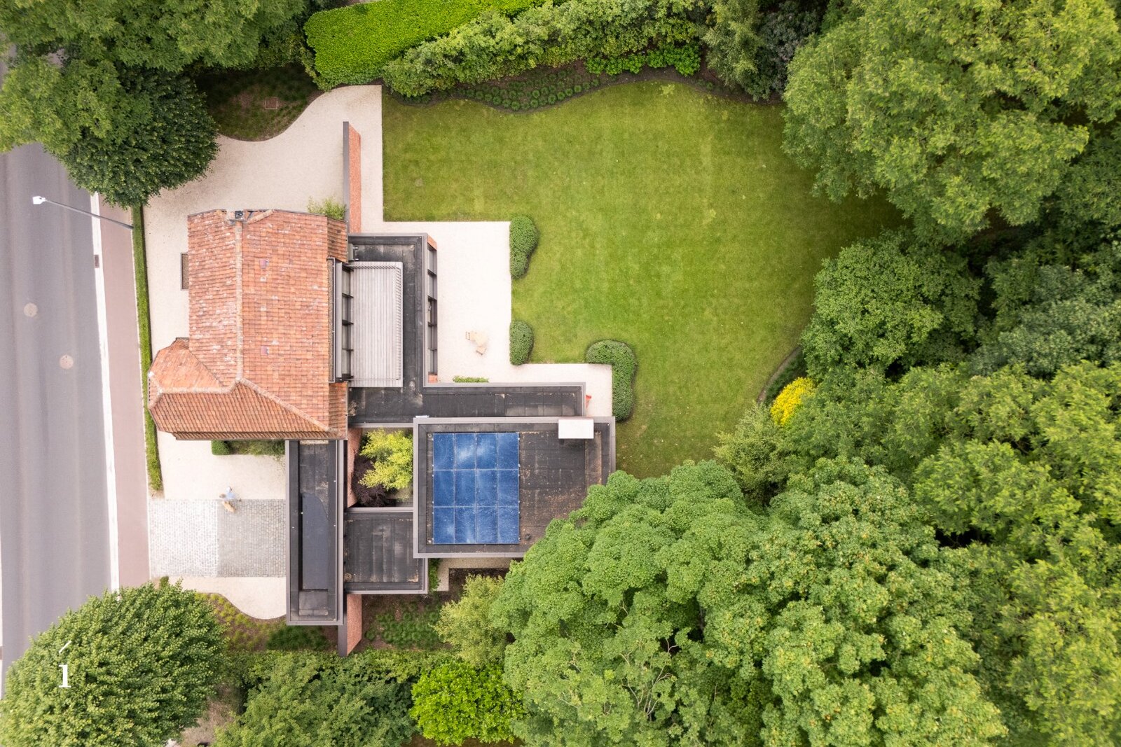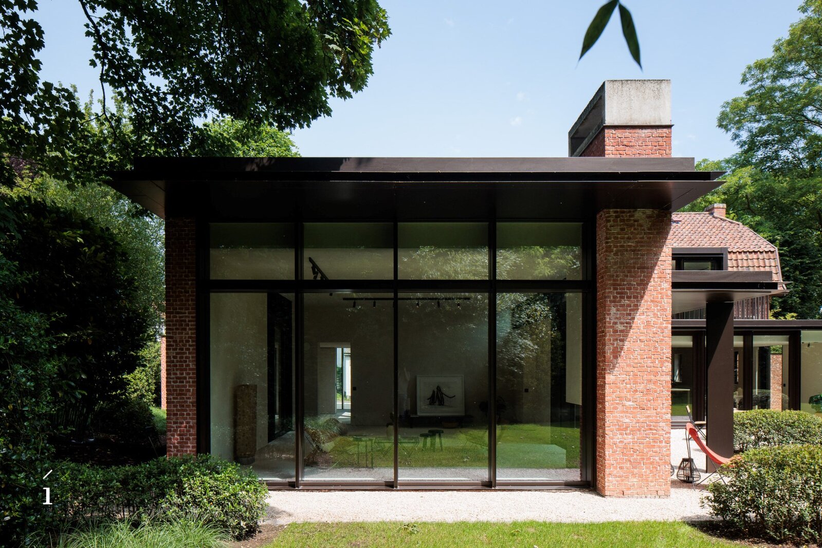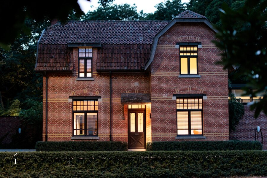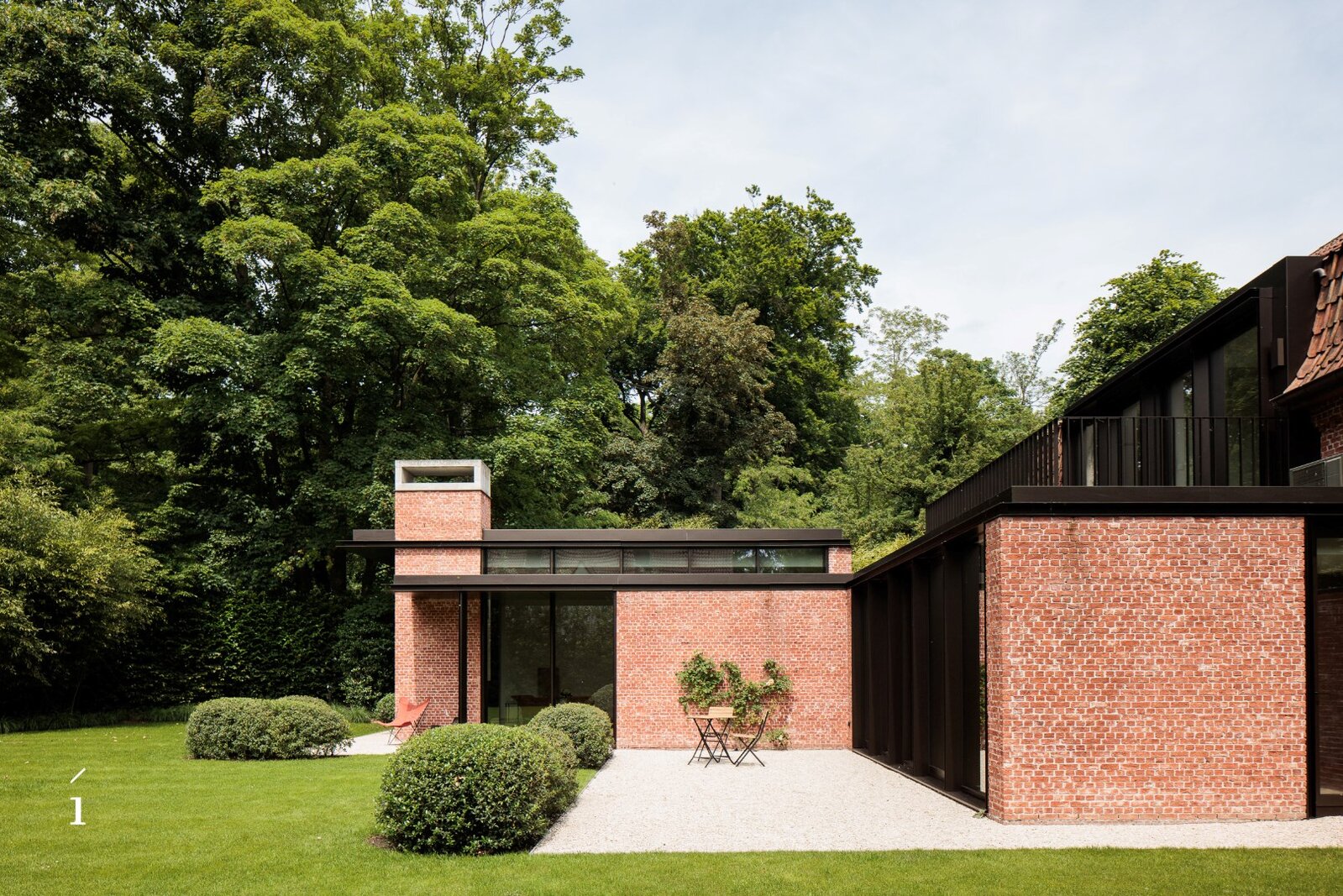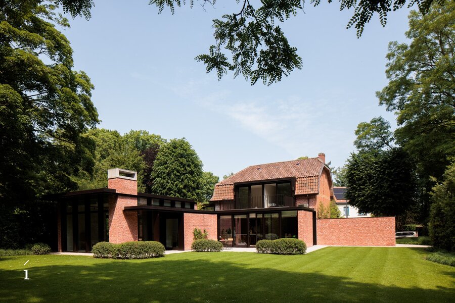 De woning werd ontworpen door Yama Architects die de eigendom omschrijven als een subtiele verschuiving van vier volumes, zorgvuldig gepositioneerd rond een centrale patio. Het resultaat is een unieke beleving van ruimte, licht en rust. Vanuit elke kamer is er een directe verbinding met het omliggende groen, wat zorgt voor een constante dialoog tussen interieur en landschap. De volledige woning werd in 2023 onderworpen aan een grondige totaalrenovatie en uitbreiding, met behoud van authentieke elementen en met gebruik van gerecupereerde bakstenen, wat het geheel een tijdloze uitstraling geeft.