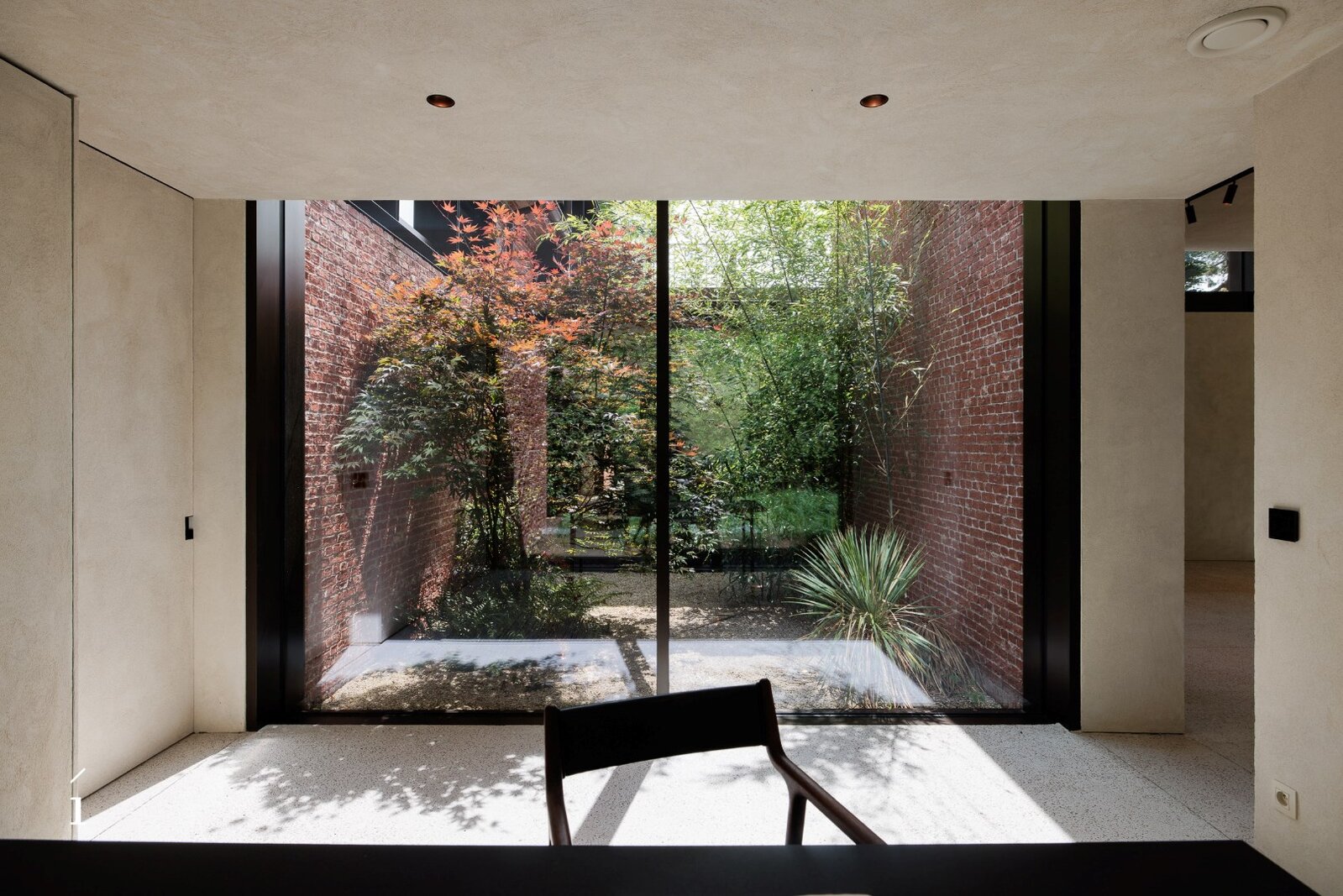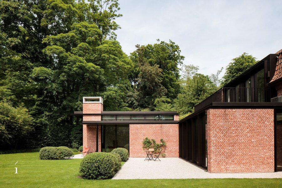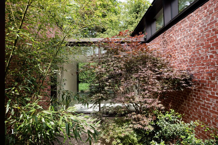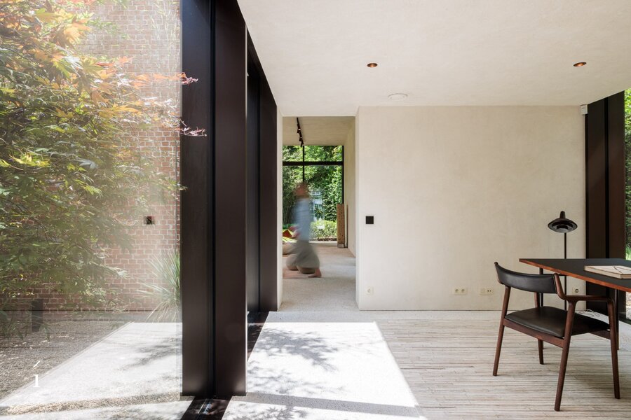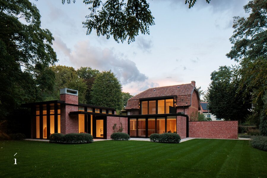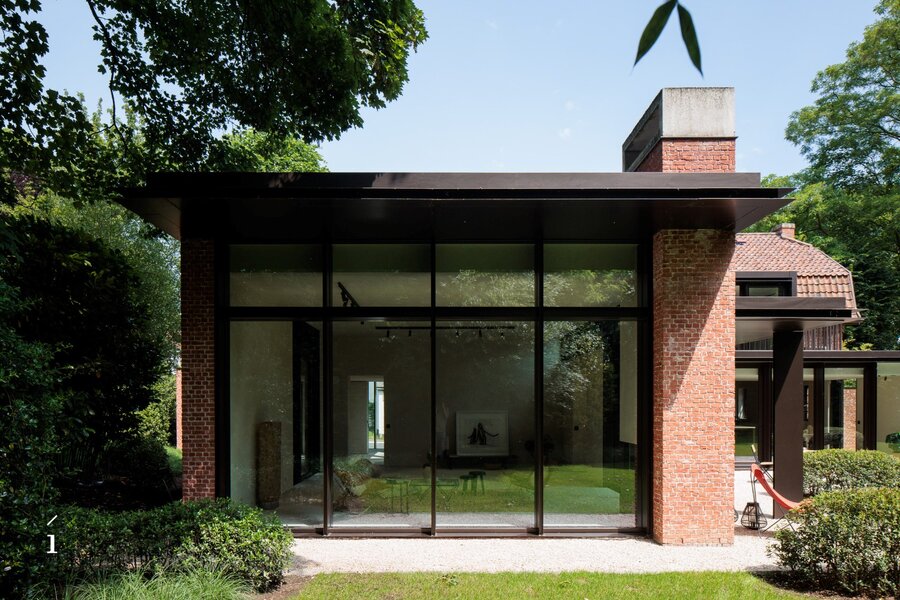 De woning werd ontworpen door Yama Architects die de eigendom omschrijven als een subtiele verschuiving van vier volumes, zorgvuldig gepositioneerd rond een centrale patio. Het resultaat is een unieke beleving van ruimte, licht en rust. Vanuit elke kamer is er een directe verbinding met het omliggende groen, wat zorgt voor een constante dialoog tussen interieur en landschap. De volledige woning werd in 2023 onderworpen aan een grondige totaalrenovatie en uitbreiding, met behoud van authentieke elementen en met gebruik van gerecupereerde bakstenen, wat het geheel een tijdloze uitstraling geeft.