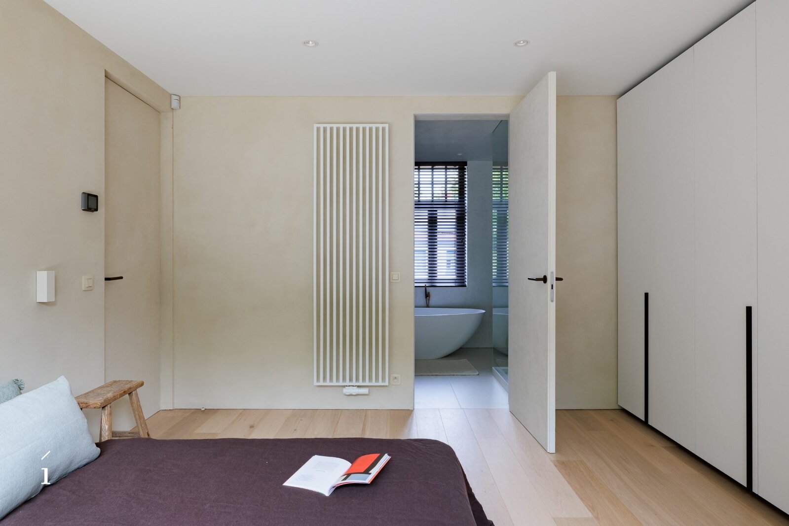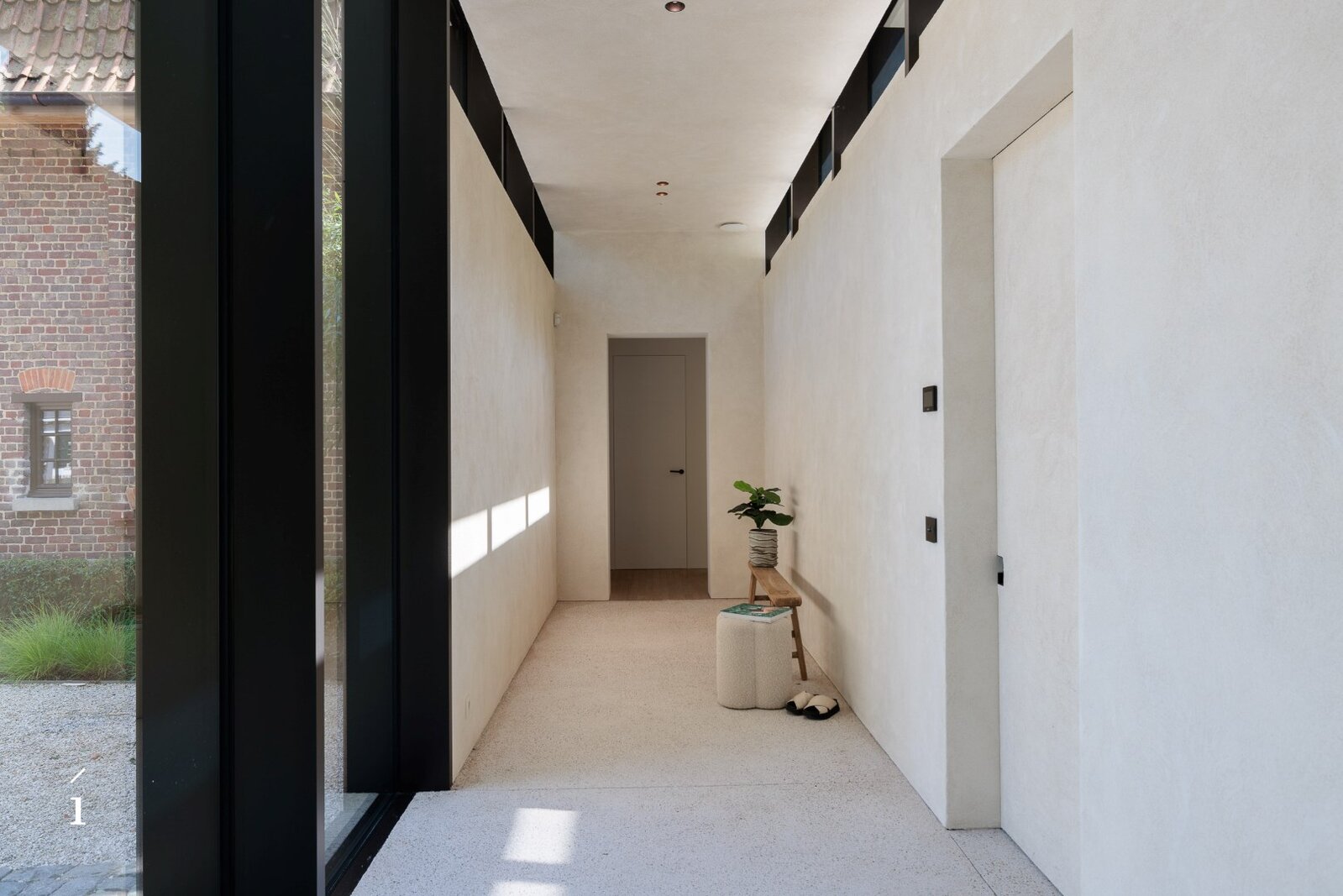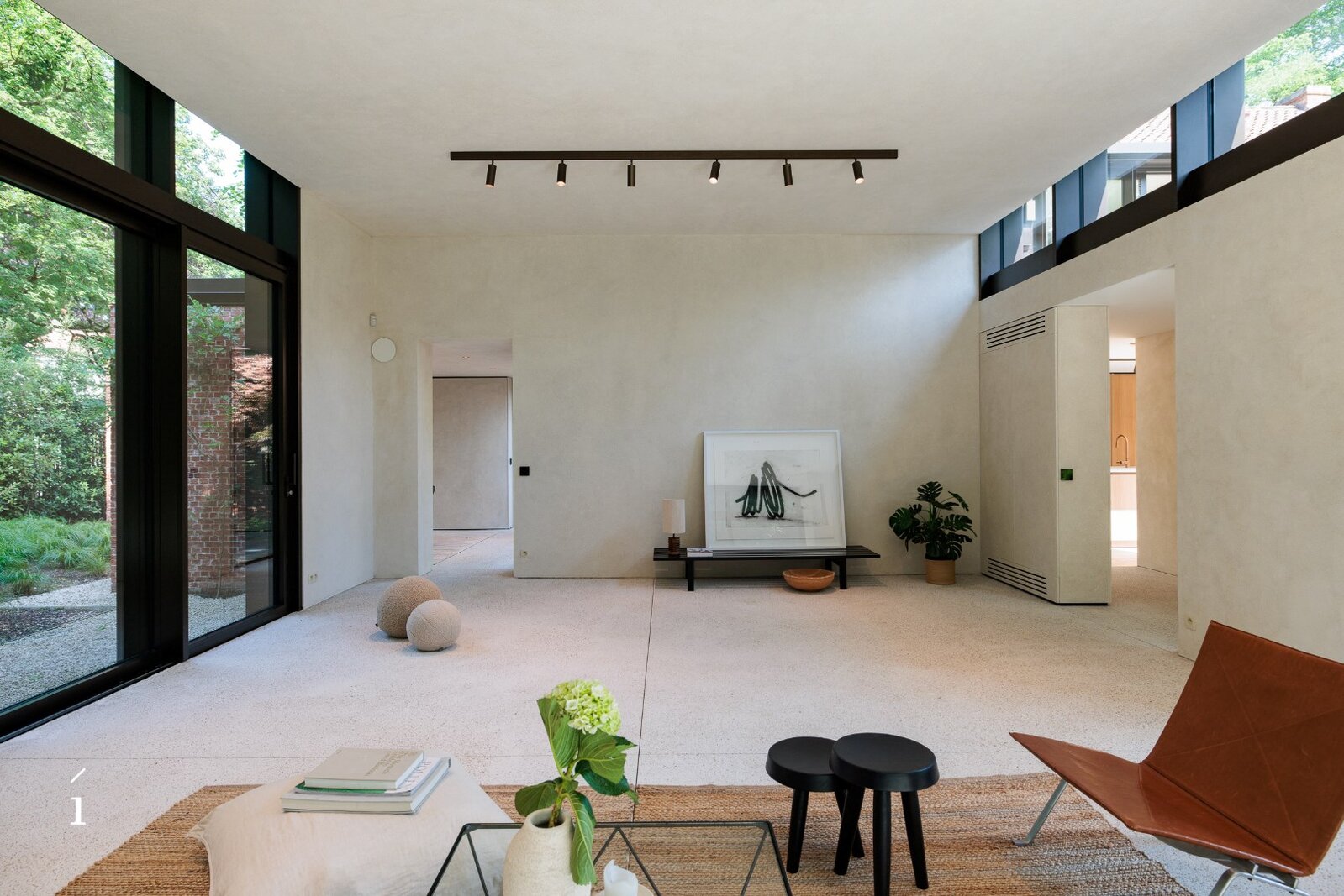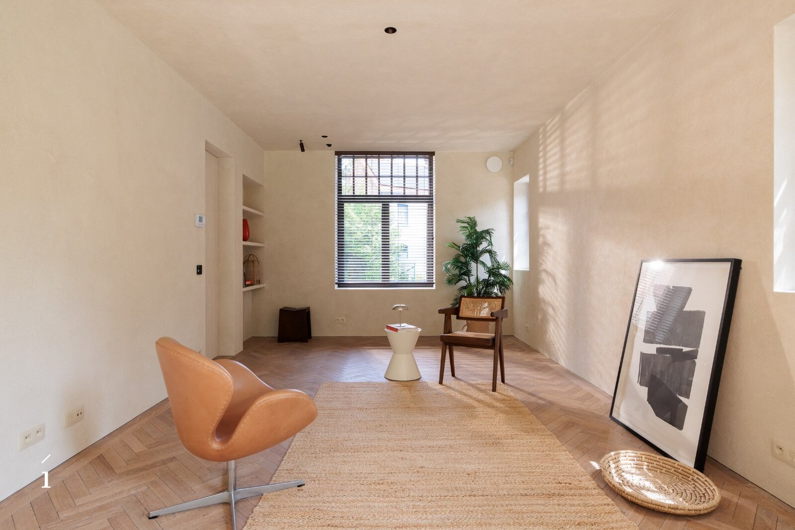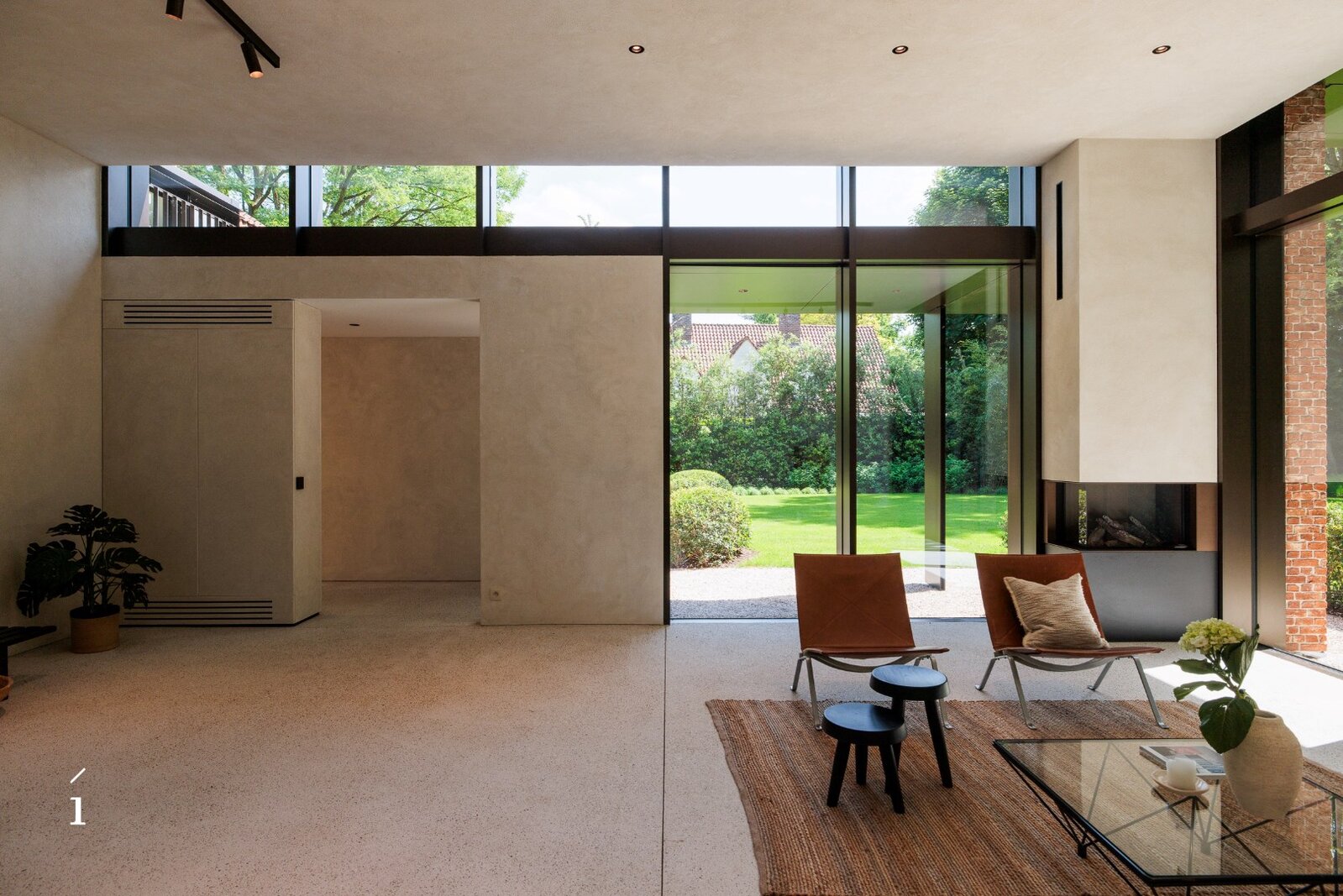 Binnenin valt meteen de sobere elegantie op. De vloer is uitgevoerd in uitgewassen beton met Mignotte-keien, terwijl de muren afgewerkt zijn met Mortex – een combinatie die warmte, textuur en puurheid uitstraalt. In een van de polyvalente ruimtes bevindt zich een stijlvolle gashaard van De Puydt, die het geheel een warme en uitnodigende sfeer geeft – perfect voor professioneel gebruik met een huiselijke toets. De leefruimte grenst aan een open keuken met hoogwaardige Miele-toestellen, verfijnd ingewerkt in maatwerk met Aformosia hout. De badkamers zijn afgewerkt met Vola kranen en materialen die aansluiten bij het uitgepuurde karakter van de woning.