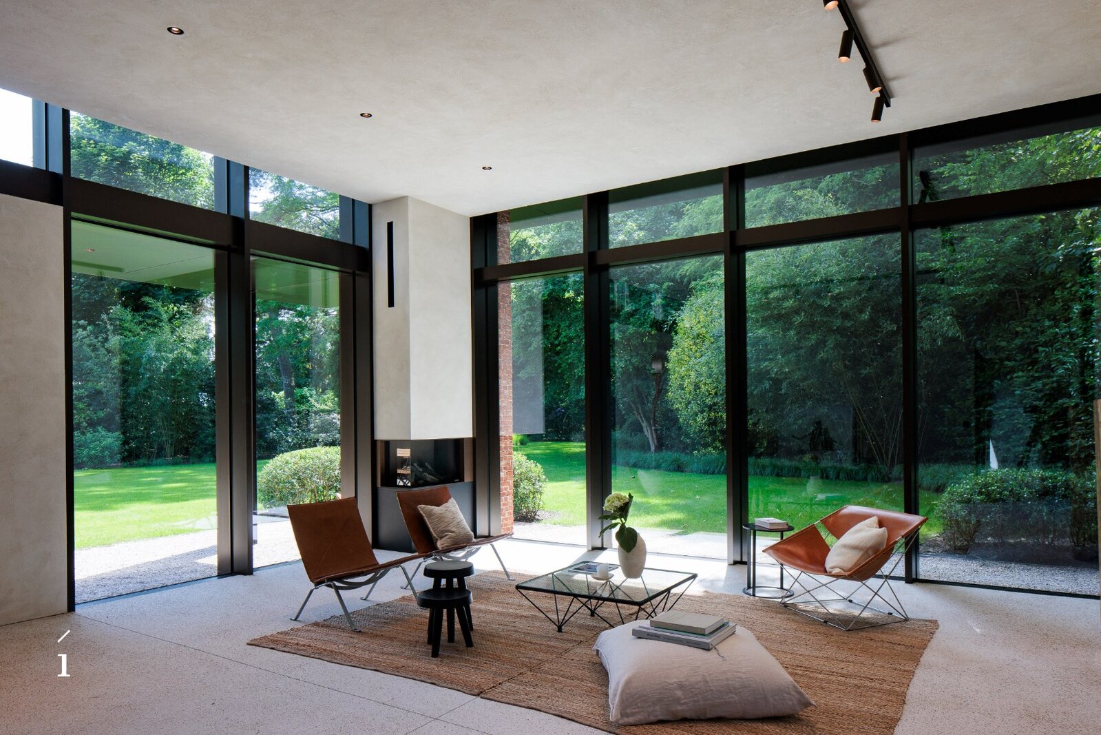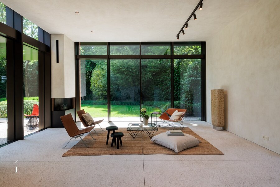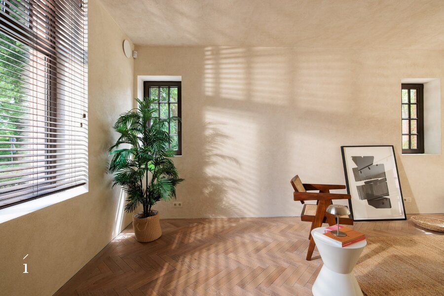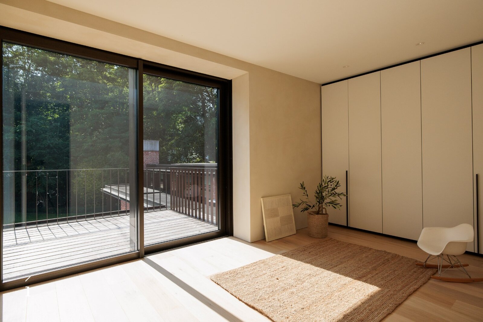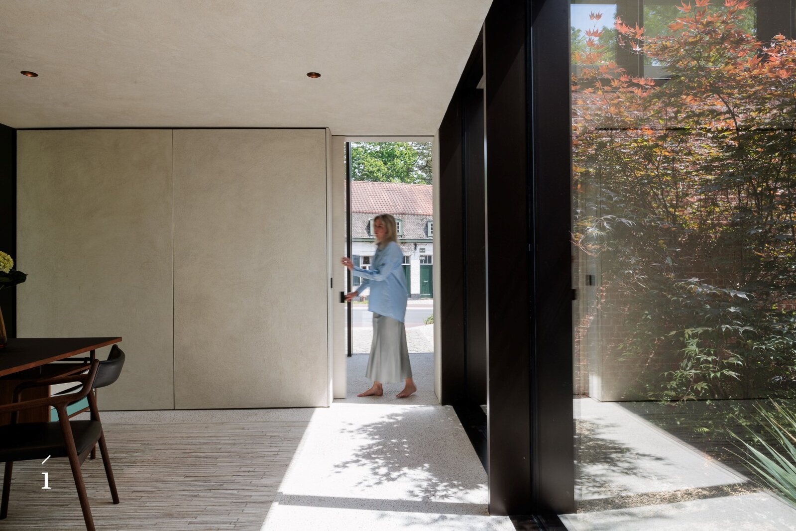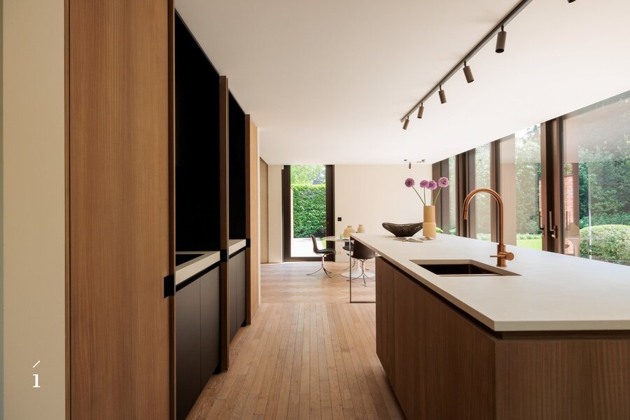 Binnenin valt meteen de sobere elegantie op. De vloer is uitgevoerd in uitgewassen beton met Mignotte-keien, terwijl de muren afgewerkt zijn met Mortex – een combinatie die warmte, textuur en puurheid uitstraalt. In een van de polyvalente ruimtes bevindt zich een stijlvolle gashaard van De Puydt, die het geheel een warme en uitnodigende sfeer geeft – perfect voor professioneel gebruik met een huiselijke toets. De leefruimte grenst aan een open keuken met hoogwaardige Miele-toestellen, verfijnd ingewerkt in maatwerk met Aformosia hout. De badkamers zijn afgewerkt met Vola kranen en materialen die aansluiten bij het uitgepuurde karakter van de woning.