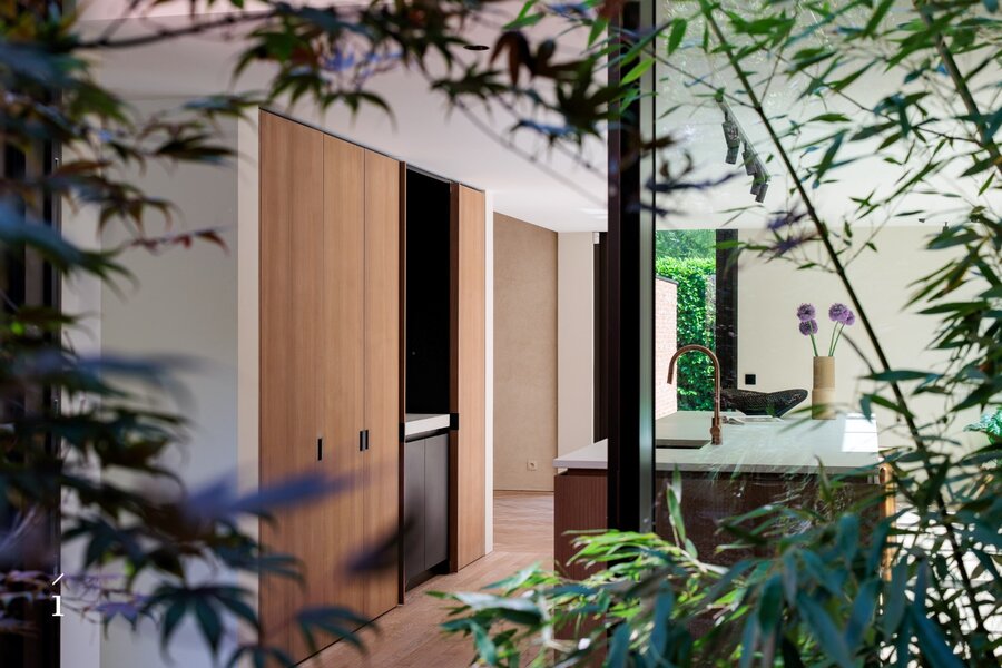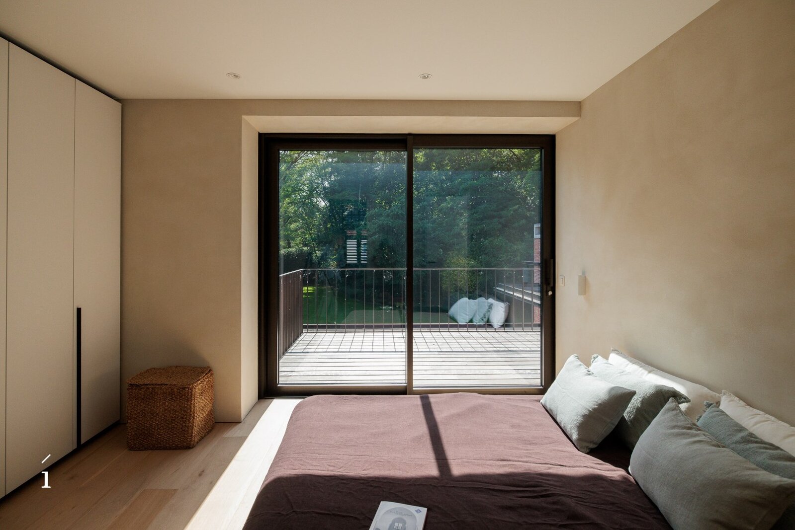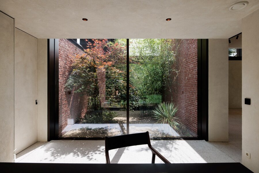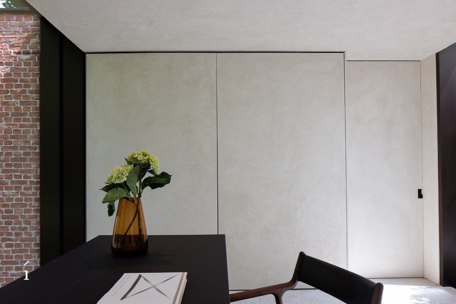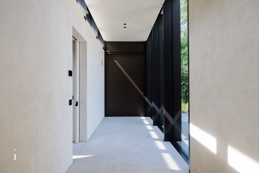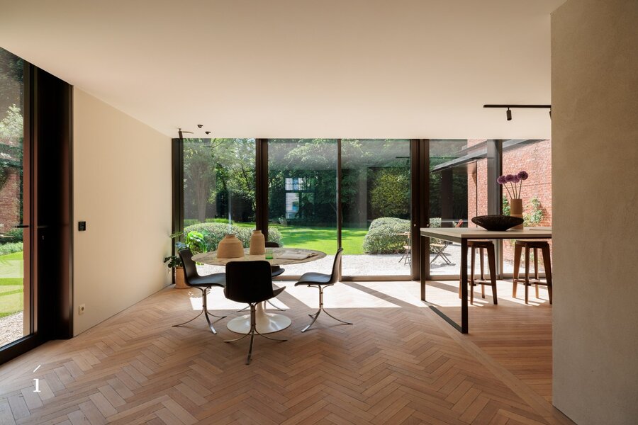 Binnenin valt meteen de sobere elegantie op. De vloer is uitgevoerd in uitgewassen beton met Mignotte-keien, terwijl de muren afgewerkt zijn met Mortex – een combinatie die warmte, textuur en puurheid uitstraalt. In een van de polyvalente ruimtes bevindt zich een stijlvolle gashaard van De Puydt, die het geheel een warme en uitnodigende sfeer geeft – perfect voor professioneel gebruik met een huiselijke toets. De leefruimte grenst aan een open keuken met hoogwaardige Miele-toestellen, verfijnd ingewerkt in maatwerk met Aformosia hout. De badkamers zijn afgewerkt met Vola kranen en materialen die aansluiten bij het uitgepuurde karakter van de woning.