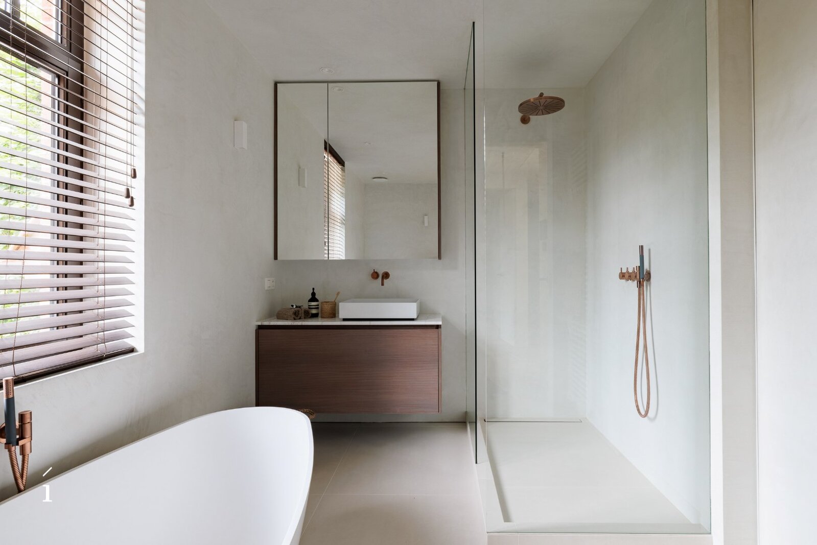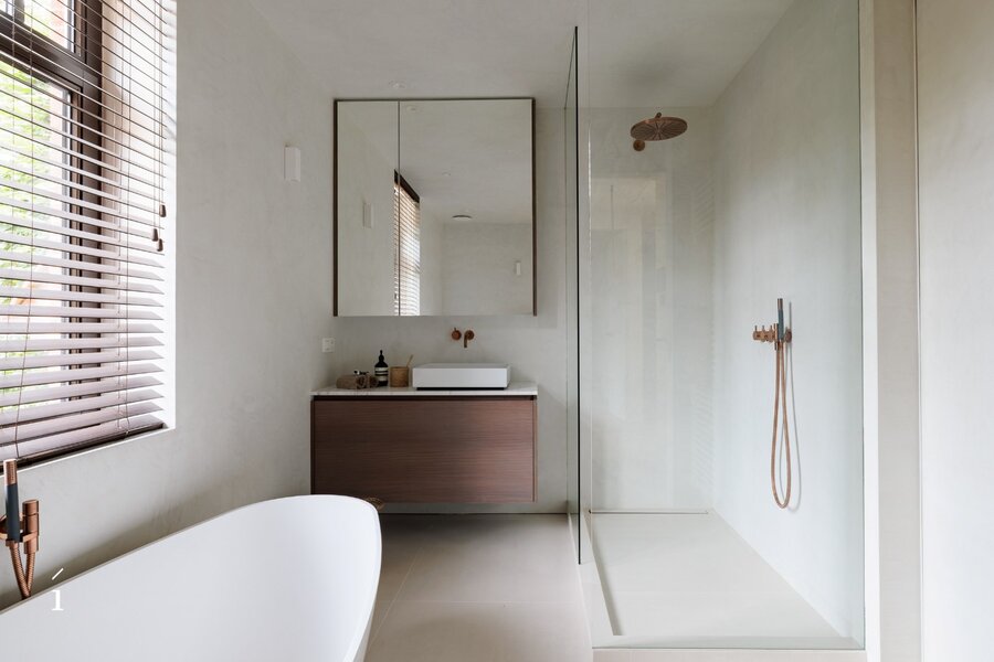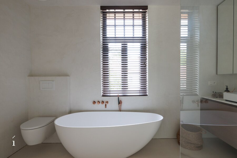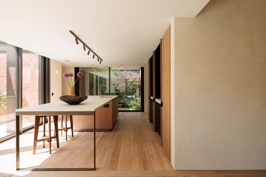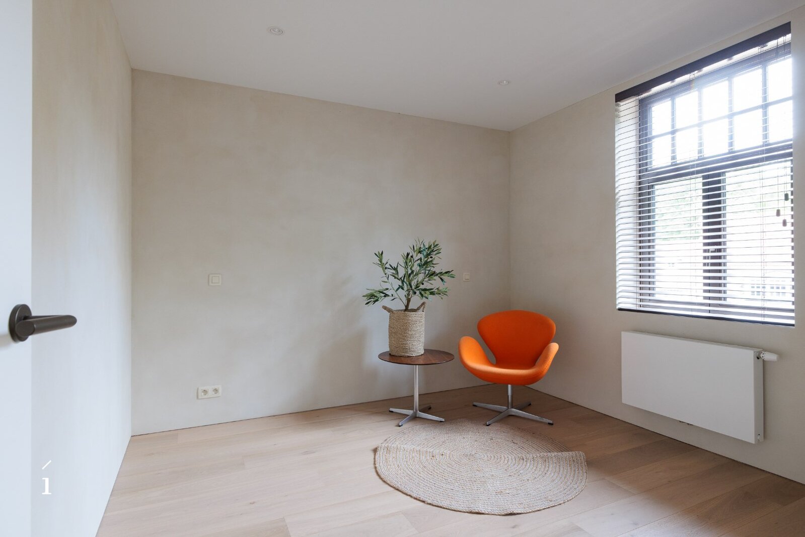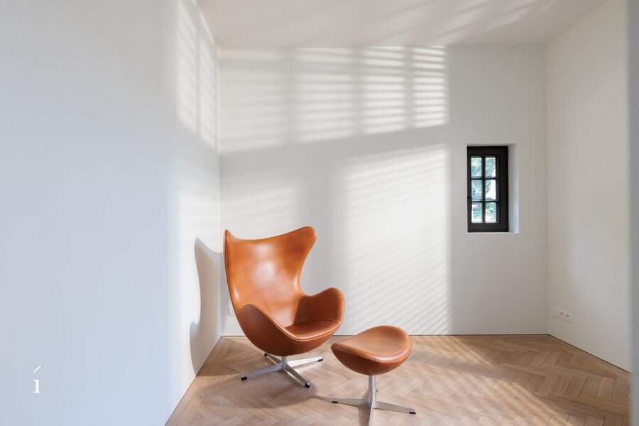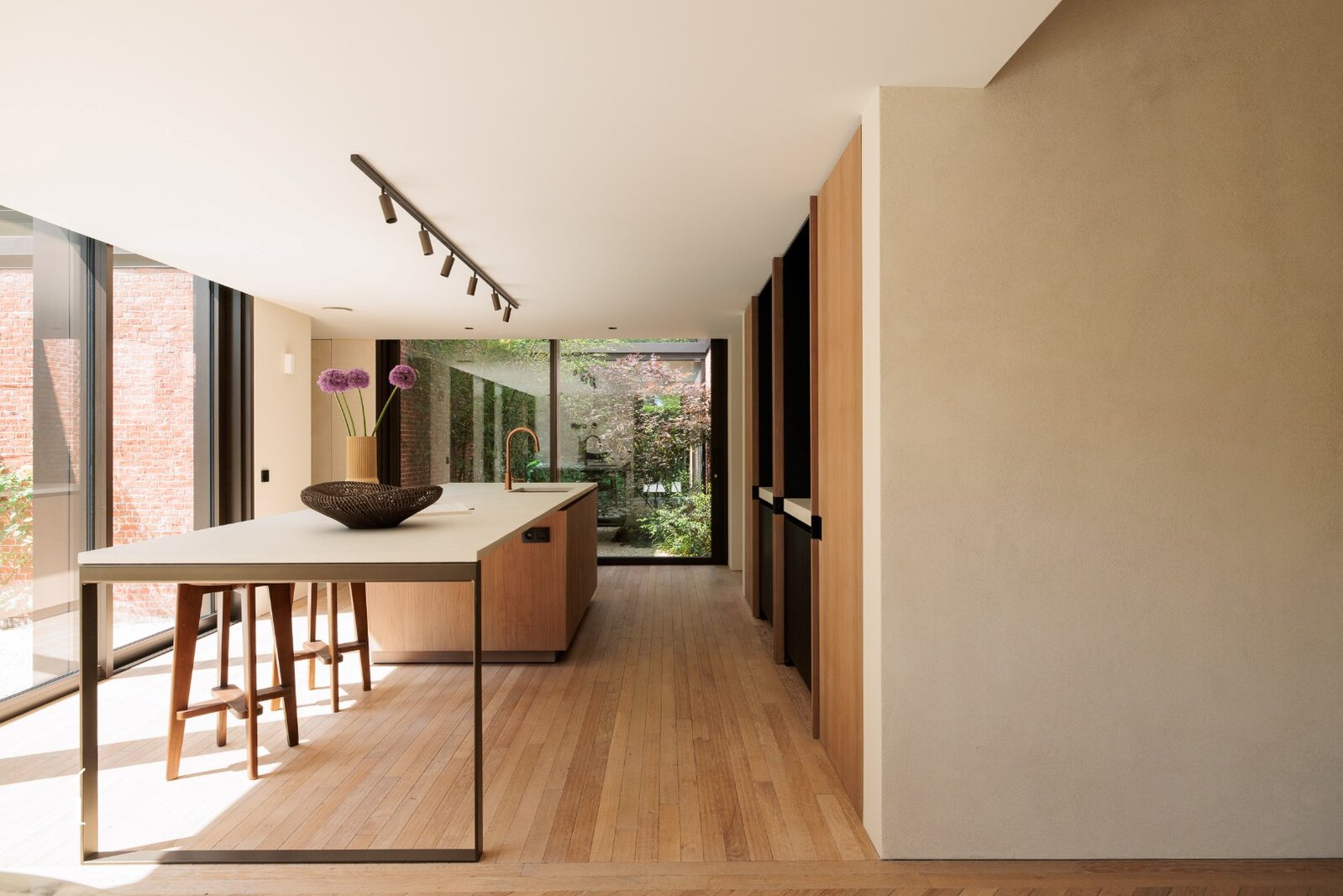 Binnenin valt meteen de sobere elegantie op. De vloer is uitgevoerd in uitgewassen beton met Mignotte-keien, terwijl de muren afgewerkt zijn met Mortex – een combinatie die warmte, textuur en puurheid uitstraalt. In een van de polyvalente ruimtes bevindt zich een stijlvolle gashaard van De Puydt, die het geheel een warme en uitnodigende sfeer geeft – perfect voor professioneel gebruik met een huiselijke toets. De leefruimte grenst aan een open keuken met hoogwaardige Miele-toestellen, verfijnd ingewerkt in maatwerk met Aformosia hout. De badkamers zijn afgewerkt met Vola kranen en materialen die aansluiten bij het uitgepuurde karakter van de woning.