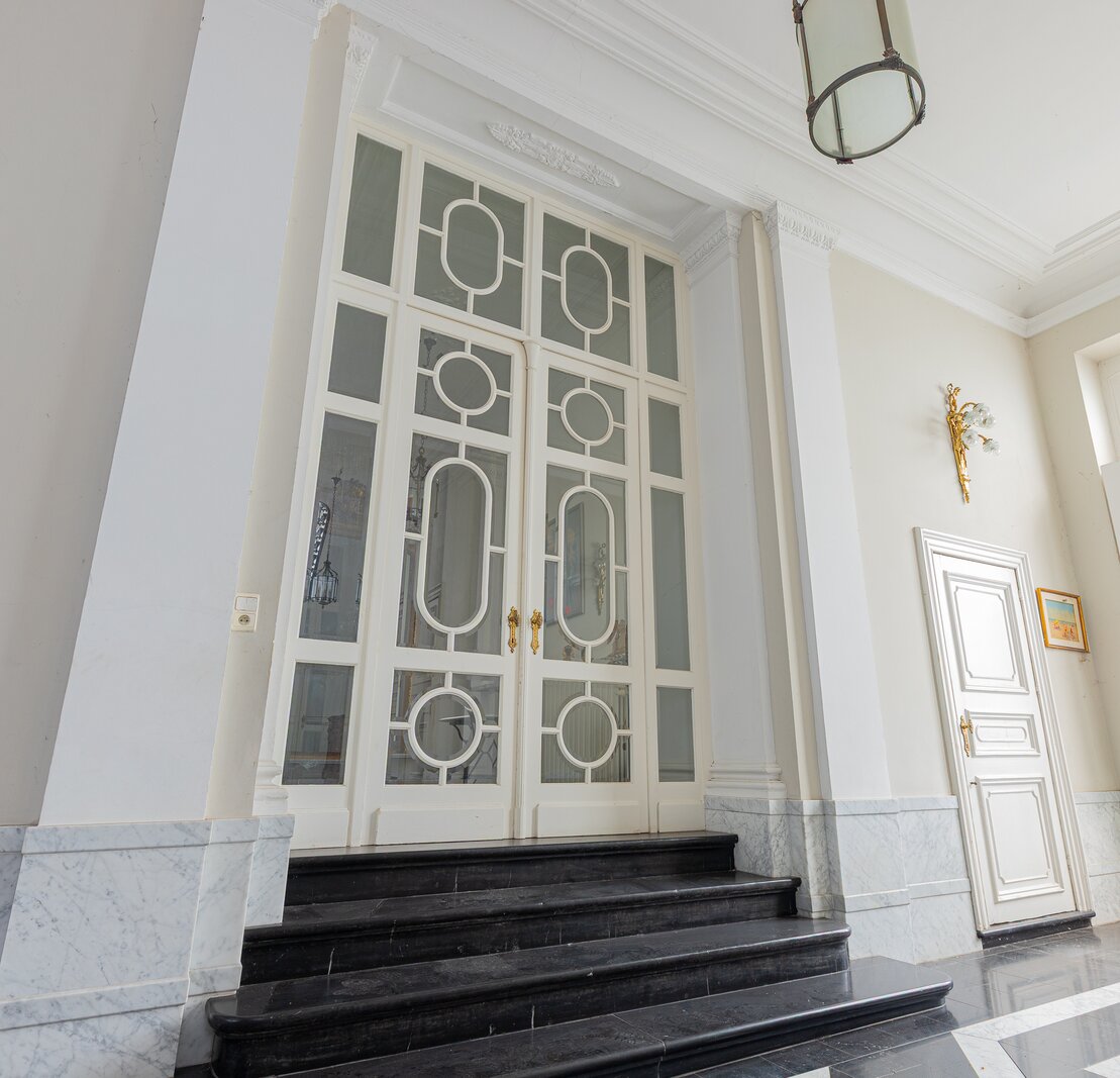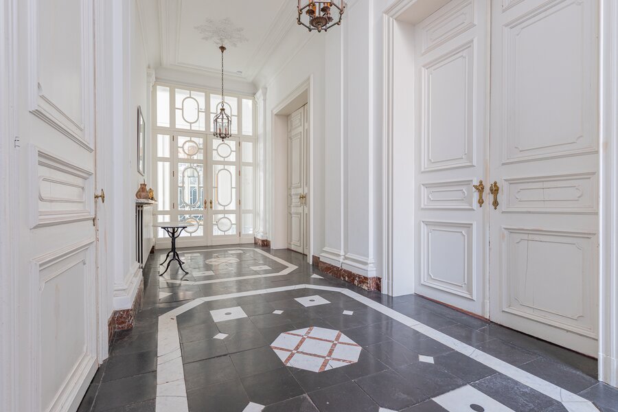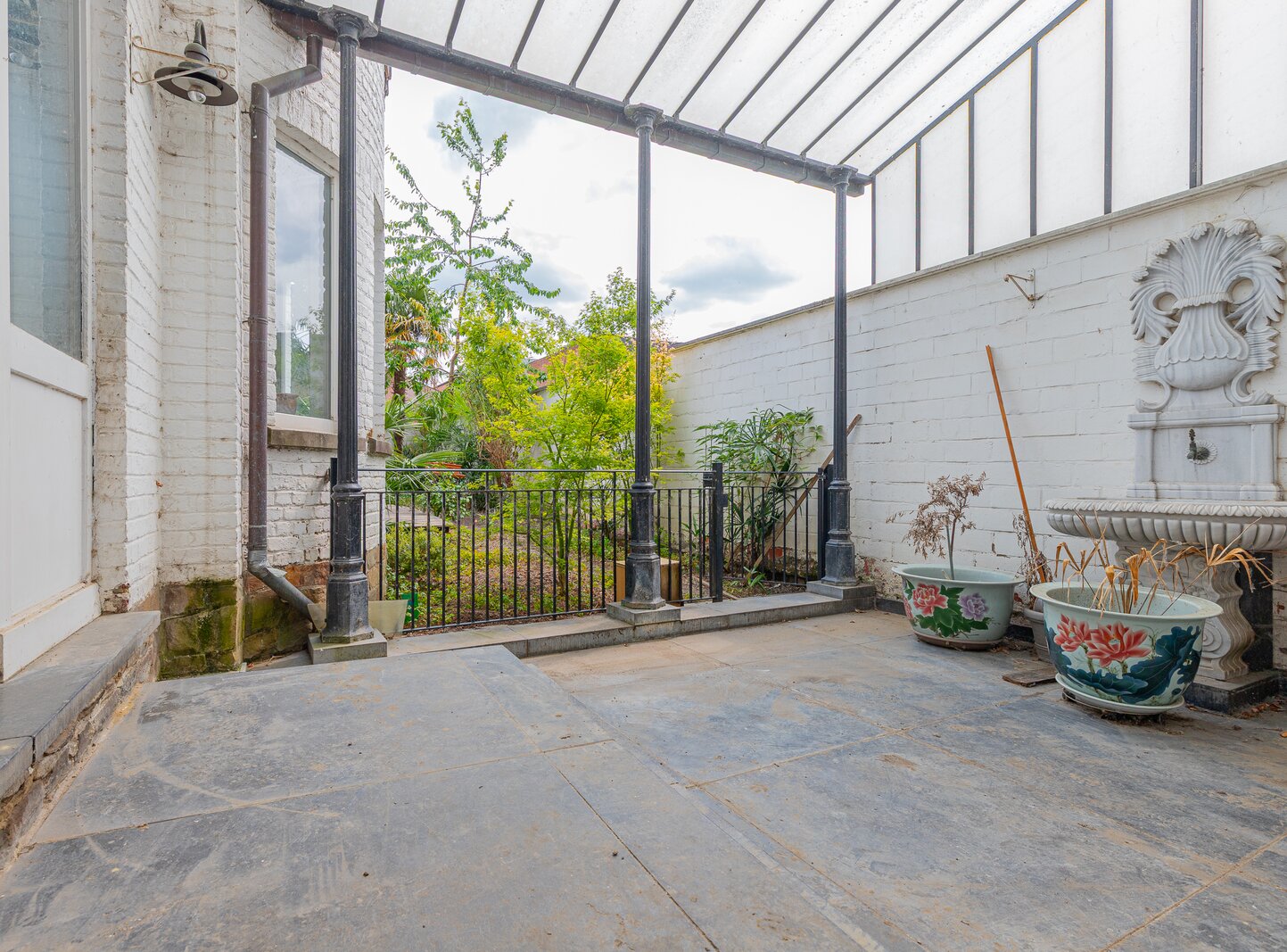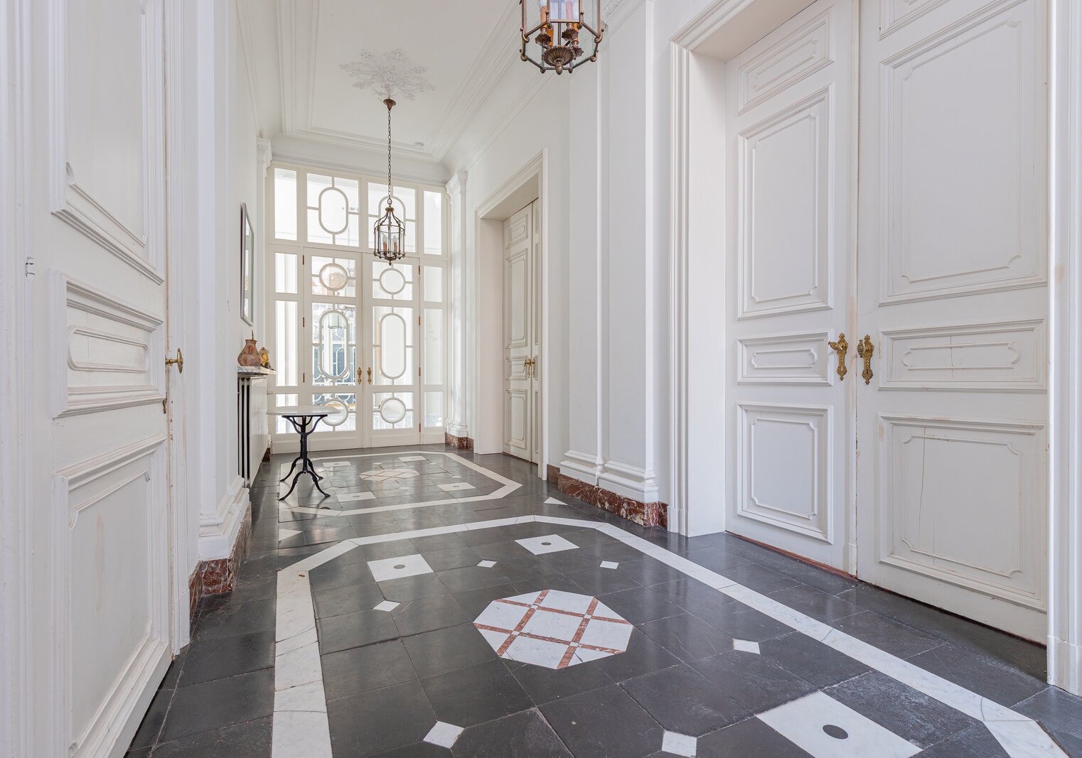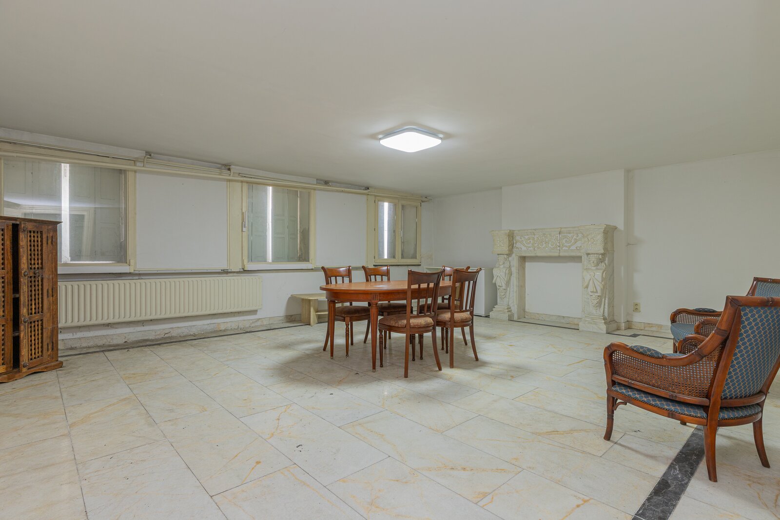 Achter de uitzonderlijke gevel met 6 traveeën en 3 verdiepingen schuilt een zonnige stadstuin met charmante pergola, zuidgericht. U krijgt toegang via een majestueuze doorgang, een echo uit de tijd dat koetsen rechtstreeks naar de tuin reden, tot een woonoppervlakte van 775 m², aangevuld met 135 m² kelderruimte die reeds zijn ingericht met marmeren vloeren en muren, ingebouwde kasten en monumentale schouwen.