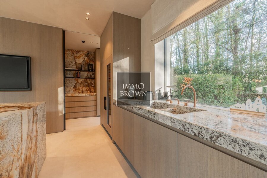 Volledig uitgeruste open leefkeuken met natuurstenen werkblad, Miele-toestellen, groot kookeiland, ingebouwde wijnfrigo en een sfeervolle koffiehoek