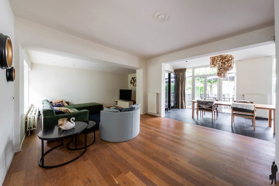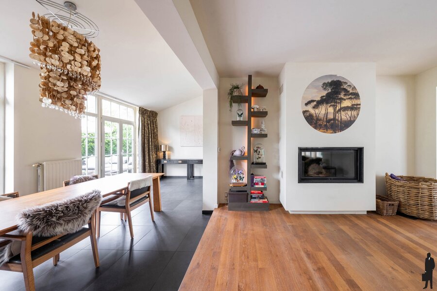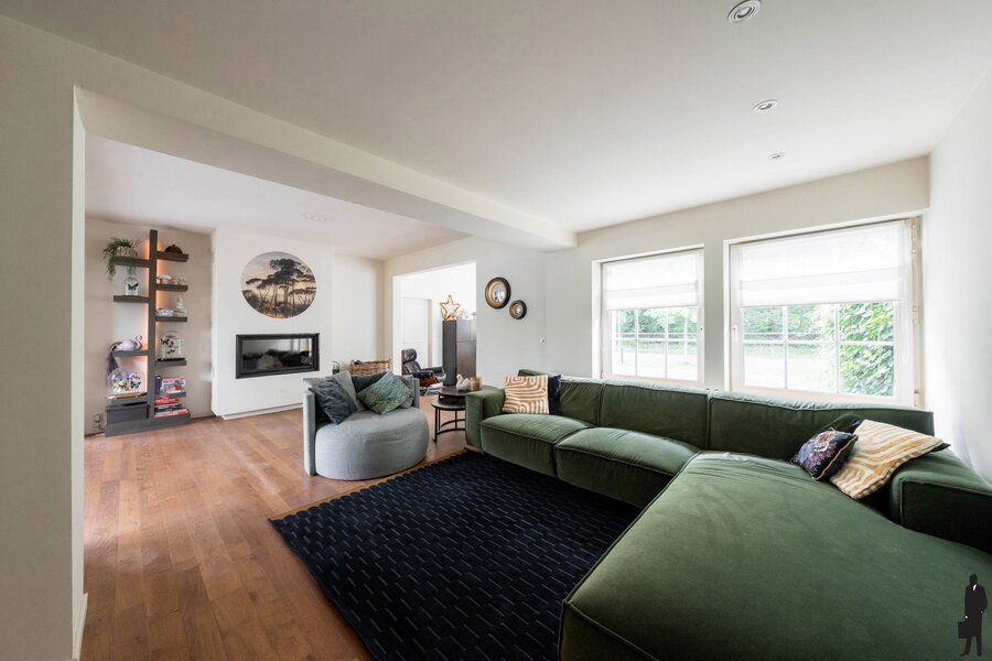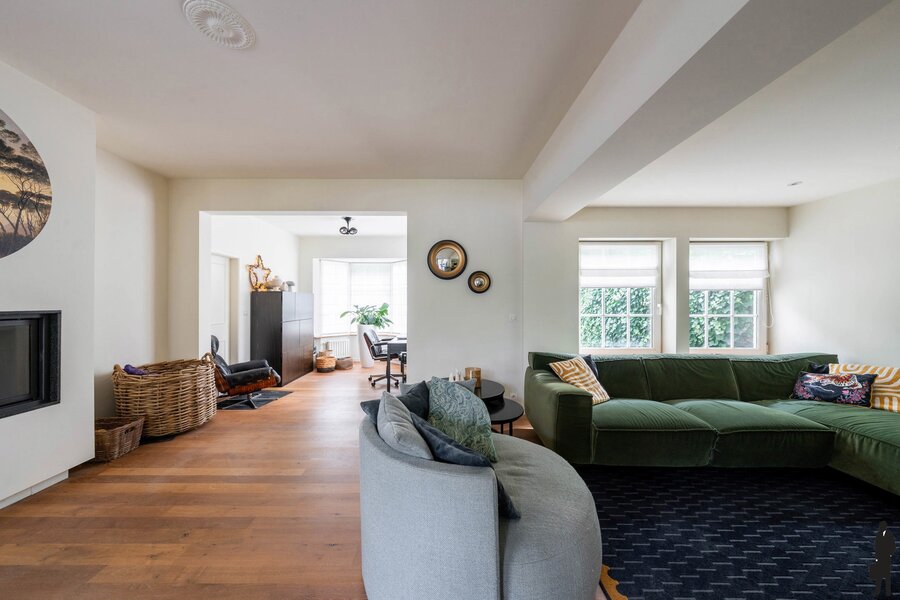 Inkomhal met vestiaire en gastentoilet. Gezellige woonkamer met houtcassette, tv-hoek en aparte bureauhoek.