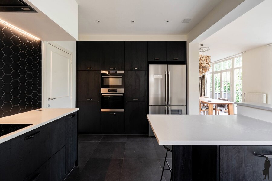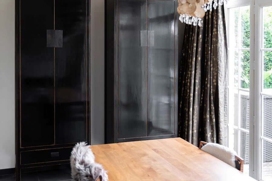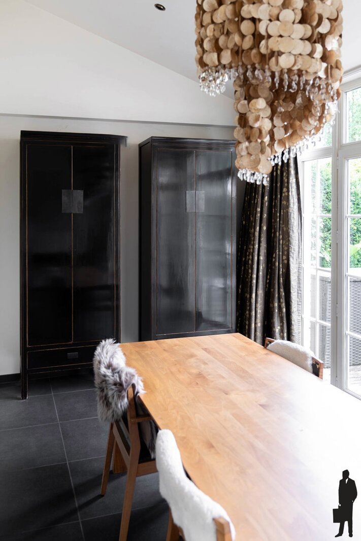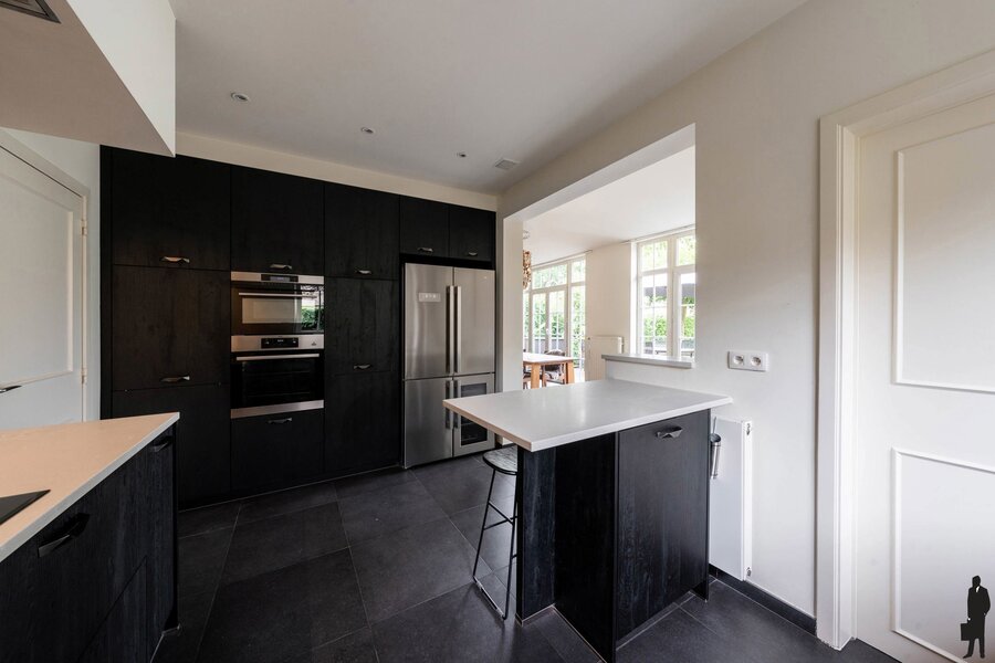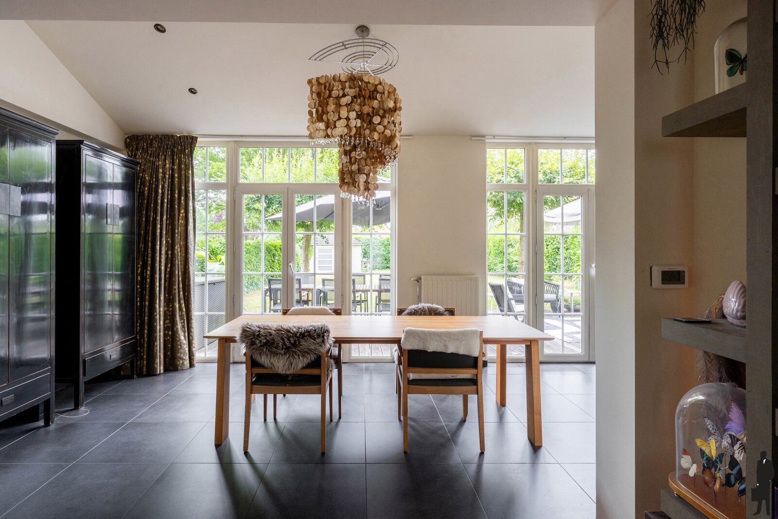 Ruime eetkamer die in verbinding staat met de volledig vernieuwde keuken (2018) en achterliggende berging/wasplaats.