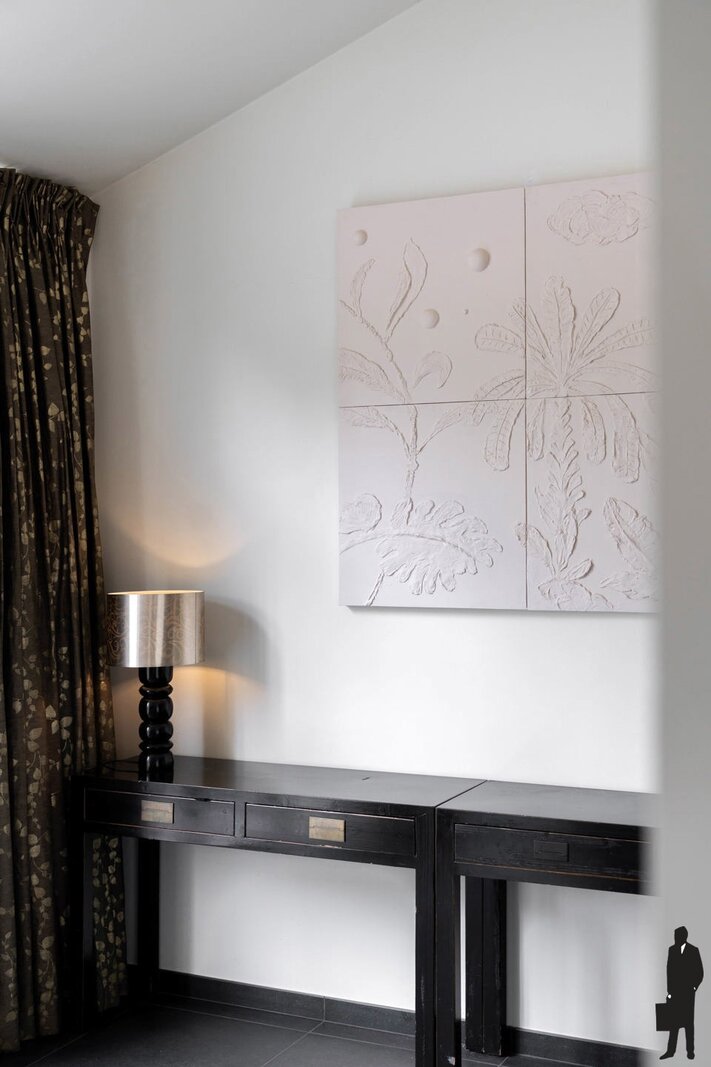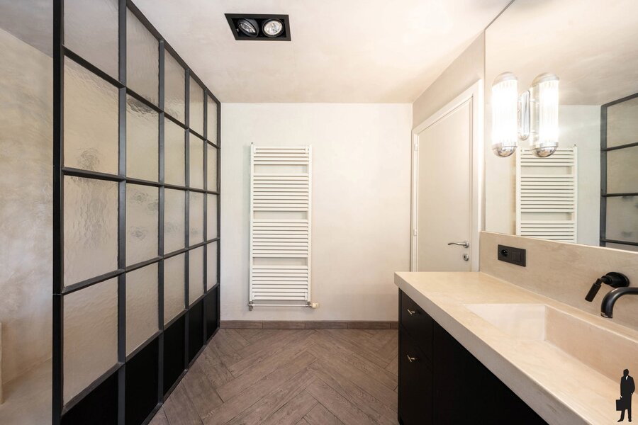 Nachthal met toegang tot twee slaapkamers, waarvan één met inloopdressing. Een prachtig vernieuwde badkamer, uitgevoerd in mortex, met grote inloopdouche en dubbele wastafel en een eveneens vernieuwd apart nachttoilet.