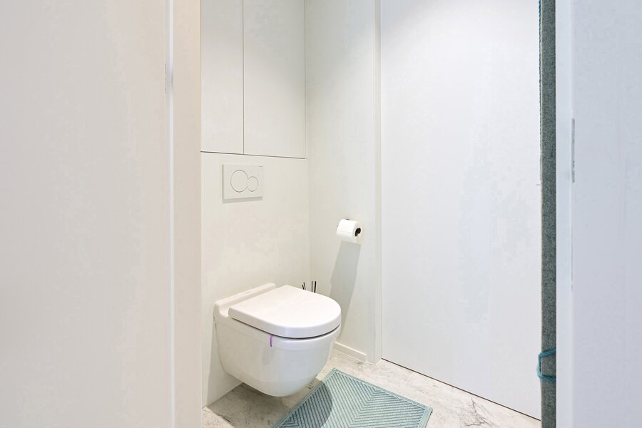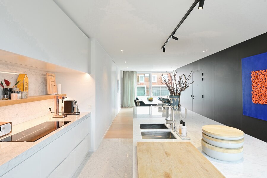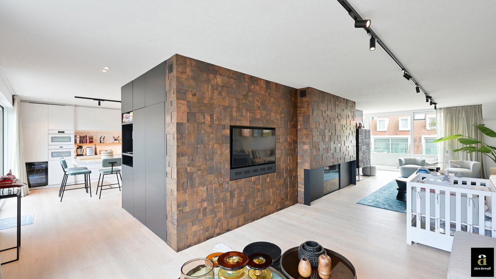 Op de 5e verdieping vindt u een ruime leefkeuken met hoogwaardige Miele-apparatuur en elegant Carrara marmer, die aansluit op de eetkamer. De doorloopwoonkamer is voorzien van een stijlvolle gashaard afgewerkt in brons en geeft, net als de keuken, toegang tot de zonneterrassen. Het westgerichte terras is uitgerust met een ruime zonnetent en terrasverwarming, perfect voor lange avonden buiten. Verder bevinden zich op deze verdieping een technische ruimte, een berging en een gastentoilet.