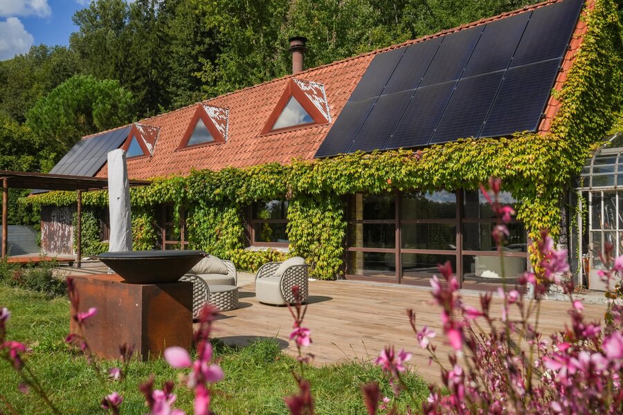 Buiten biedt de volledig omheinde tuin een rustige en aangename sfeer. Er is een houten tuinhuis, een verwarmd zwembad met buitendouche, een serre en een privébos.