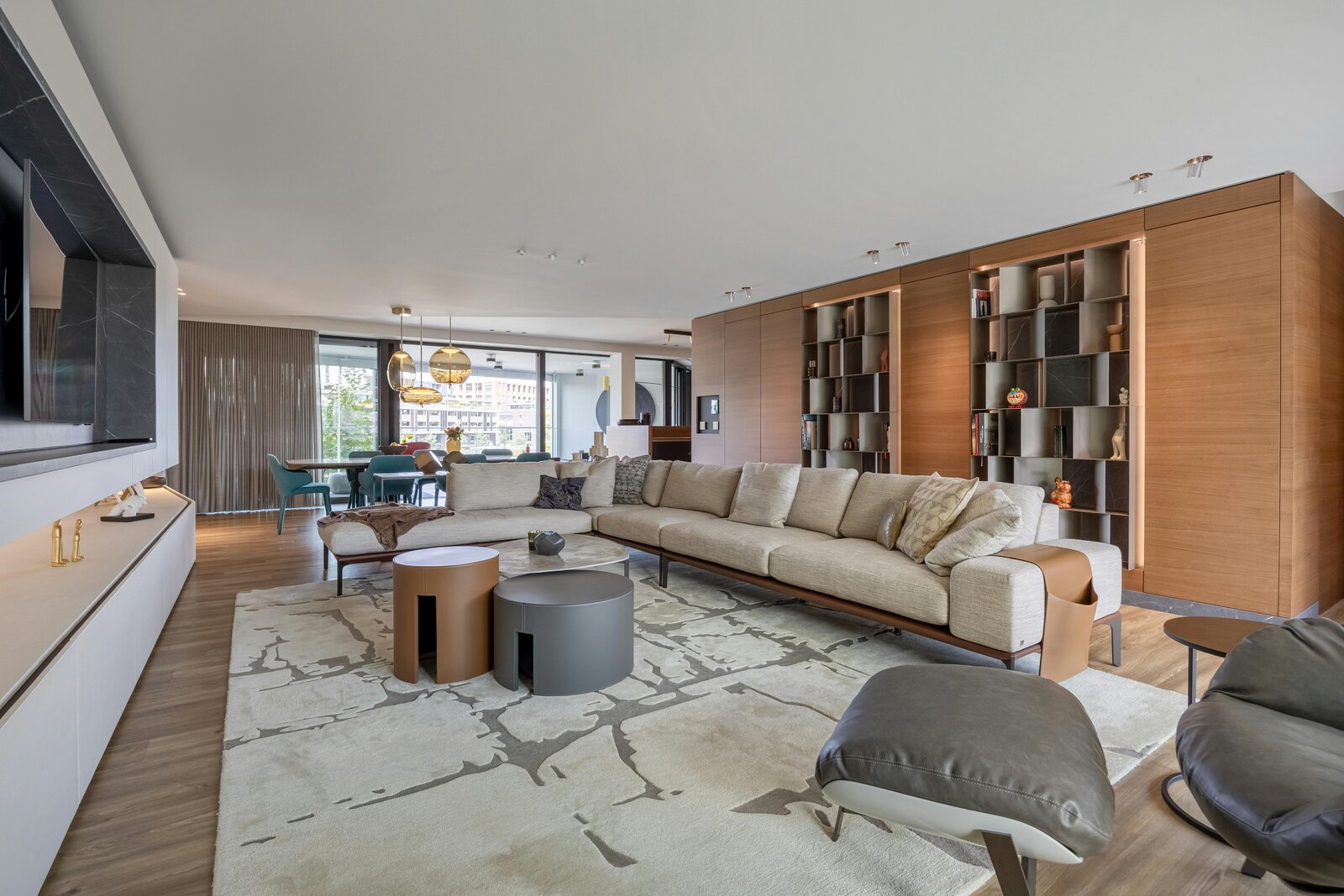 De volledige inrichting van dit appartement is hoogwaardig maatwerk en werd smaakvol en tijdloos afgewerkt. Er werd hierbij beroep gedaan op de befaamde interieurarchitecten In-Lijn en Mirablau dewelke gekend staan om een zeer hoge afwerkingsgraad. Er werd dan ook gebruikgemaakt van luxueuze materialen zoals notelaar hout, marmeren accenten, indirecte verlichting en een bibliotheekkast Nautilus van Cattalan Italia. Daarnaast is het appartement voorzien van de modernste technieken waaronder een Scents-geursysteem, een volledig geïntegreerd muzieksysteem, domotica, vloerverwarming en airconditioning in alle ruimtes.