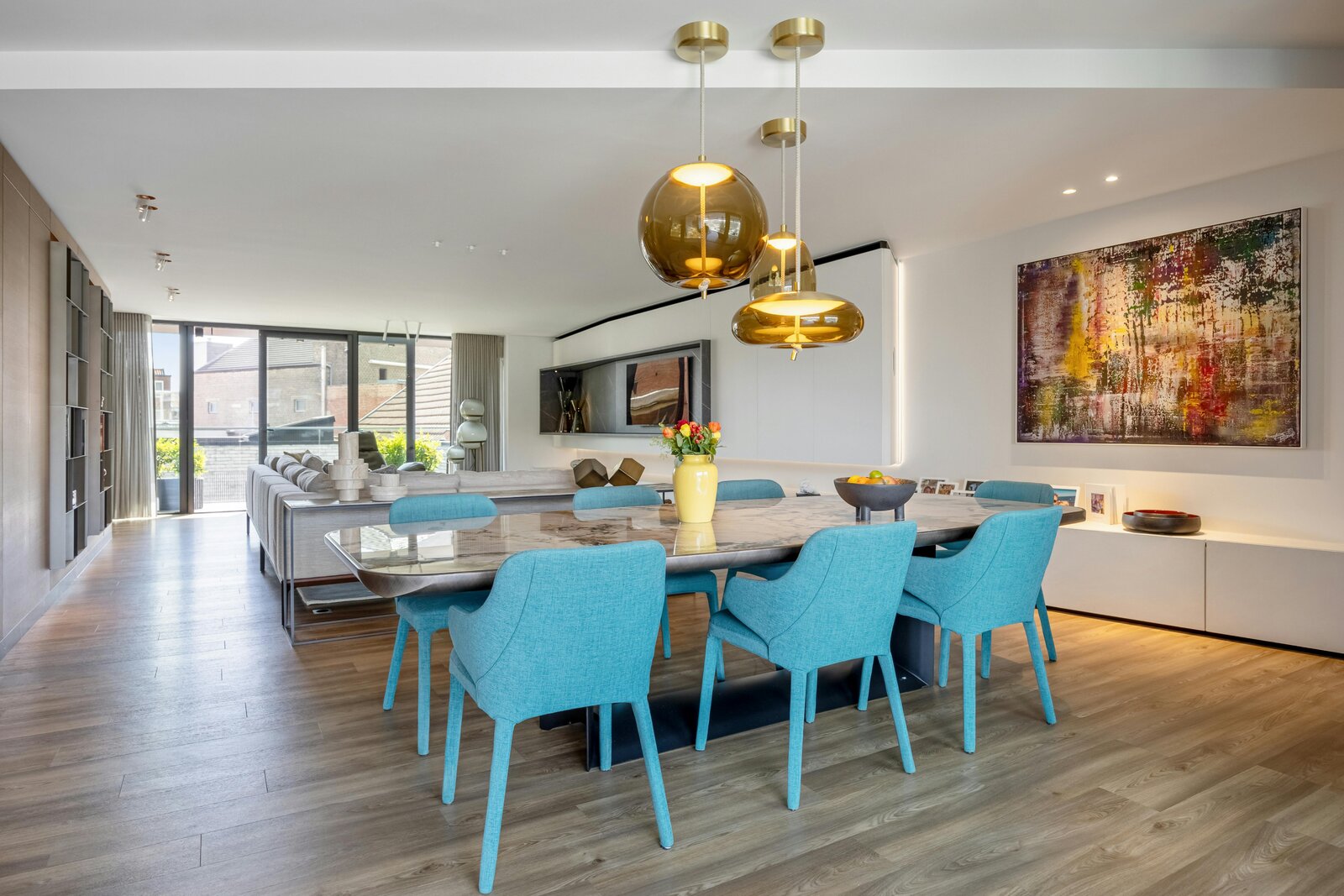 Dit uitzonderlijk luxe appartement te Kempische Kaai 9 in Hasselt met een bewoonbare oppervlakte van 235 m² en 3 terrassen van in totaal 52 m² bevindt zich op de 2de verdieping aan de prestigieuze Blauwe Boulevard in Hasselt. Vanuit de lichtrijke doorzonwoonkamer geniet u van een prachtig panorama uitzicht op de jachthaven van de Kanaalkom. Dankzij de royale raampartijen baadt de leefruimte in natuurlijk licht en vormt het terras een naadloze uitbreiding van het woongedeelte. Het terras is bovendien afsluitbaar met een glazen wand en uitgerust met terrasverwarming, waardoor het in de wintermaanden kan gebruikt worden als gezellige tuinkamer.