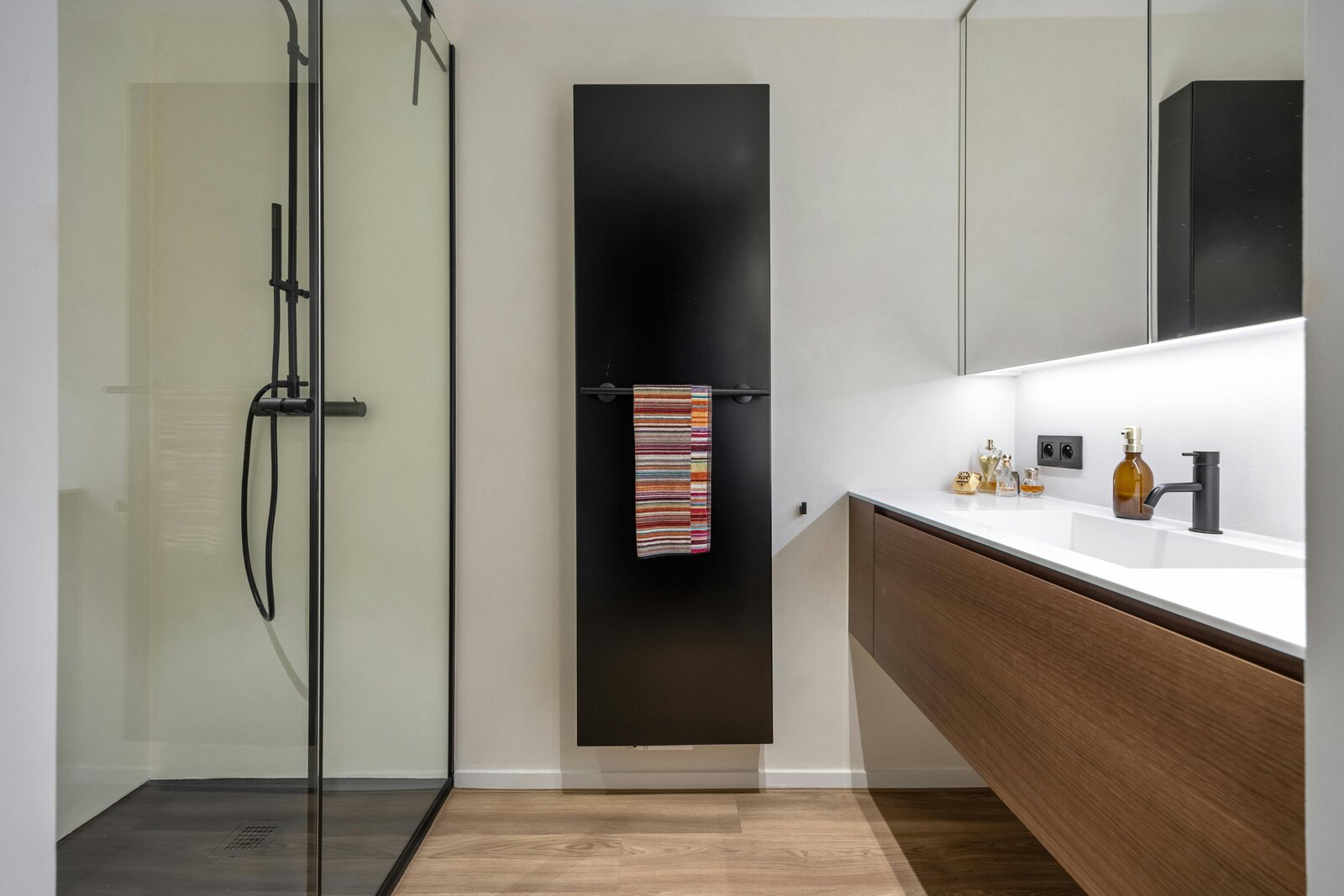 De indeling is functioneel en stijlvol. Via de inkomhal met gastentoilet en ingebouwde vestiaire komt men binnen in de doorzonwoonkamer met zithoek en eethoek. De maatwerkkeuken met Dekton Sirius blad sluit perfect aan bij de leefruimte en is uitgerust met hoogwaardige toestellen. Aansluitend bevindt zich een praktische bijkeuken met inbouwkasten, een spoelbak en een vriezer.